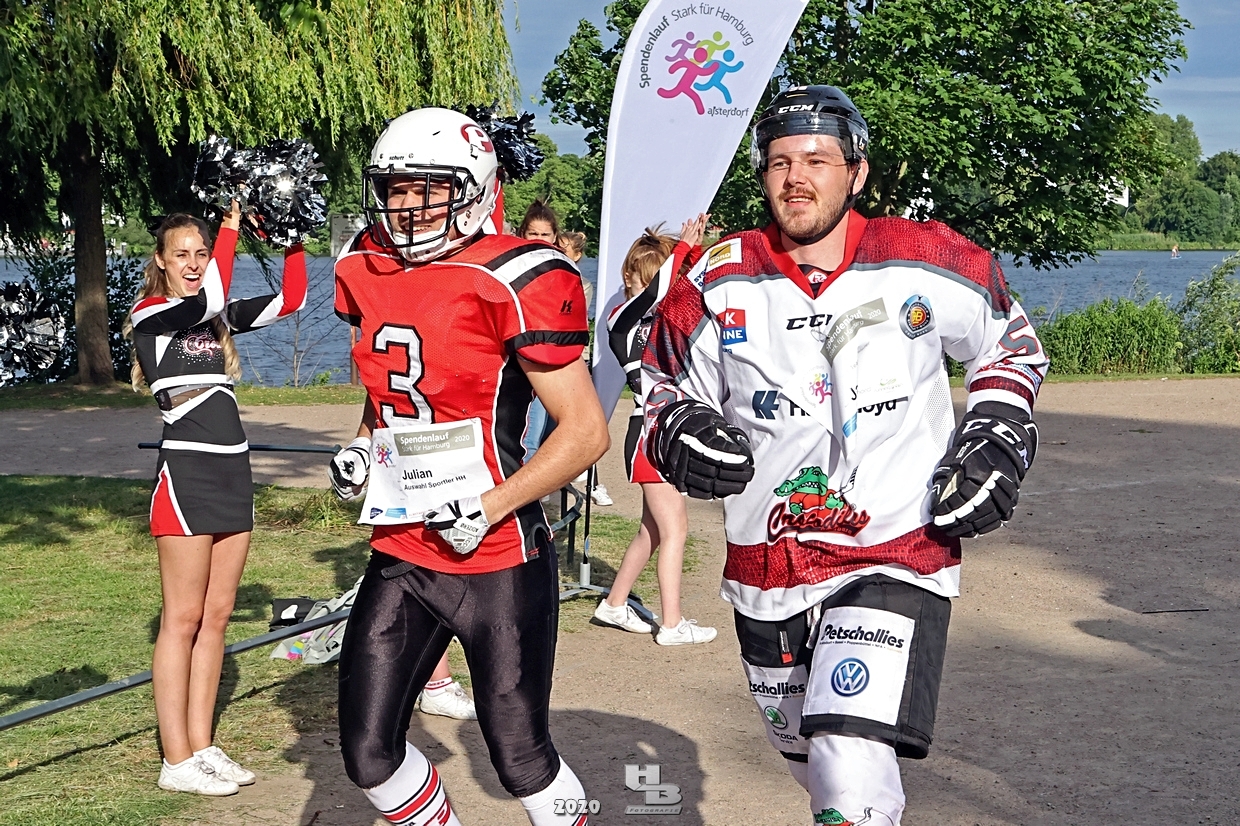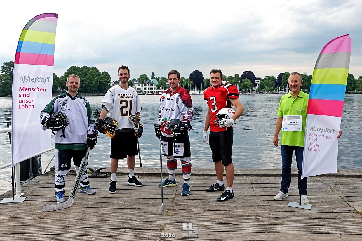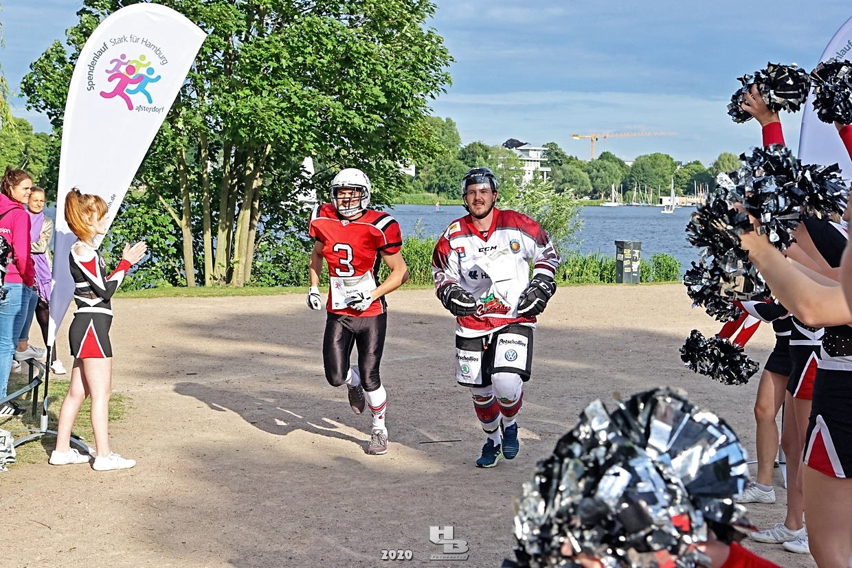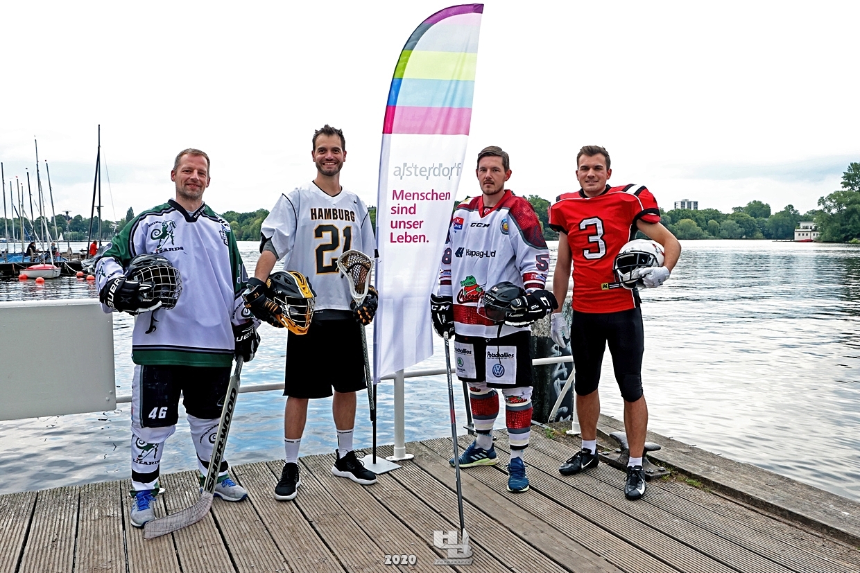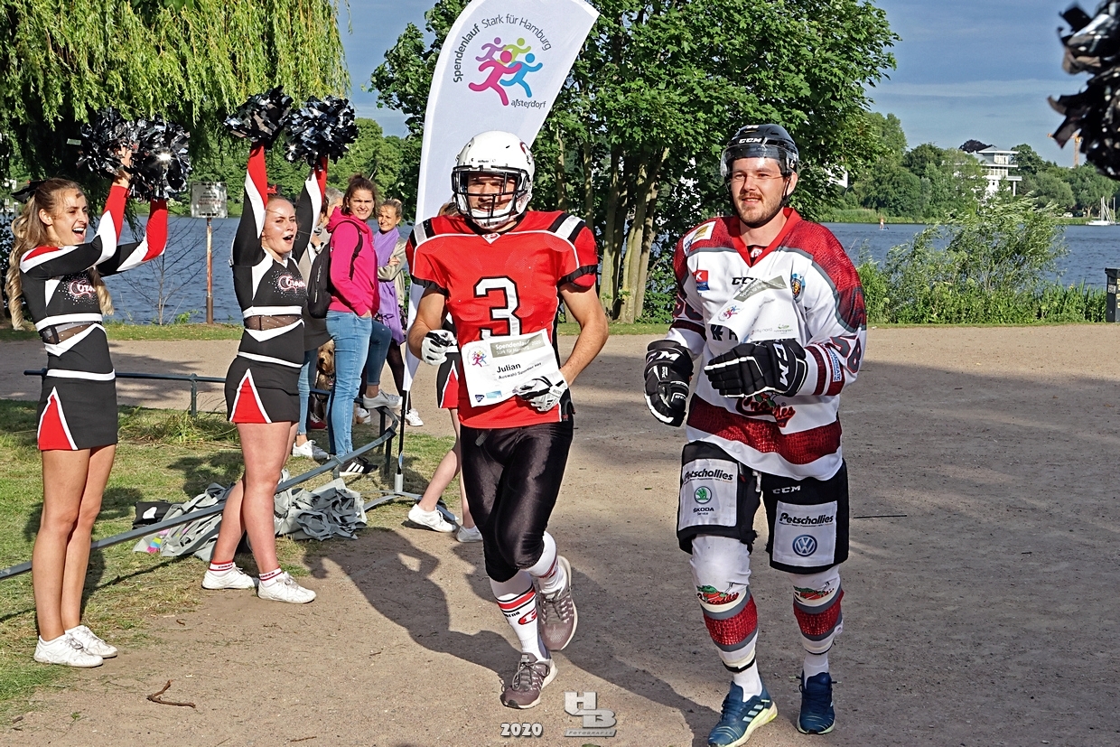 Dieses Team hatte sich einiges vorgenommen, denn es bestand nicht nur aus einem Mix verschiedener Hamburger Mannschaften: Jan Tramm von den Crocodiles Hamburg [Eishockey], Julian Hey von den Hamburg Pioneers [American Football], Marten Jäger von den Hamburg Warriors [Lacrosse] und Seedo Jansen von den Bergedorf Lizards [Inline-Skaterhockey]), nein man hatte sich auch noch vorgenommen in voller Ausrüstung (außer Schlittschuhe/Inline-Skates) die Runde um die Außenalster anzutreten. Am Start und Ziel sorgten zudem die Red Crown Cheerleader der Hamburg Pioneers für viel Spaß und Stimmung