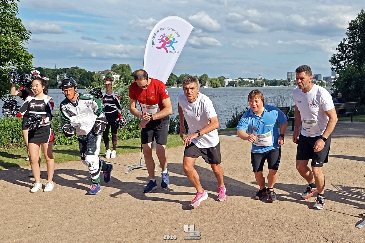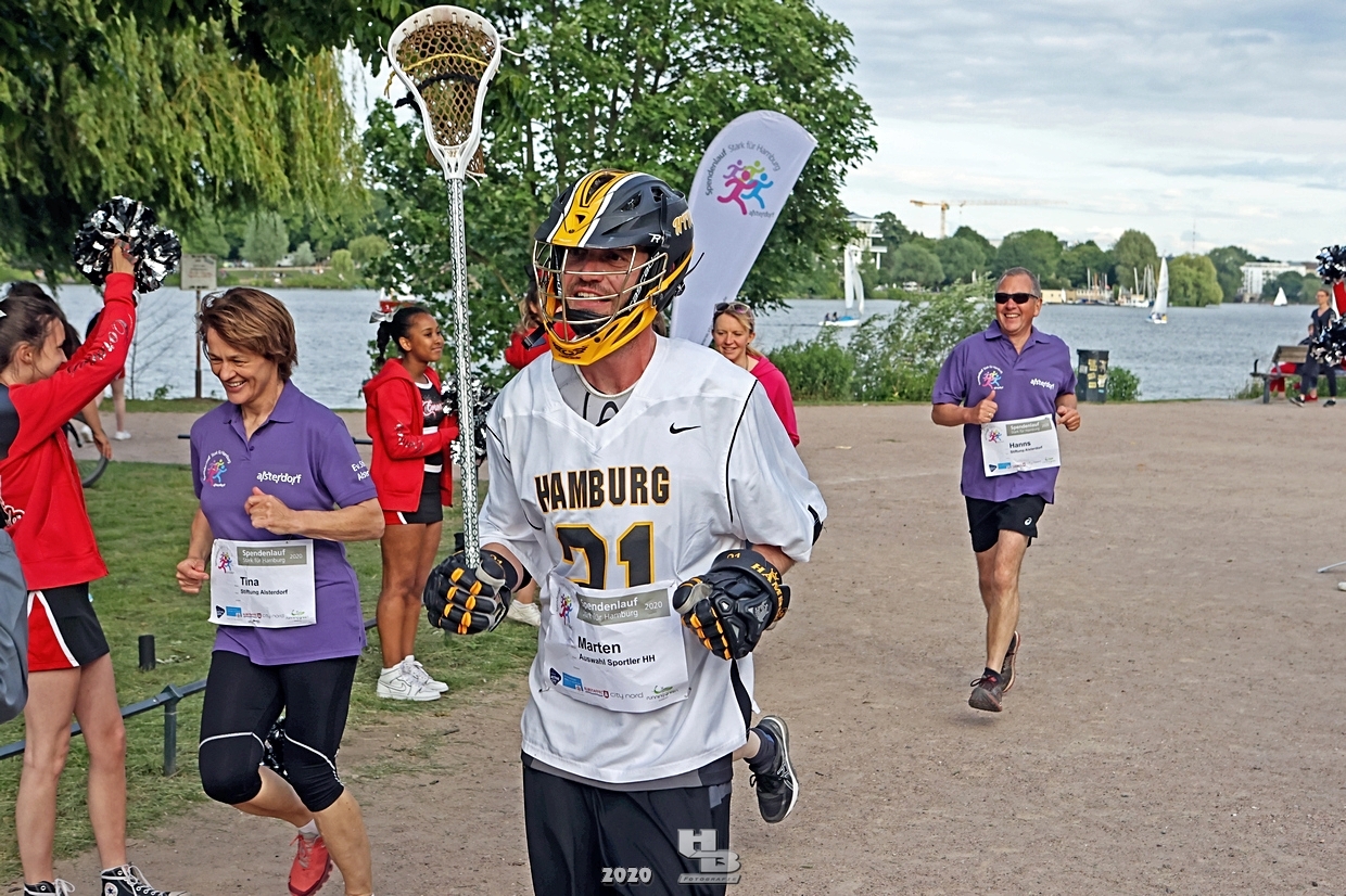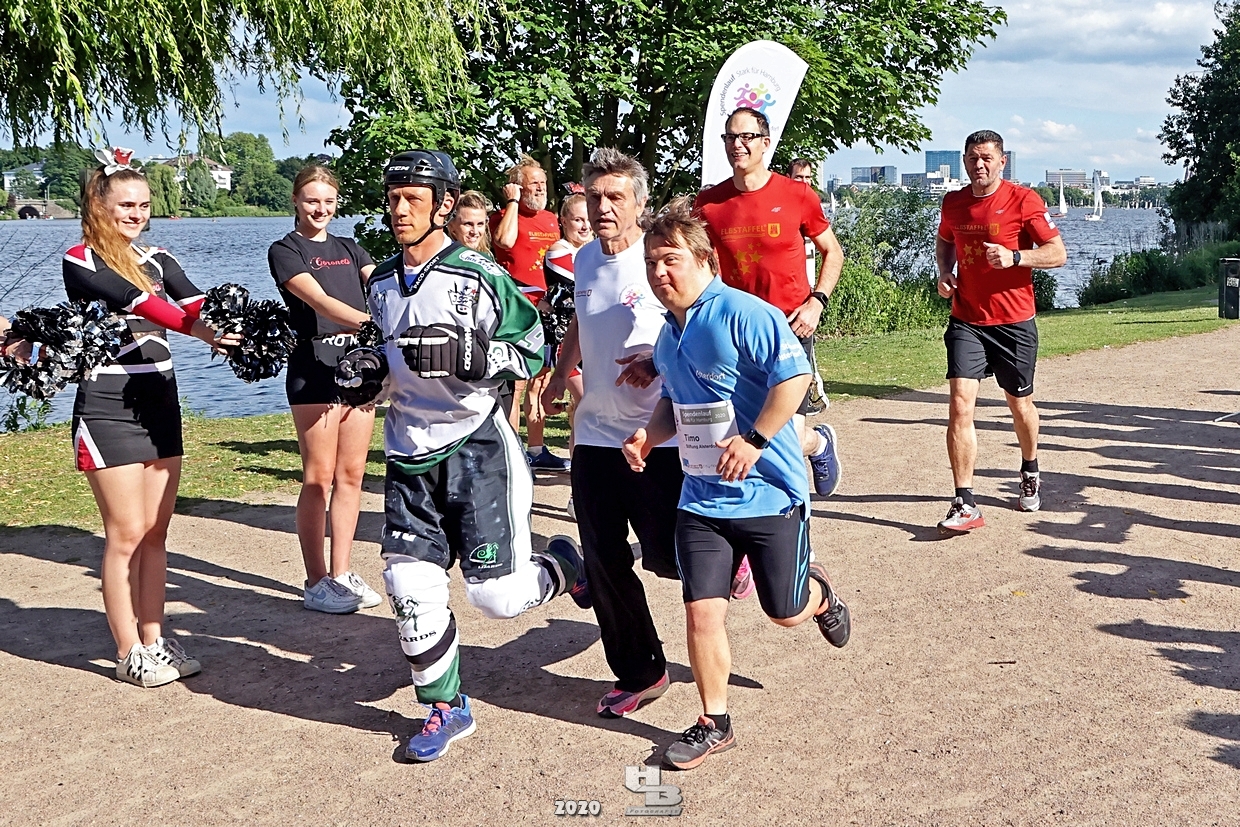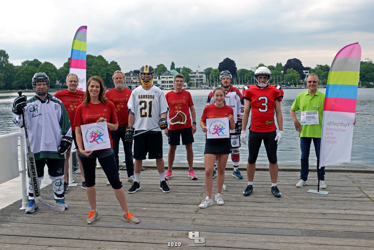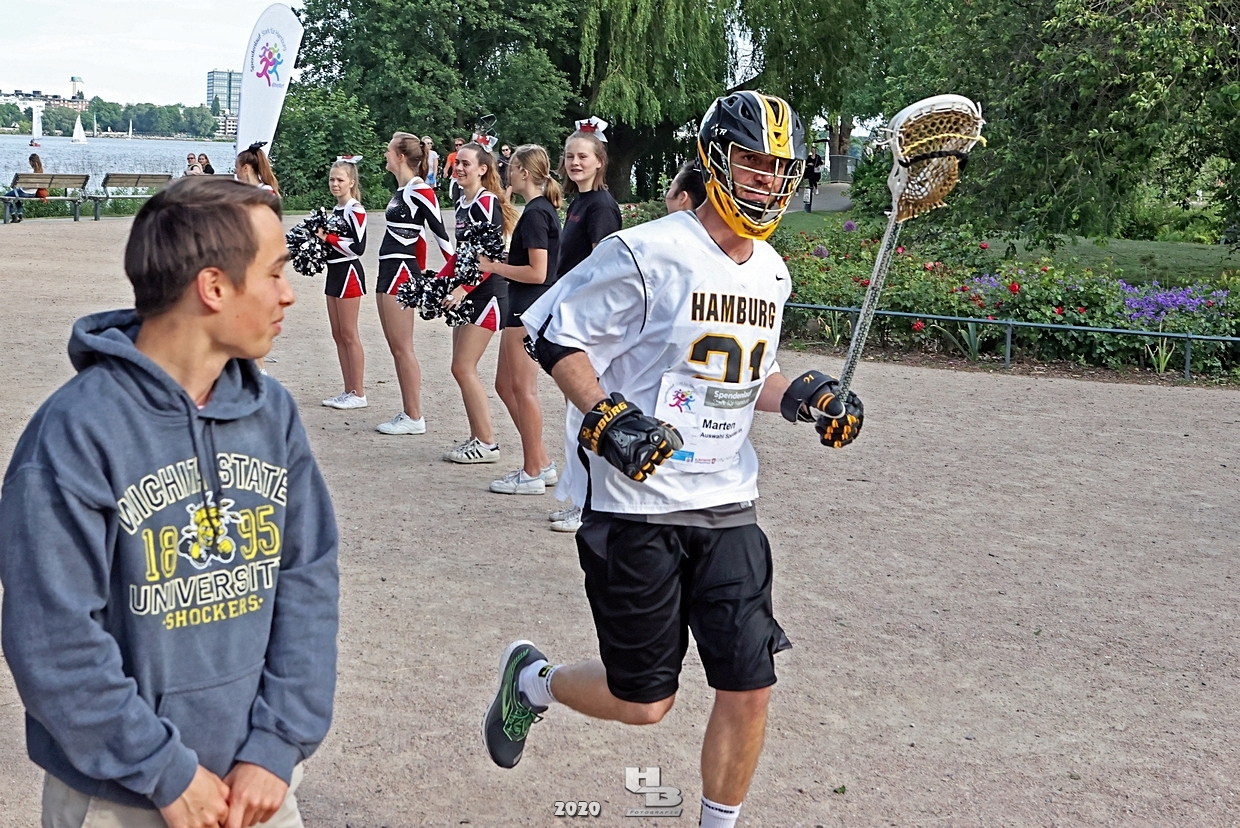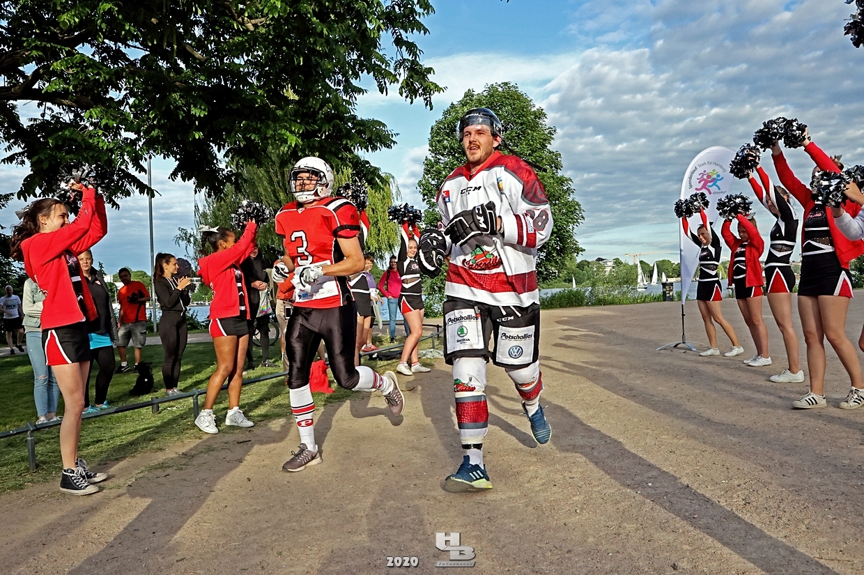 Dieses Team hatte sich einiges vorgenommen, denn es bestand nicht nur aus einem Mix verschiedener Hamburger Mannschaften: Jan Tramm von den Crocodiles Hamburg [Eishockey], Julian Hey von den Hamburg Pioneers [American Football], Marten Jäger von den Hamburg Warriors [Lacrosse] und Seedo Jansen von den Bergedorf Lizards [Inline-Skaterhockey]), nein man hatte sich auch noch vorgenommen in voller Ausrüstung (außer Schlittschuhe/Inline-Skates) die Runde um die Außenalster anzutreten. Am Start und Ziel sorgten zudem die Red Crown Cheerleader der Hamburg Pioneers für viel Spaß und Stimmung