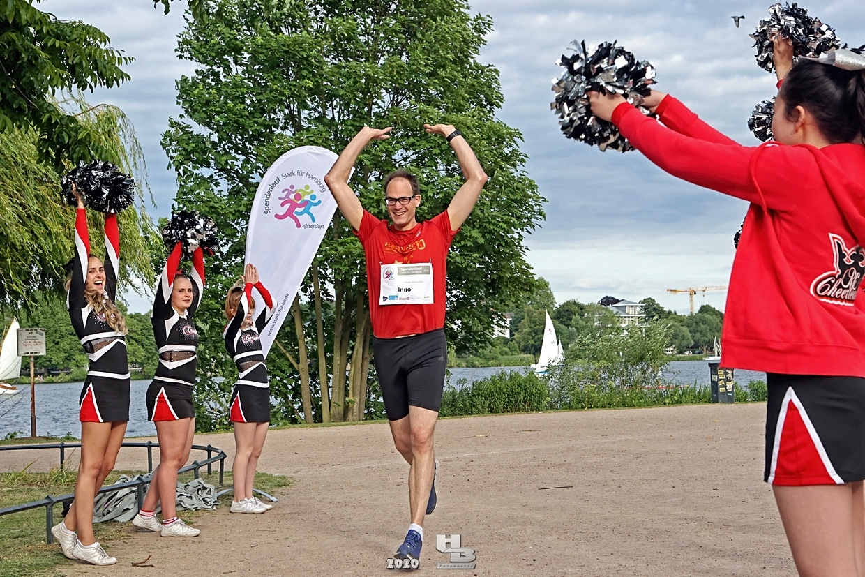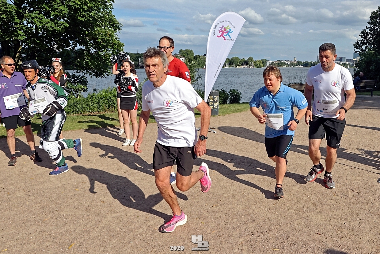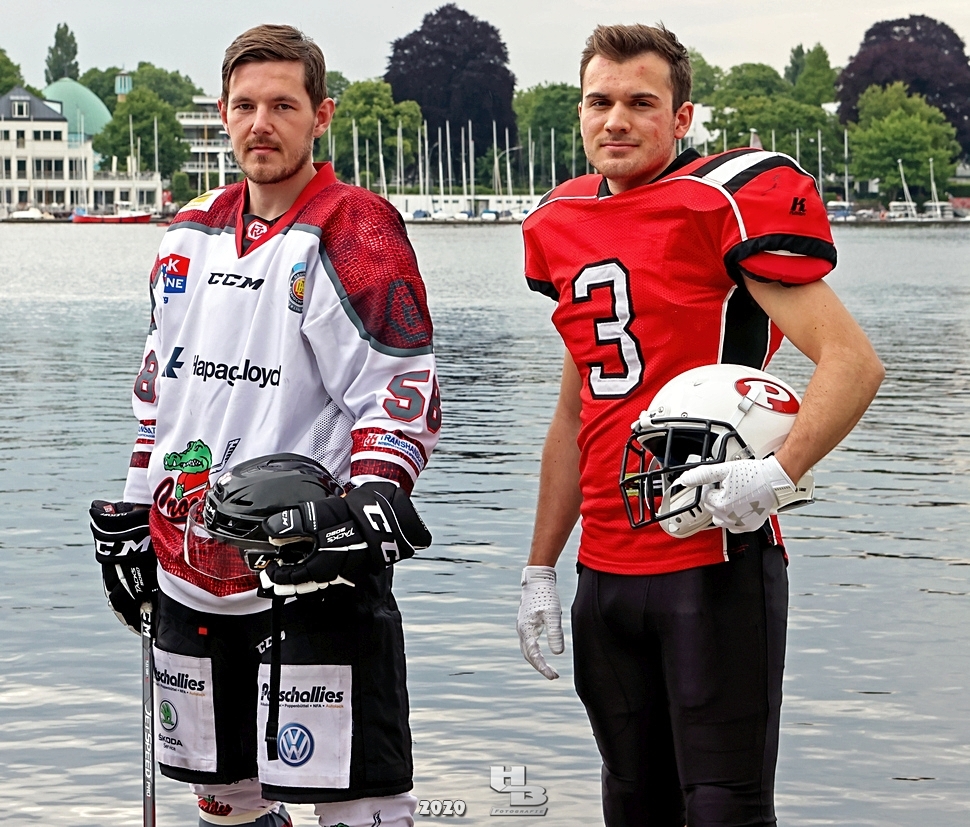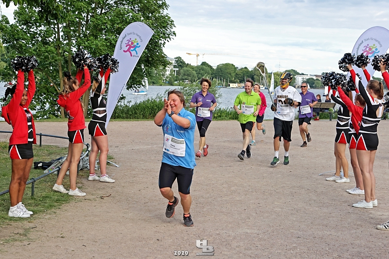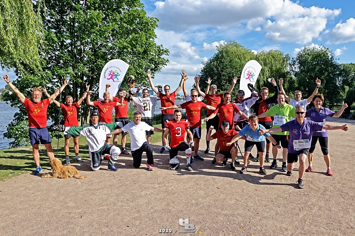 Dieses Team hatte sich einiges vorgenommen, denn es bestand nicht nur aus einem Mix verschiedener Hamburger Mannschaften: Jan Tramm von den Crocodiles Hamburg [Eishockey], Julian Hey von den Hamburg Pioneers [American Football], Marten Jäger von den Hamburg Warriors [Lacrosse] und Seedo Jansen von den Bergedorf Lizards [Inline-Skaterhockey]), nein man hatte sich auch noch vorgenommen in voller Ausrüstung (außer Schlittschuhe/Inline-Skates) die Runde um die Außenalster anzutreten. Am Start und Ziel sorgten zudem die Red Crown Cheerleader der Hamburg Pioneers für viel Spaß und Stimmung