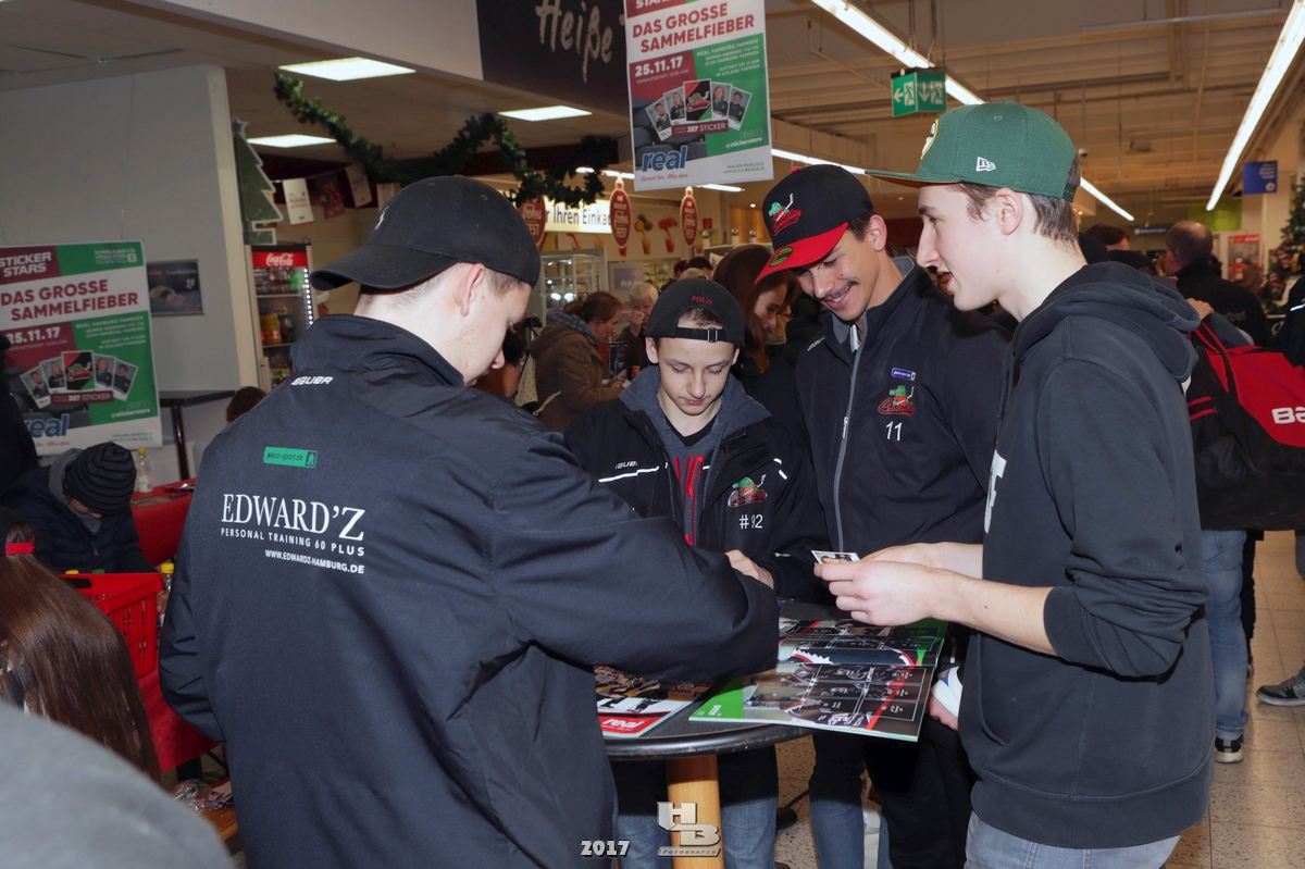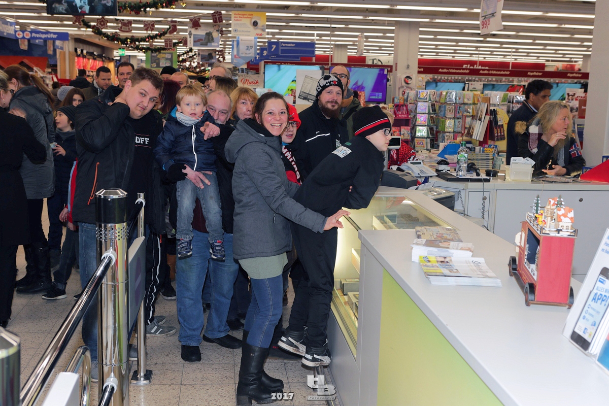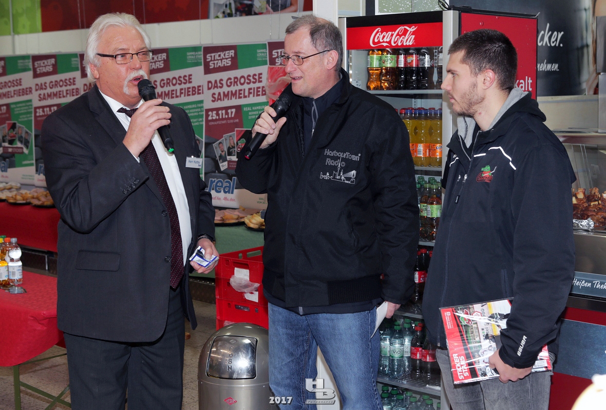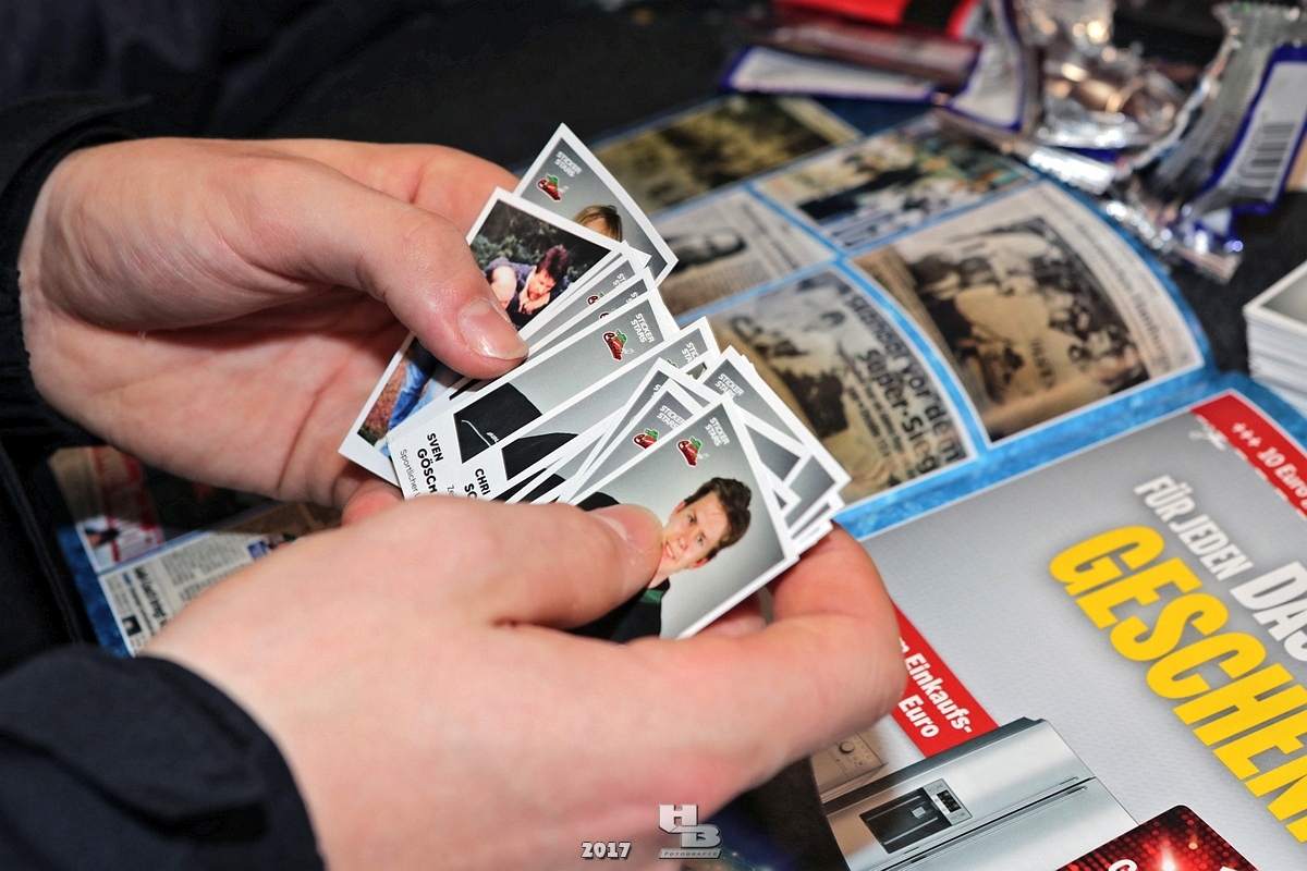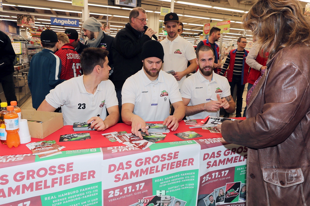 Und dann war es soweit, es ging von der Eishalle Farmsen in den real Markt im gegenüberliegenden Einkaufstreffpunkt Farmsen. Hier fiel um 12.00 Uhr der Startschuß und die ersten Alben konnten gekauft werden. Sofort nutzen viele diese Gelegenheit und kauften nicht nur Album und Sticker, sondern tauschten auch gleich vor Ort doppelte Sticker, wobei es interessant zu sehen war wie die Reaktion war wenn sich jemand selber in einer der Packungen gefunden hat.