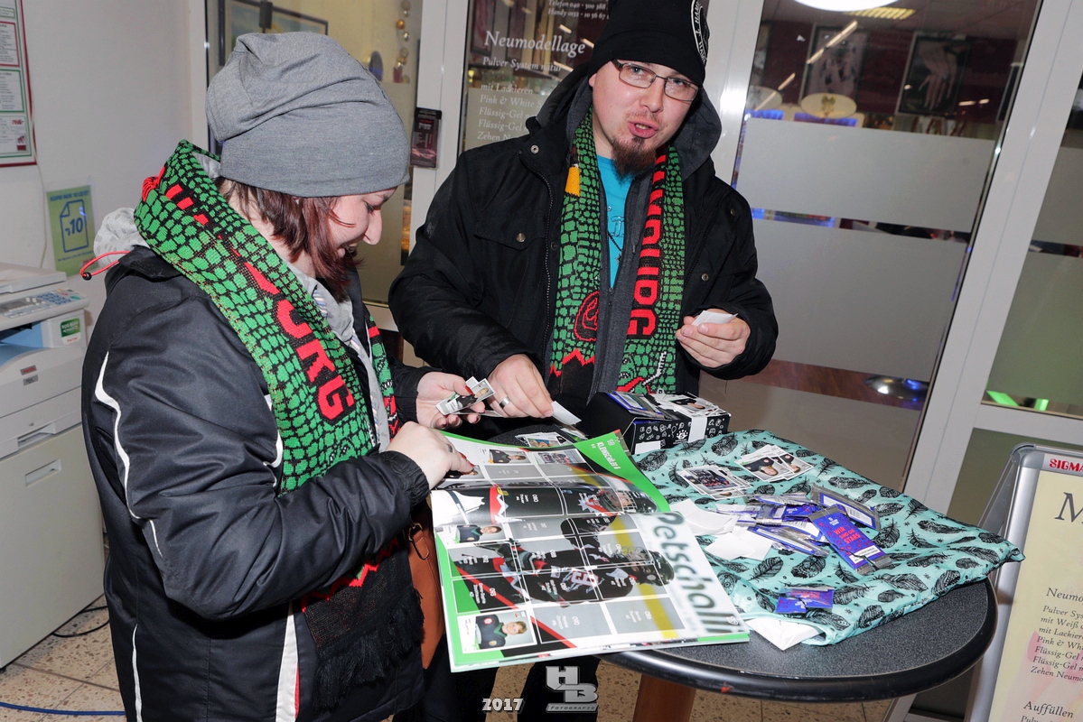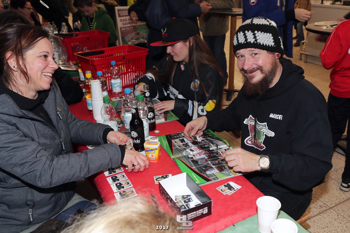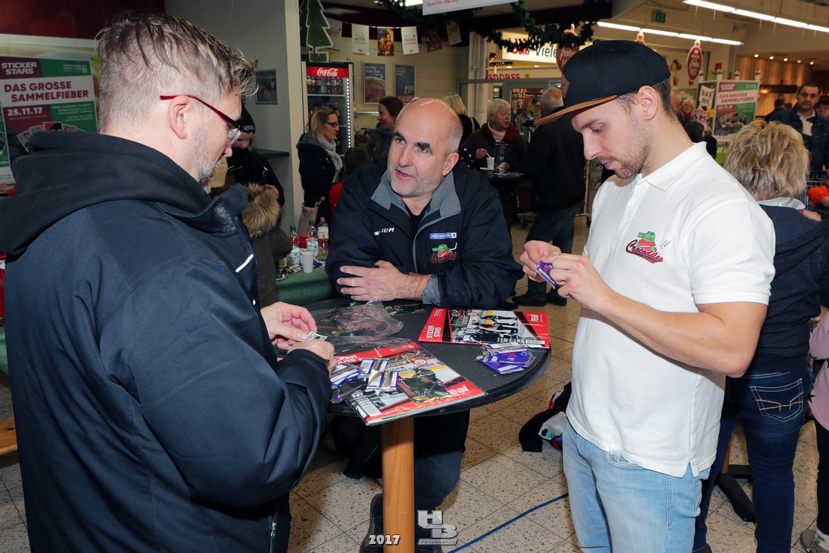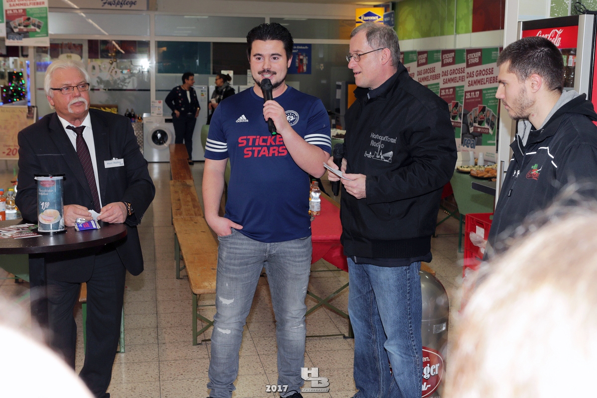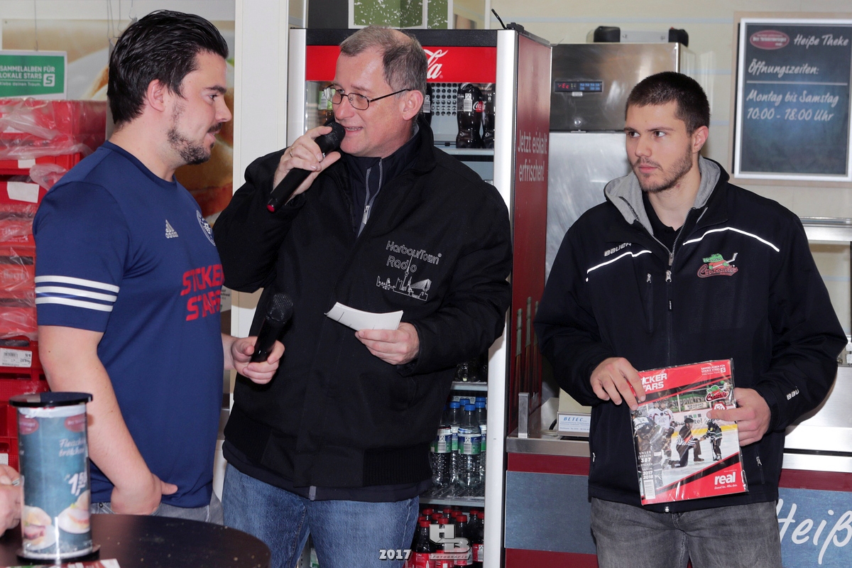 Und dann war es soweit, es ging von der Eishalle Farmsen in den real Markt im gegenüberliegenden Einkaufstreffpunkt Farmsen. Hier fiel um 12.00 Uhr der Startschuß und die ersten Alben konnten gekauft werden. Sofort nutzen viele diese Gelegenheit und kauften nicht nur Album und Sticker, sondern tauschten auch gleich vor Ort doppelte Sticker, wobei es interessant zu sehen war wie die Reaktion war wenn sich jemand selber in einer der Packungen gefunden hat.