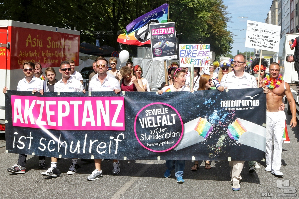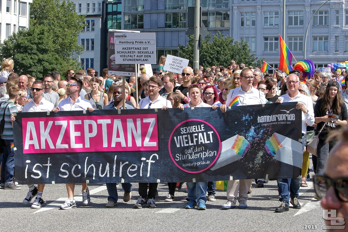 Unter dem Motto "Akzeptanz ist schulreif: Sexuelle Vielfalt auf den Stundenplan" fand in Hamburg am 01.08.2015 bei besten Wetter die 35. CSD-Parade statt.