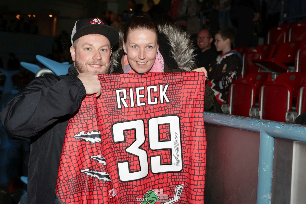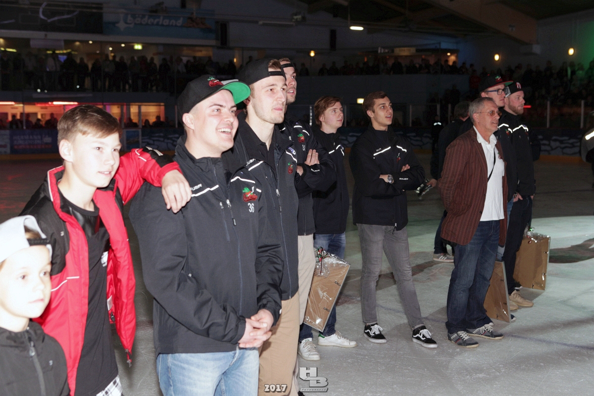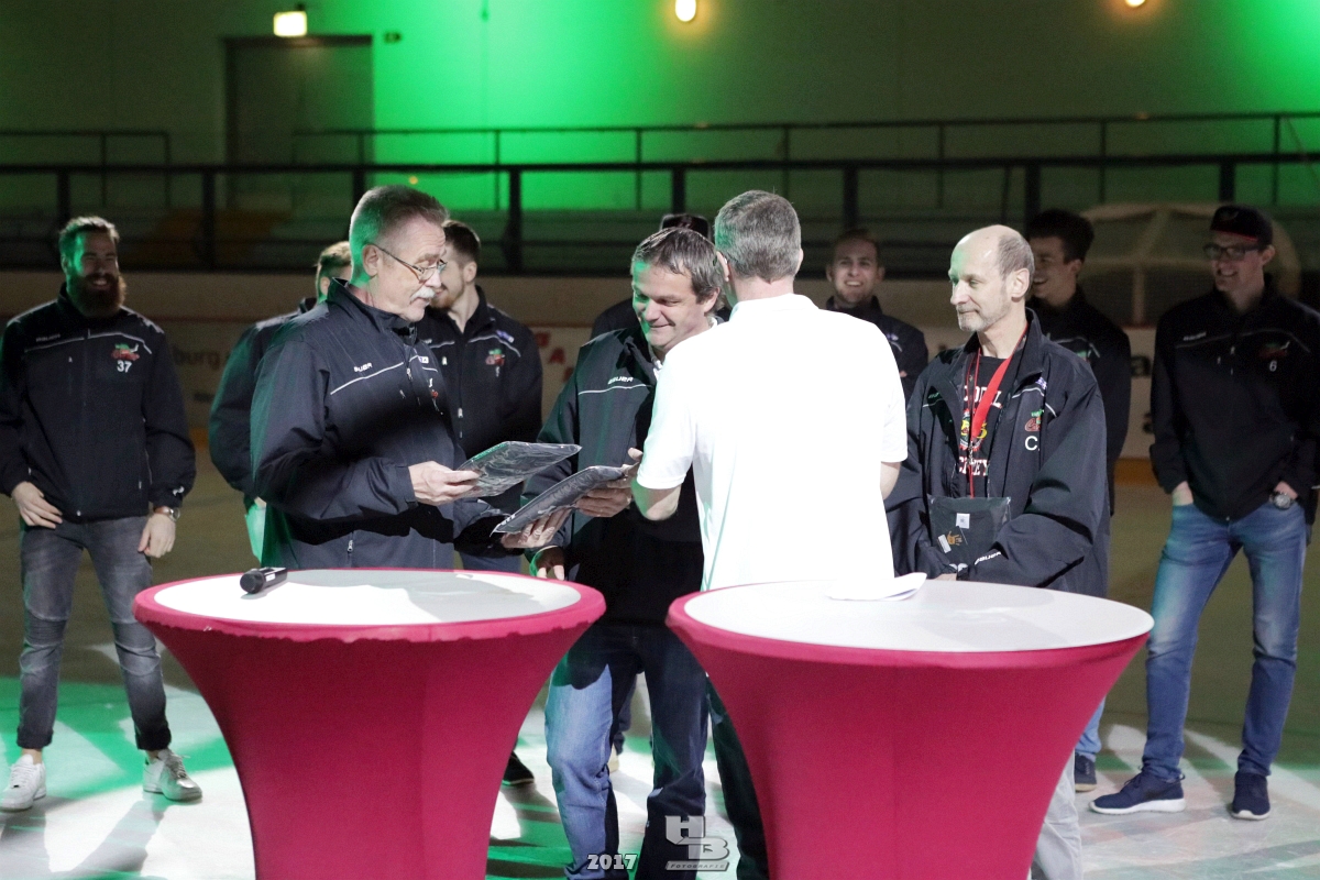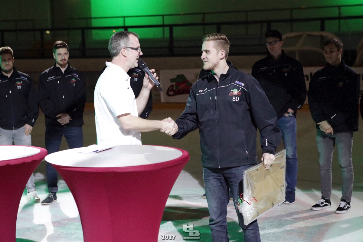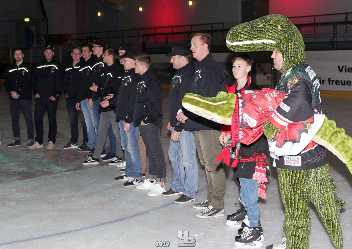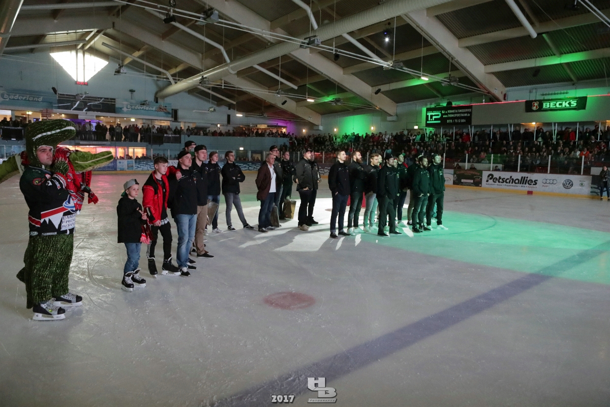Über 500 Fans folgten der Einladung und verabschiedeten das Team in die Sommerpause. Hierfür wurde jeder Spieler nacheinander unter dem Applaus der Fans auf die Eisfläche gebeten bis das Team komplett war. Es folgten der Trainer und die Betreuer. Nachdem Carl-Heinz Götz vom Förderverein der Crocodiles und Kapitän Christoph Schubert sich beim Team und den Fans bedankt haben stand leider ein trauriger Teil auf dem Plan. Sven Gösch verabschiedete fünf Spieler der Crocodiles die in der nächsten Saison leider nicht mehr dabei sein werden. Im einzelnen waren es #80 Elmar Trautmann, #86 Pierre Kracht, #45 Tom Kluvetasch, #6 Timo Gless und #49 Gino Blank. Von meiner Seite wünsche ich alles Gute und besonderen Dank an Euch das Ihr mitgeholfen habt hier so erfolgreich zu sein. Ich werde Euch hier bei den Crocodiles sicher vermissen.
