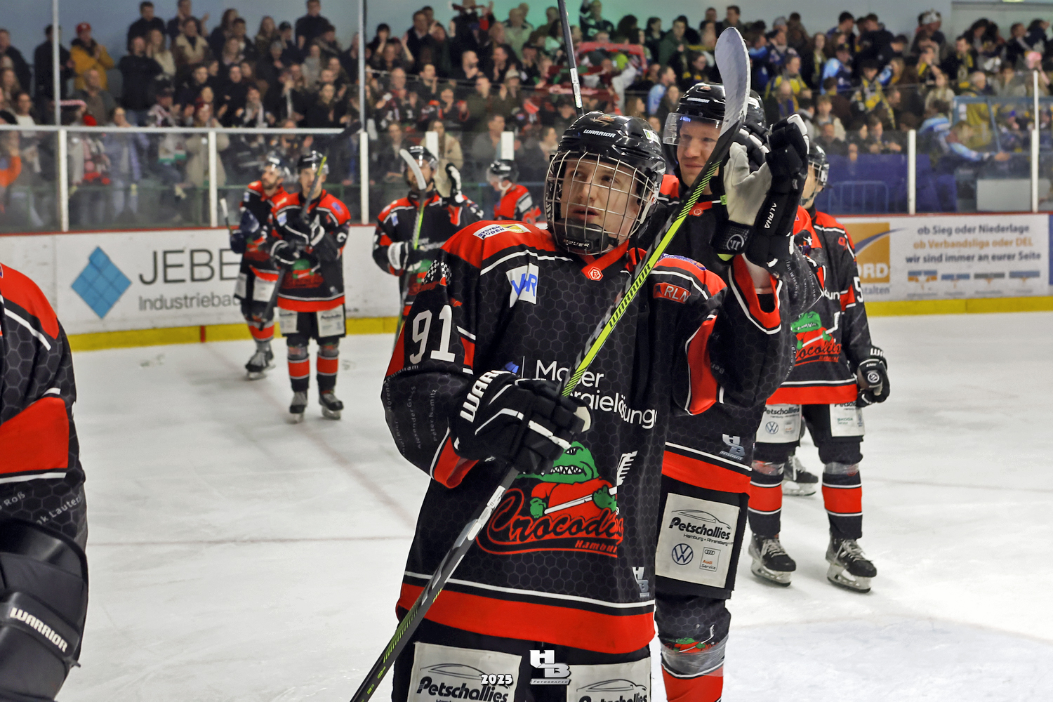 Im Schlussdrittel blieb das Spiel weiter temporeich. Die Crocodiles nutzten ihre Chancen konsequent: Ivan Savchenko erhöhte auf 3:1 und sorgte für etwas Ruhe. In der Schlussphase setzte der HSV alles auf eine Karte, nahm den Torhüter vom Eis – doch erneut war es Filip Kriz, der den Puck ins leere Tor beförderte und mit seinem zweiten Treffer des Abends den 4:1-Endstand besiegelte.