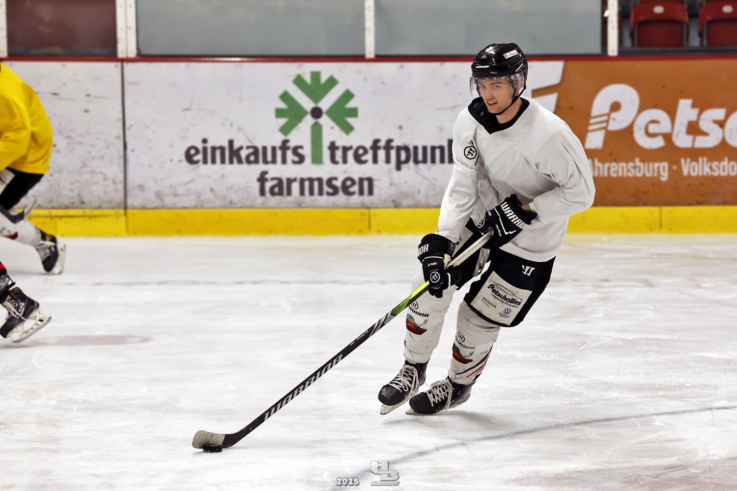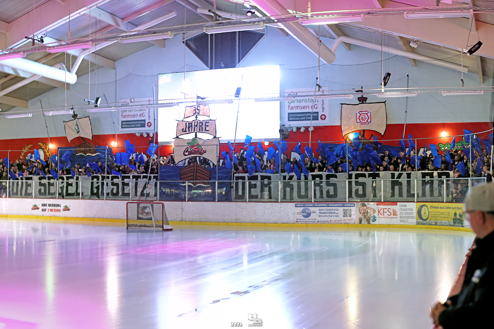 Doch zurück zum Freitagabend. Für Adendorf hieß es Vollgas oder Sommerpause. Vor erneut ausverkauftem Haus im Eisland Farmsen erwartete die Fans wieder ein spektakuläres Spiel. Schon vor Spielbeginn zeigten beide Fanlager, warum dieser Sport so großartig ist. Mit lautstarken Fangesängen auf beiden Seiten wurde versucht, die Fans mitzureißen.
