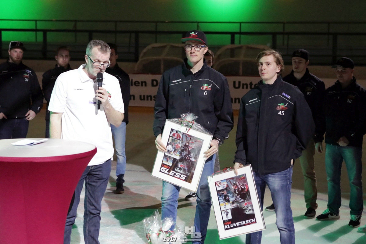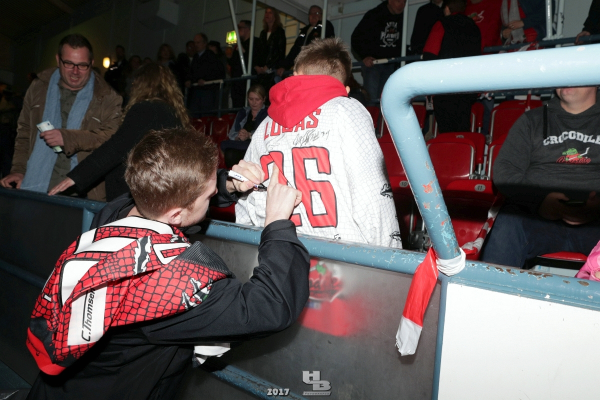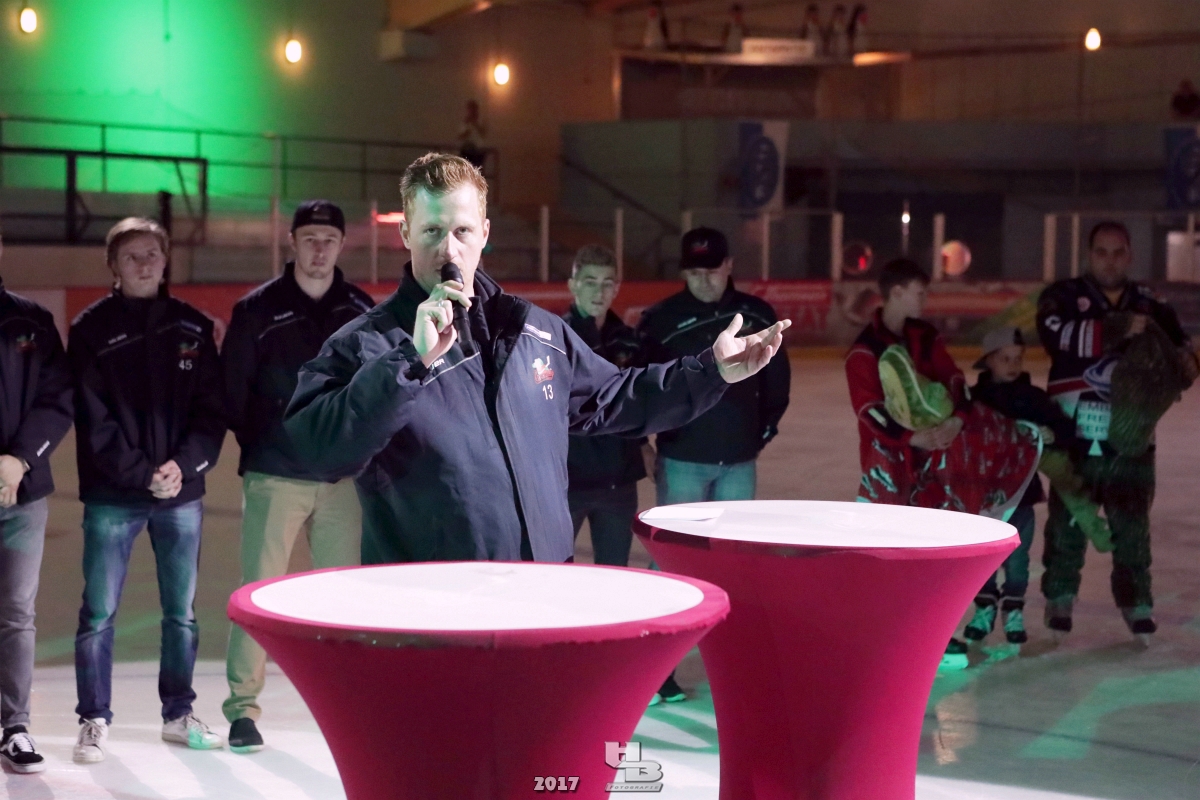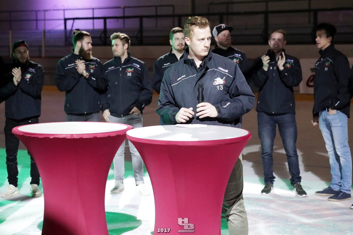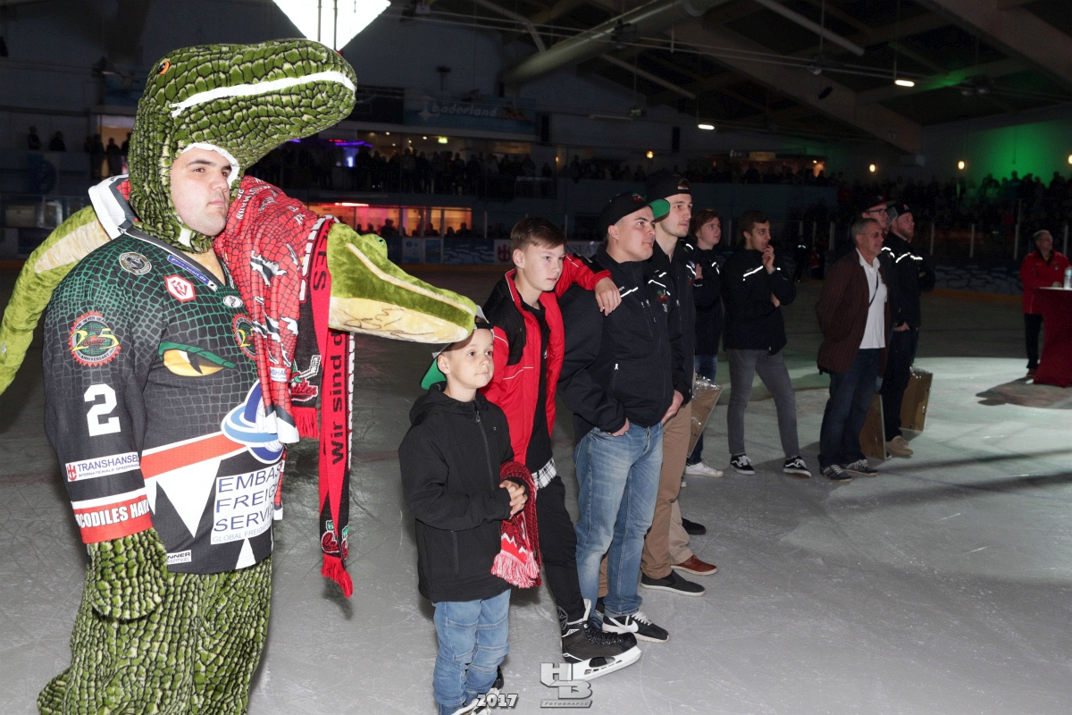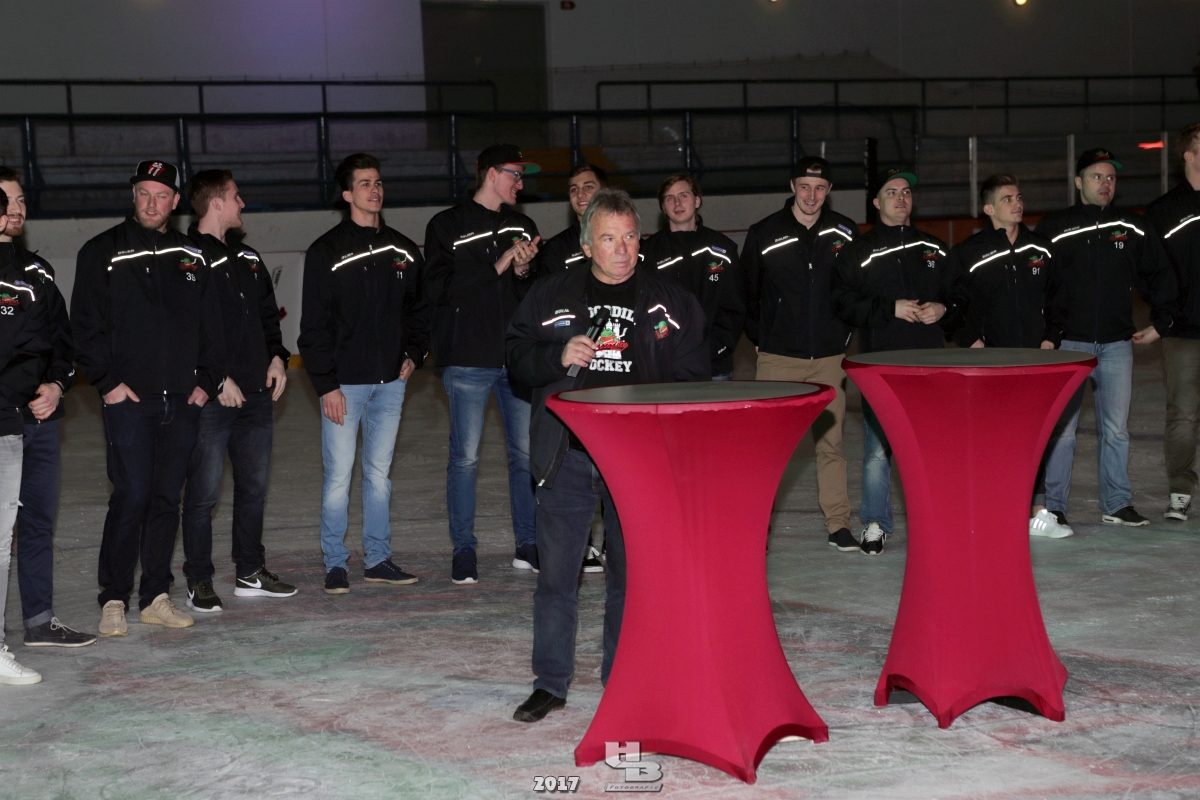 Über 500 Fans folgten der Einladung und verabschiedeten das Team in die Sommerpause. Hierfür wurde jeder Spieler nacheinander unter dem Applaus der Fans auf die Eisfläche gebeten bis das Team komplett war. Es folgten der Trainer und die Betreuer. Nachdem Carl-Heinz Götz vom Förderverein der Crocodiles und Kapitän Christoph Schubert sich beim Team und den Fans bedankt haben stand leider ein trauriger Teil auf dem Plan. Sven Gösch verabschiedete fünf Spieler der Crocodiles die in der nächsten Saison leider nicht mehr dabei sein werden. Im einzelnen waren es #80 Elmar Trautmann, #86 Pierre Kracht, #45 Tom Kluvetasch, #6 Timo Gless und #49 Gino Blank. Von meiner Seite wünsche ich alles Gute und besonderen Dank an Euch das Ihr mitgeholfen habt hier so erfolgreich zu sein. Ich werde Euch hier bei den Crocodiles sicher vermissen.