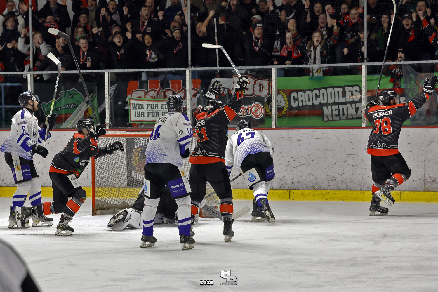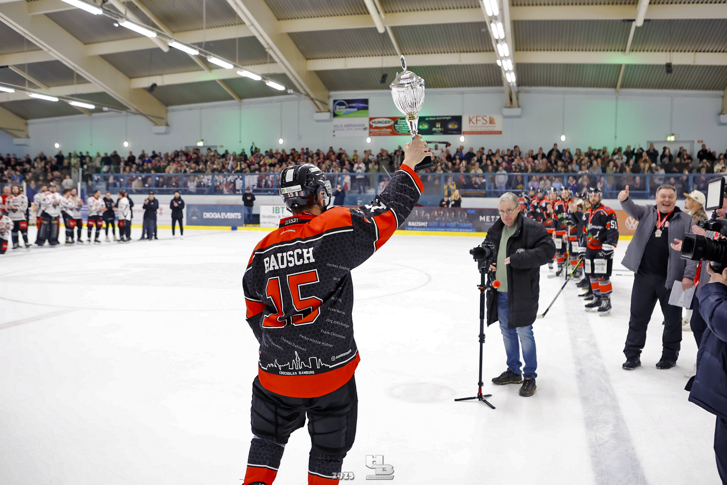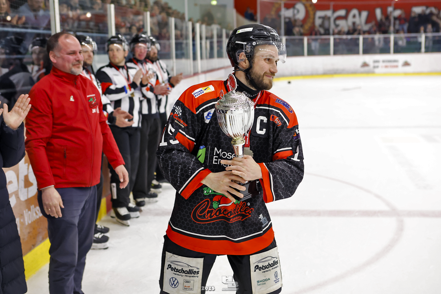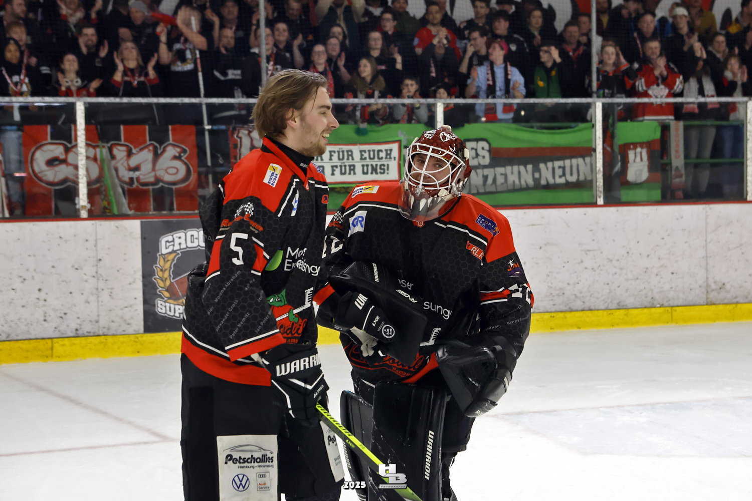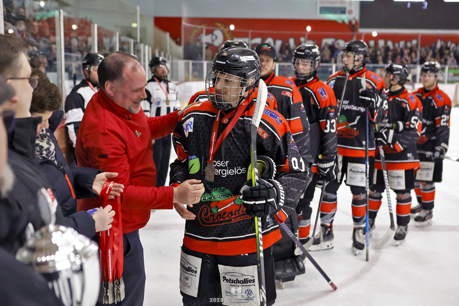 Am Sonntag, den 17.03.2025, kam es nach dem ersten Spiel am 15.03.2025. zum Rückspiel im Finale (best of 5) zwischen den Crocodiles Hamburg und den Harzer Falken. Im ausverkauften Eisland Farmsen, vor erneut 1955 Zuschauern, erwartete die Fans ein wahres Spektakel. Die Crocodiles wollten die Gunst der Stunde nutzen und starteten direkt mit einem Tor von der blauen Linie durch Miguel Boock zum 1:0 für die Crocodiles. Die Freude auf Seiten der Crocodiles währte nicht lange, denn keine 4 Minuten später war es Tretjakovs, der für die Falken zum 1:1 ausgleichen konnte. Mit diesem Spielstand ging es in die erste Pause des Abends. Im 2. Drittel war es dann Leo Prüßner, welcher für die Crocodiles einnetzen konnte. Kurz vor Ende des 2. Drittels konnten die Falken allerdings erneut ausgleichen. Zu Beginn des 3. Drittel, nach gerade einmal 14 Sekunden, klingelte es direkt im Tor der Crocodiles. Die Falken führten nun 3:2.