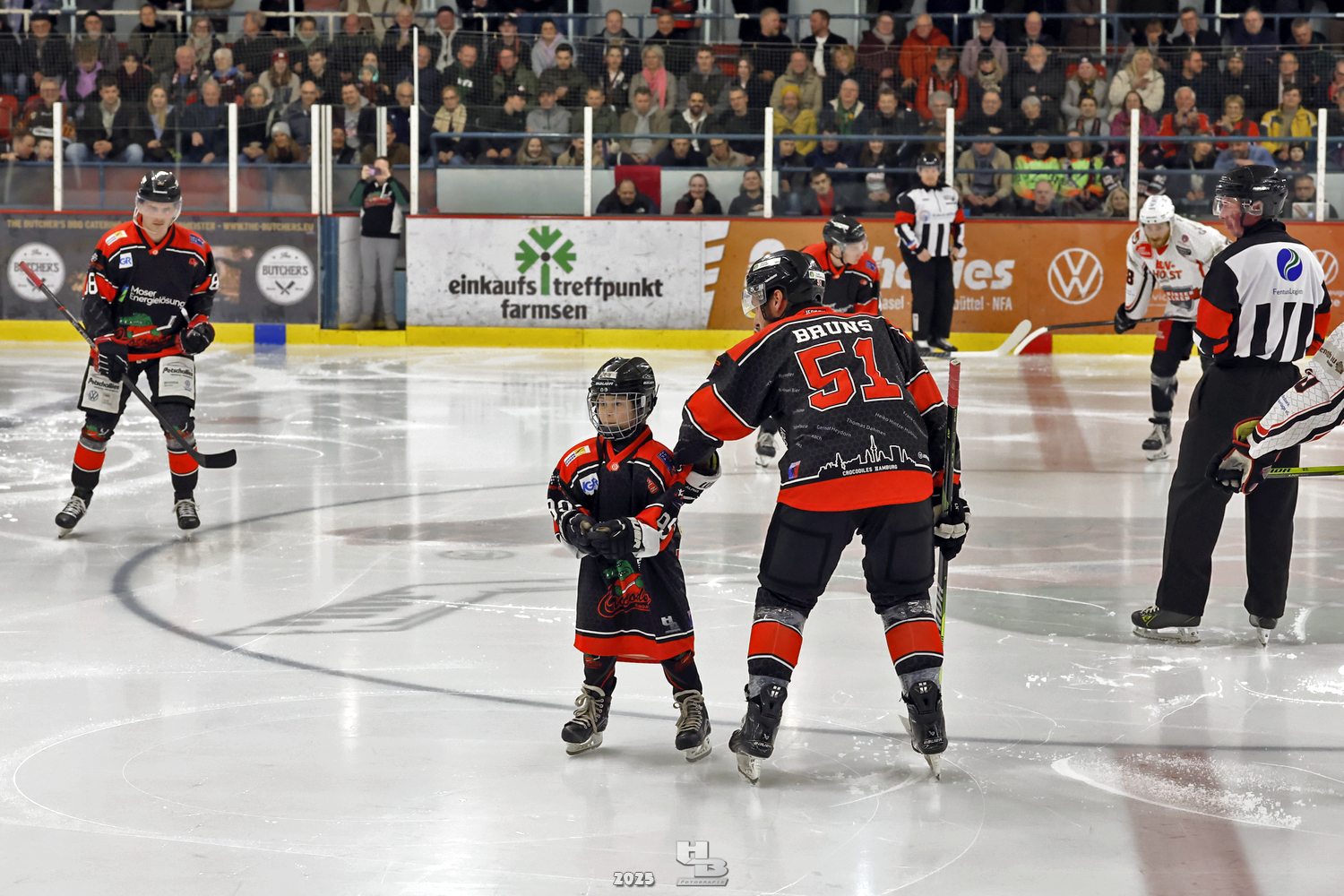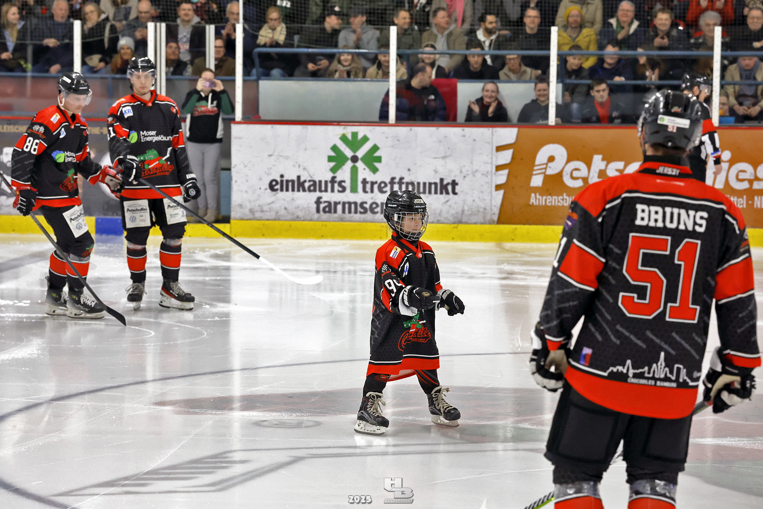 Doch zurück zum Freitagabend. Für Adendorf hieß es Vollgas oder Sommerpause. Vor erneut ausverkauftem Haus im Eisland Farmsen erwartete die Fans wieder ein spektakuläres Spiel. Schon vor Spielbeginn zeigten beide Fanlager, warum dieser Sport so großartig ist. Mit lautstarken Fangesängen auf beiden Seiten wurde versucht, die Fans mitzureißen.