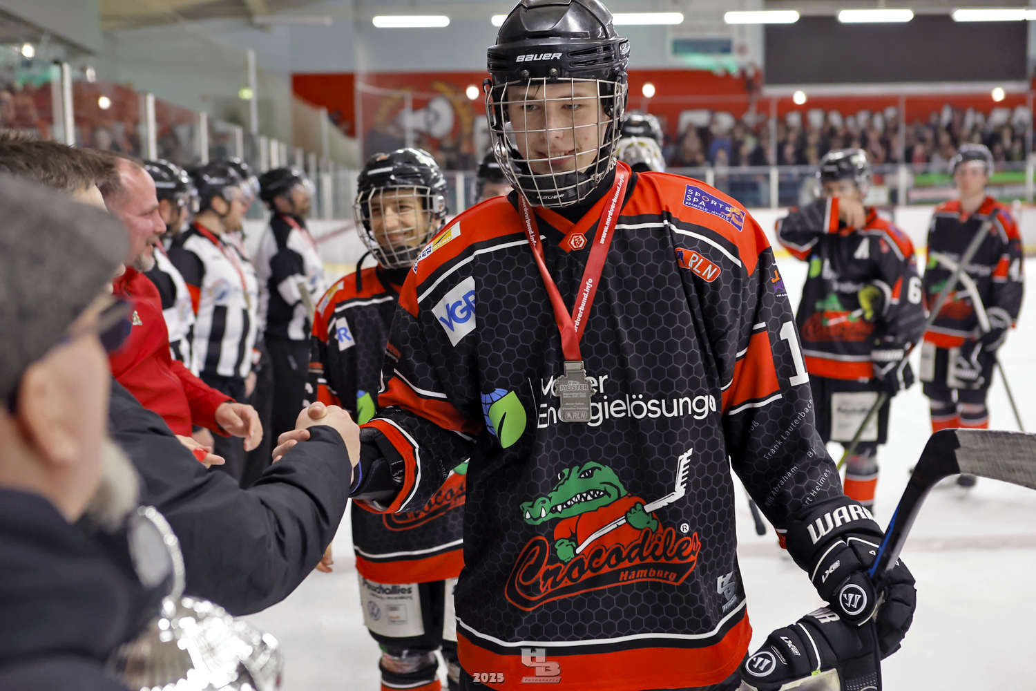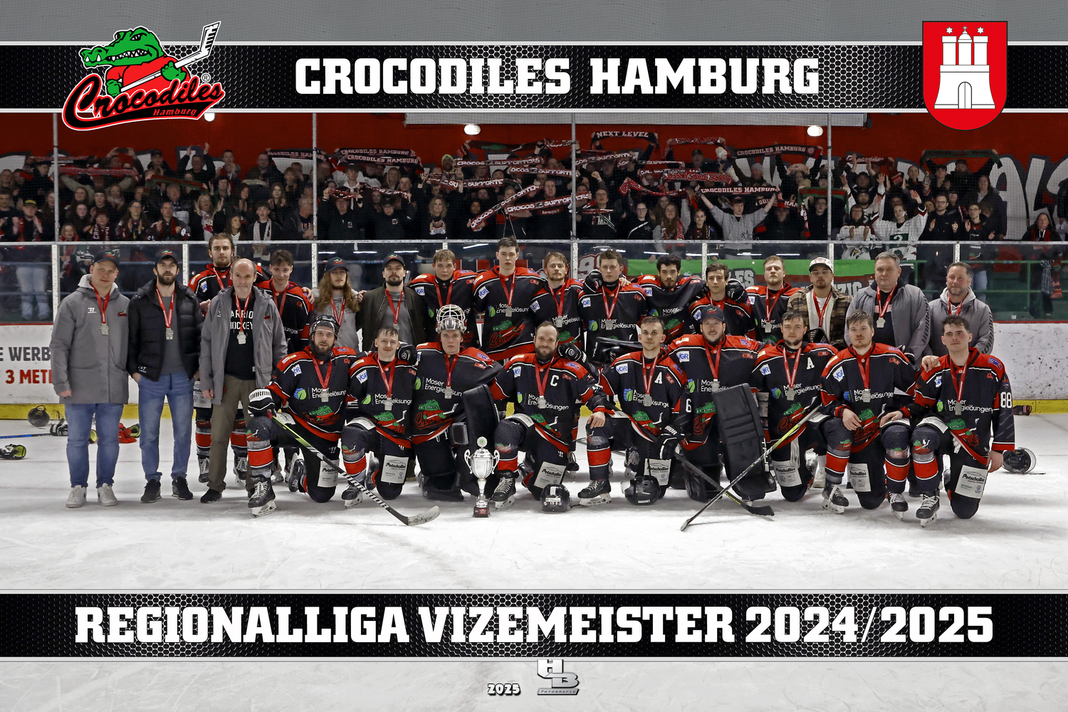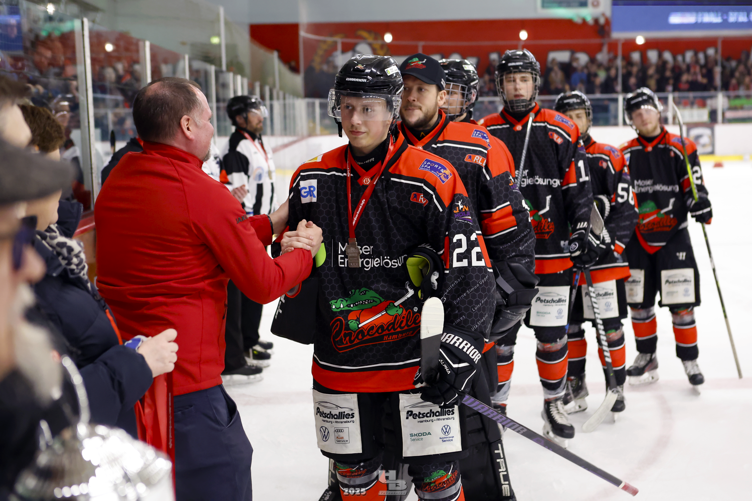 Am 23. März 2025 fand im Eisland Farmsen in Hamburg das vierte und entscheidende Spiel der „best of 5“-Finalserie zwischen den Crocodiles Hamburg und den Harzer Falken statt. Vor ausverkaufter Kulisse mit 1.955 begeisterten Zuschauern erlebten die Fans ein spannendes Duell, das die Falken letztendlich mit 3:1 für sich entscheiden konnten und sich somit den Meistertitel in der Regionalliga Nord sicherten. Die Crocodiles dürfen sich hingegen über den Vizemeistertitel freuen – ein großartiger Erfolg für den Aufsteiger!