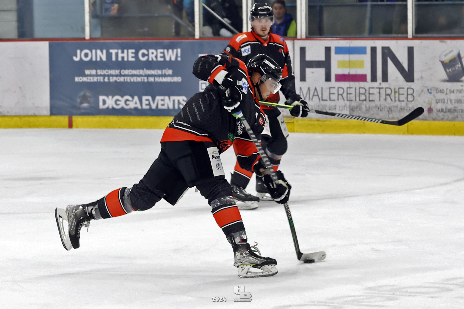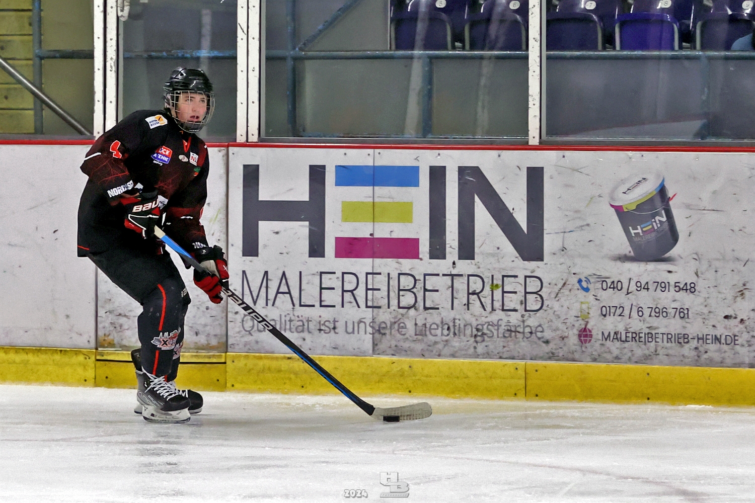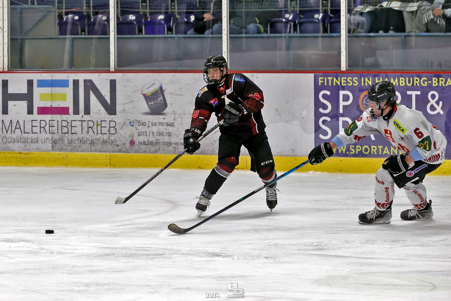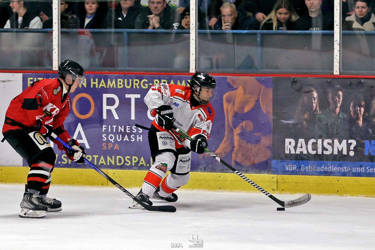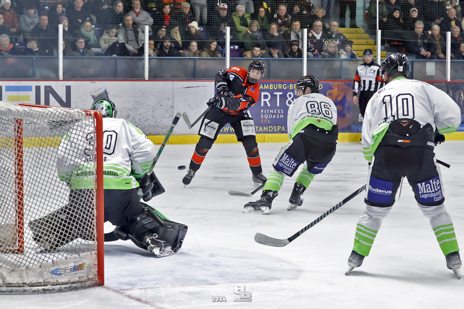 Von Beginn an war die Mannschaft hochkonzentriert und wollte an den Erfolg in Adendorf anknüpfen und den Anschluss in der Tabelle halten und sogar Plätze gut machen. Nach nicht einmal 3 Minuten im 1. Drittel klingelte es bereits im Kasten der Harsefeld Tigers. Torschütze war Luke Külbel auf Vorlage von Lenny Reik. In der 6. Minute musste dann der in Hamburg bestens bekannte Rasid Saitov, der vom HSV nach Harsefeld gewechselt ist, auf die Strafbank. Nach kurzem Abtasten war es dann Timi Liivalathi, der auf Vorlage von Matej Morong auf 2:0 erhöhen konnte. Mit dieser Führung ging es dann auch in die 1. Pause.