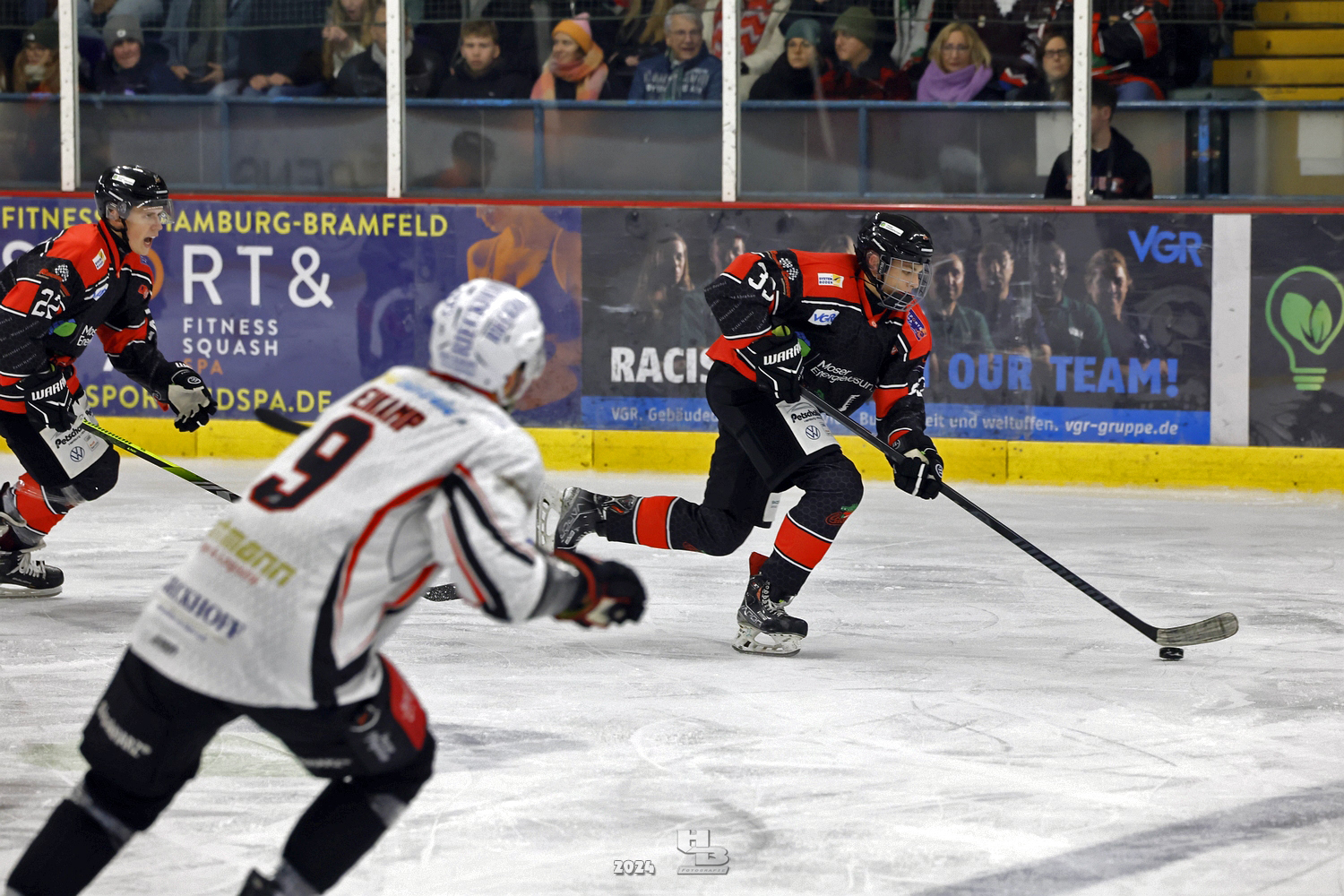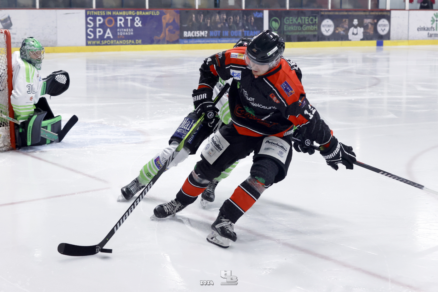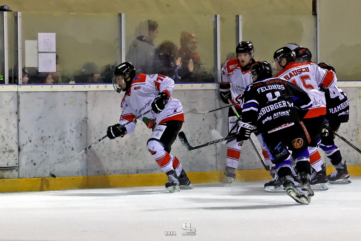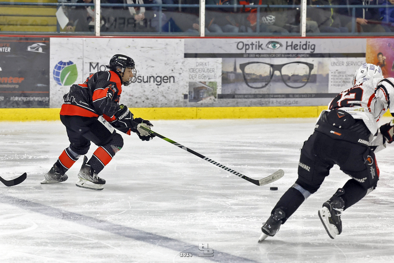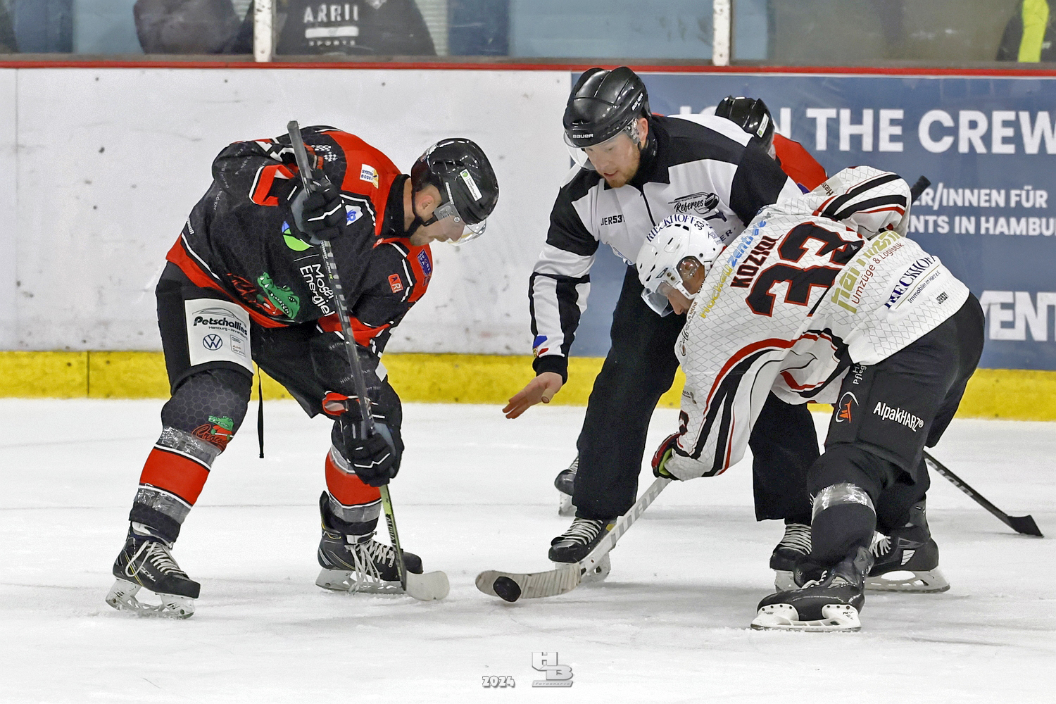 Von Beginn an war die Mannschaft hochkonzentriert und wollte an den Erfolg in Adendorf anknüpfen und den Anschluss in der Tabelle halten und sogar Plätze gut machen. Nach nicht einmal 3 Minuten im 1. Drittel klingelte es bereits im Kasten der Harsefeld Tigers. Torschütze war Luke Külbel auf Vorlage von Lenny Reik. In der 6. Minute musste dann der in Hamburg bestens bekannte Rasid Saitov, der vom HSV nach Harsefeld gewechselt ist, auf die Strafbank. Nach kurzem Abtasten war es dann Timi Liivalathi, der auf Vorlage von Matej Morong auf 2:0 erhöhen konnte. Mit dieser Führung ging es dann auch in die 1. Pause.