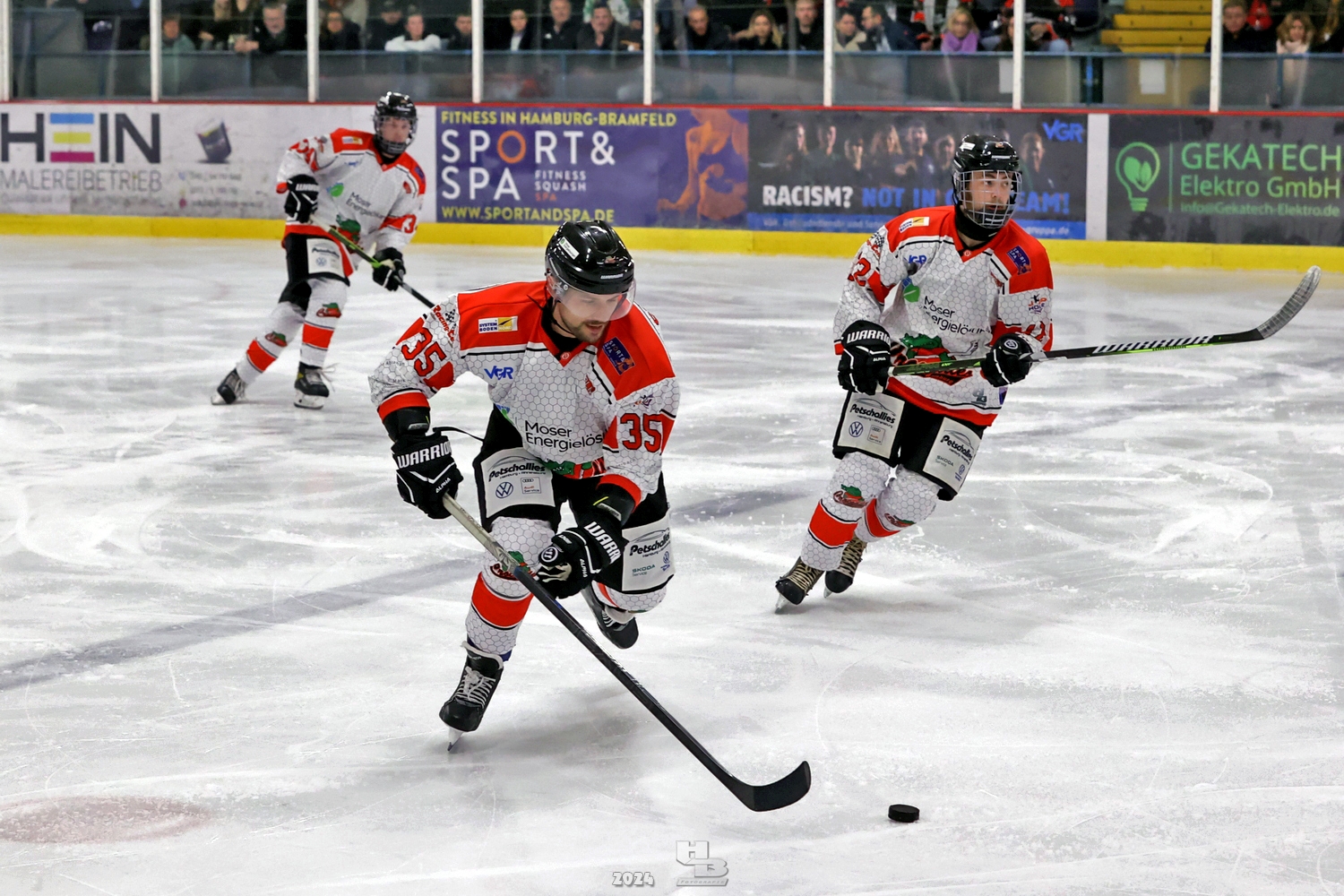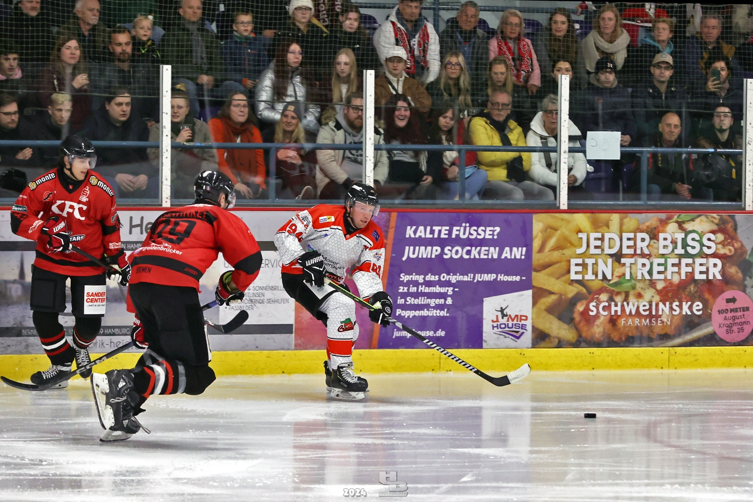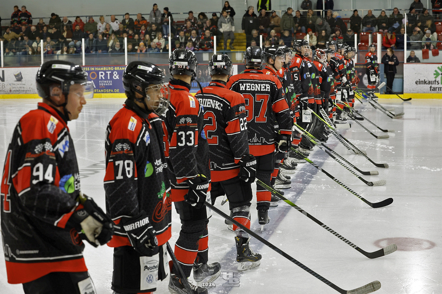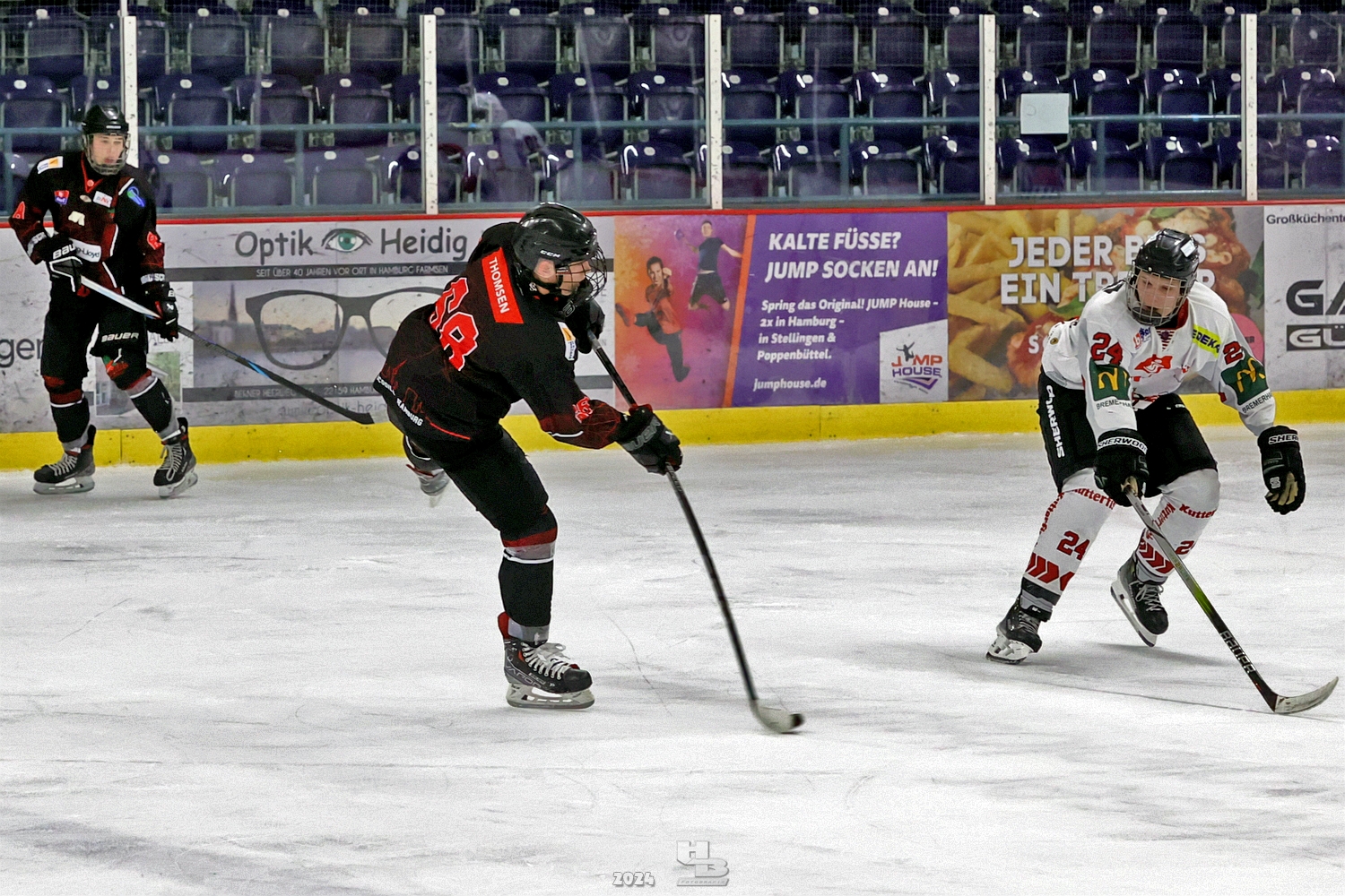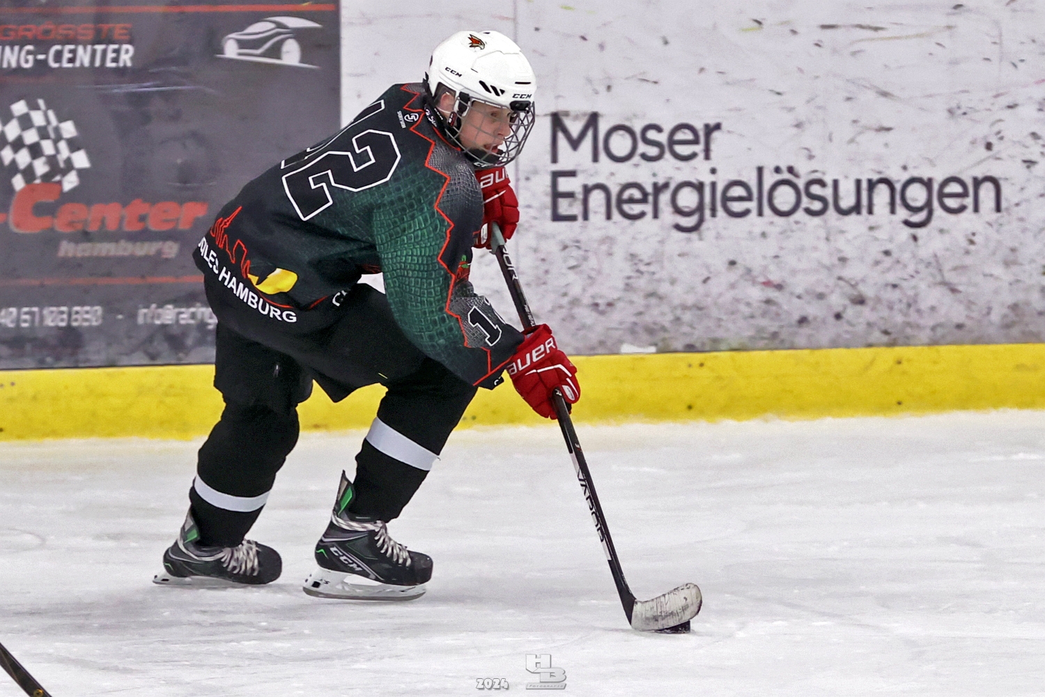 Von Beginn an war die Mannschaft hochkonzentriert und wollte an den Erfolg in Adendorf anknüpfen und den Anschluss in der Tabelle halten und sogar Plätze gut machen. Nach nicht einmal 3 Minuten im 1. Drittel klingelte es bereits im Kasten der Harsefeld Tigers. Torschütze war Luke Külbel auf Vorlage von Lenny Reik. In der 6. Minute musste dann der in Hamburg bestens bekannte Rasid Saitov, der vom HSV nach Harsefeld gewechselt ist, auf die Strafbank. Nach kurzem Abtasten war es dann Timi Liivalathi, der auf Vorlage von Matej Morong auf 2:0 erhöhen konnte. Mit dieser Führung ging es dann auch in die 1. Pause.