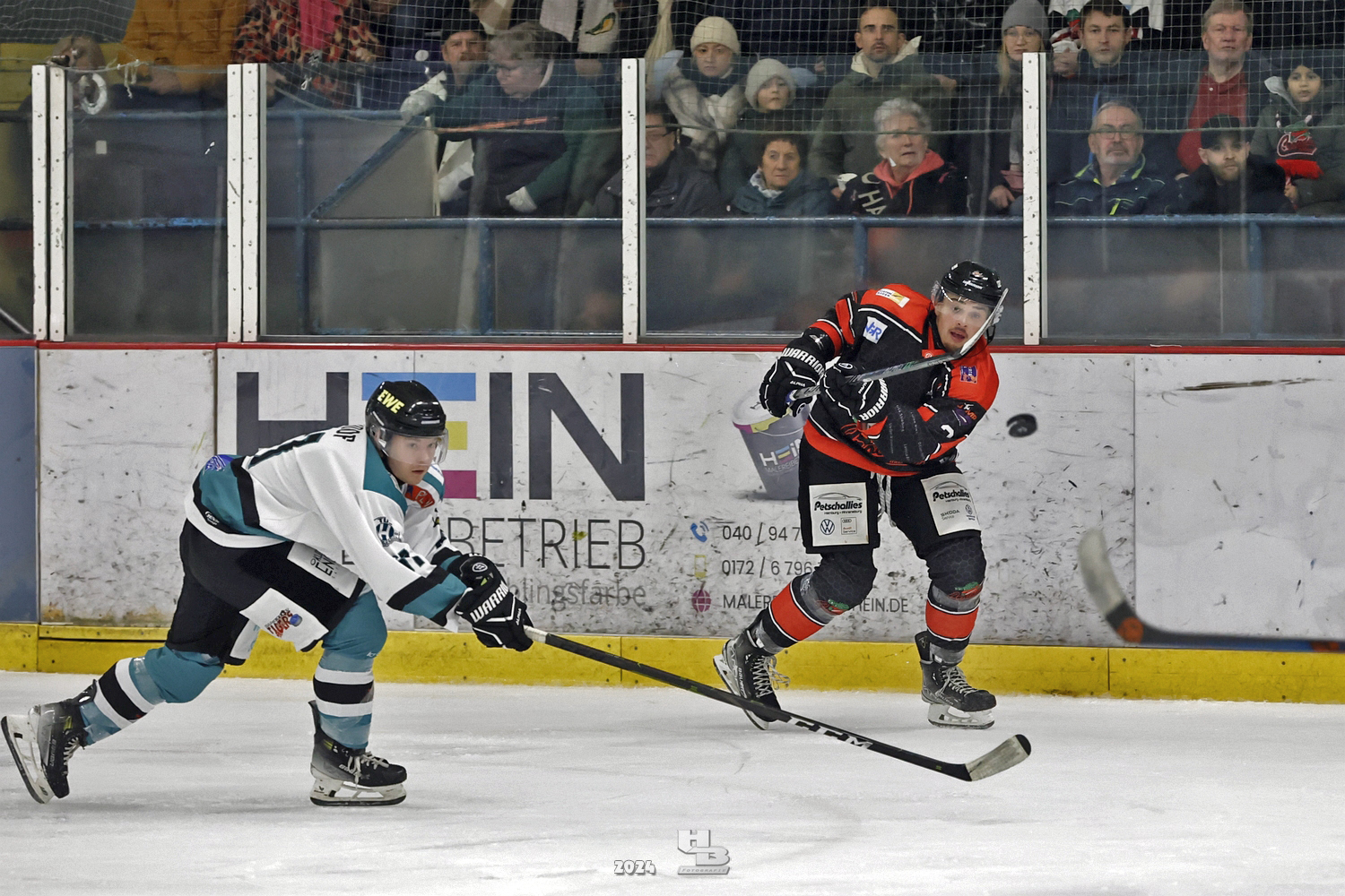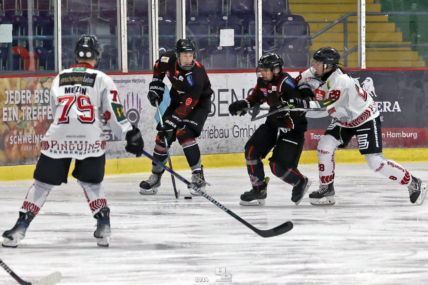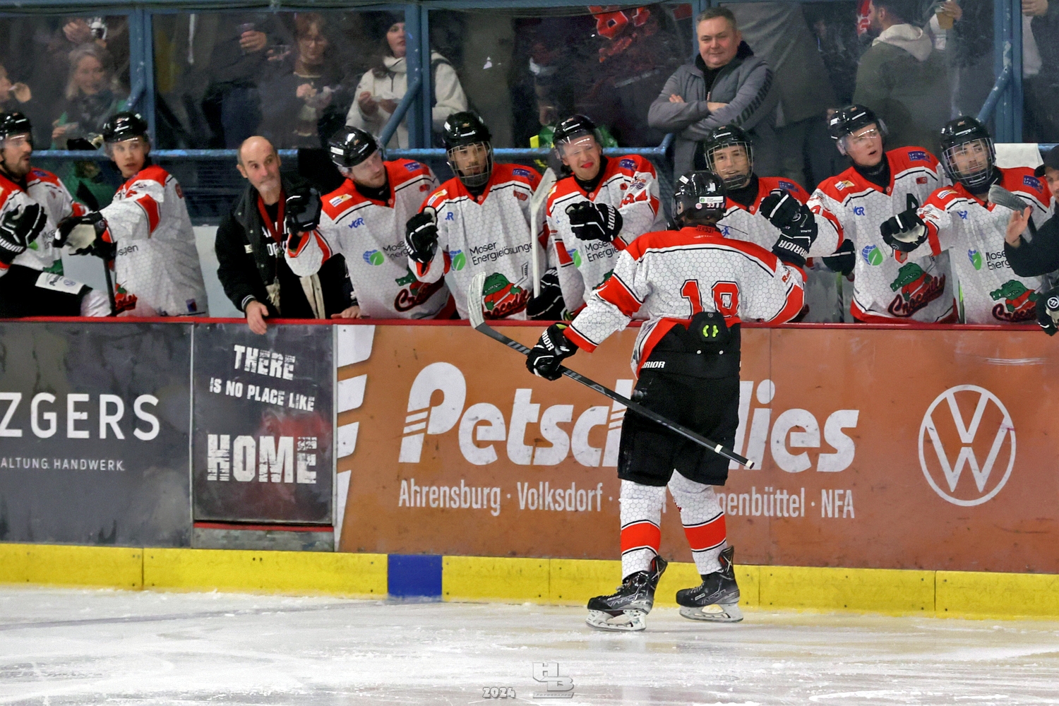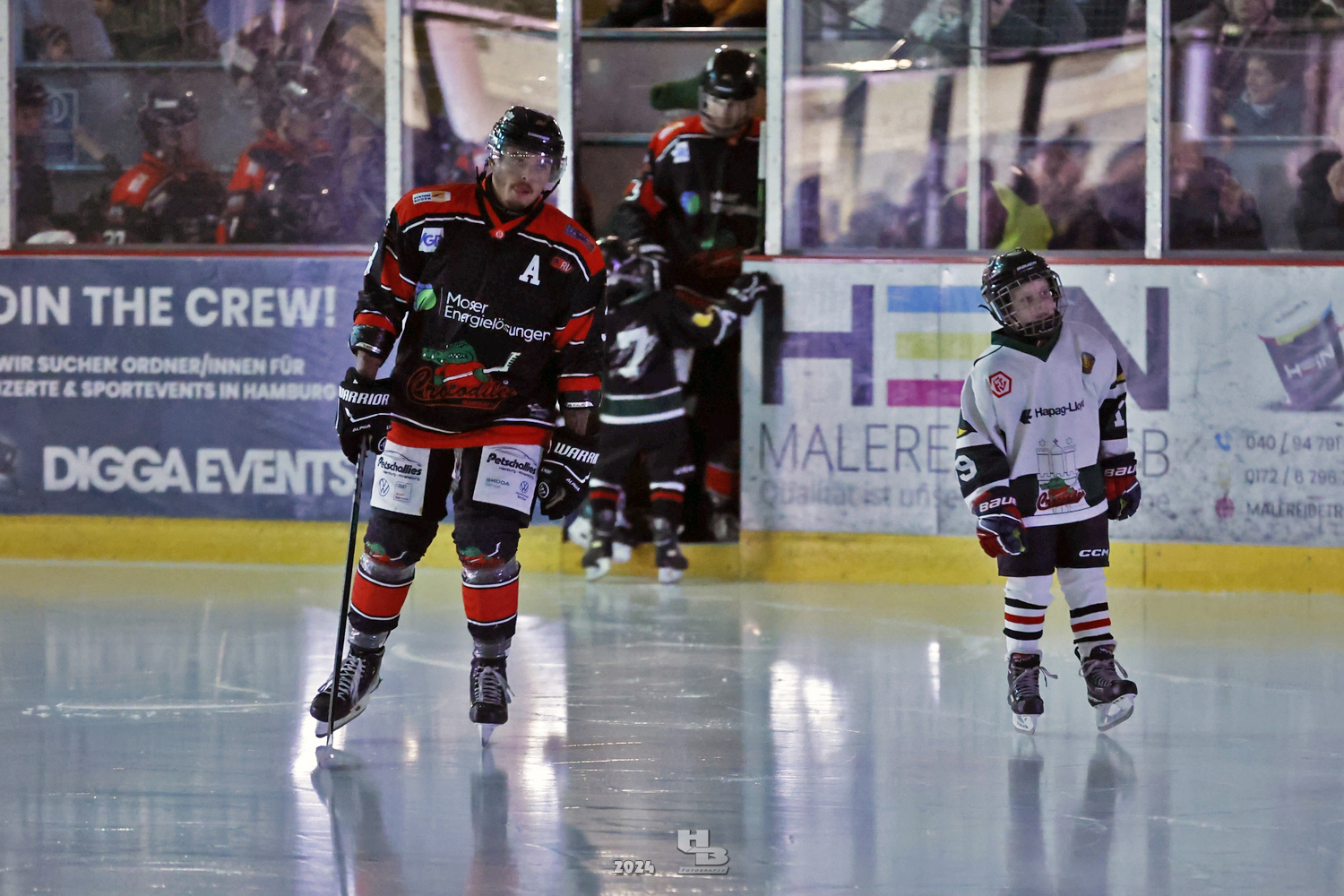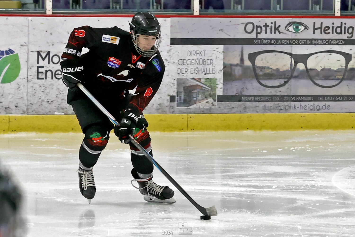 Von Beginn an war die Mannschaft hochkonzentriert und wollte an den Erfolg in Adendorf anknüpfen und den Anschluss in der Tabelle halten und sogar Plätze gut machen. Nach nicht einmal 3 Minuten im 1. Drittel klingelte es bereits im Kasten der Harsefeld Tigers. Torschütze war Luke Külbel auf Vorlage von Lenny Reik. In der 6. Minute musste dann der in Hamburg bestens bekannte Rasid Saitov, der vom HSV nach Harsefeld gewechselt ist, auf die Strafbank. Nach kurzem Abtasten war es dann Timi Liivalathi, der auf Vorlage von Matej Morong auf 2:0 erhöhen konnte. Mit dieser Führung ging es dann auch in die 1. Pause.