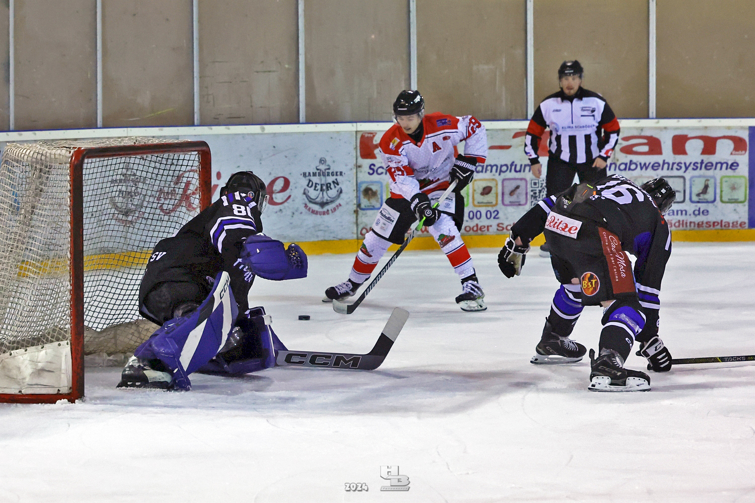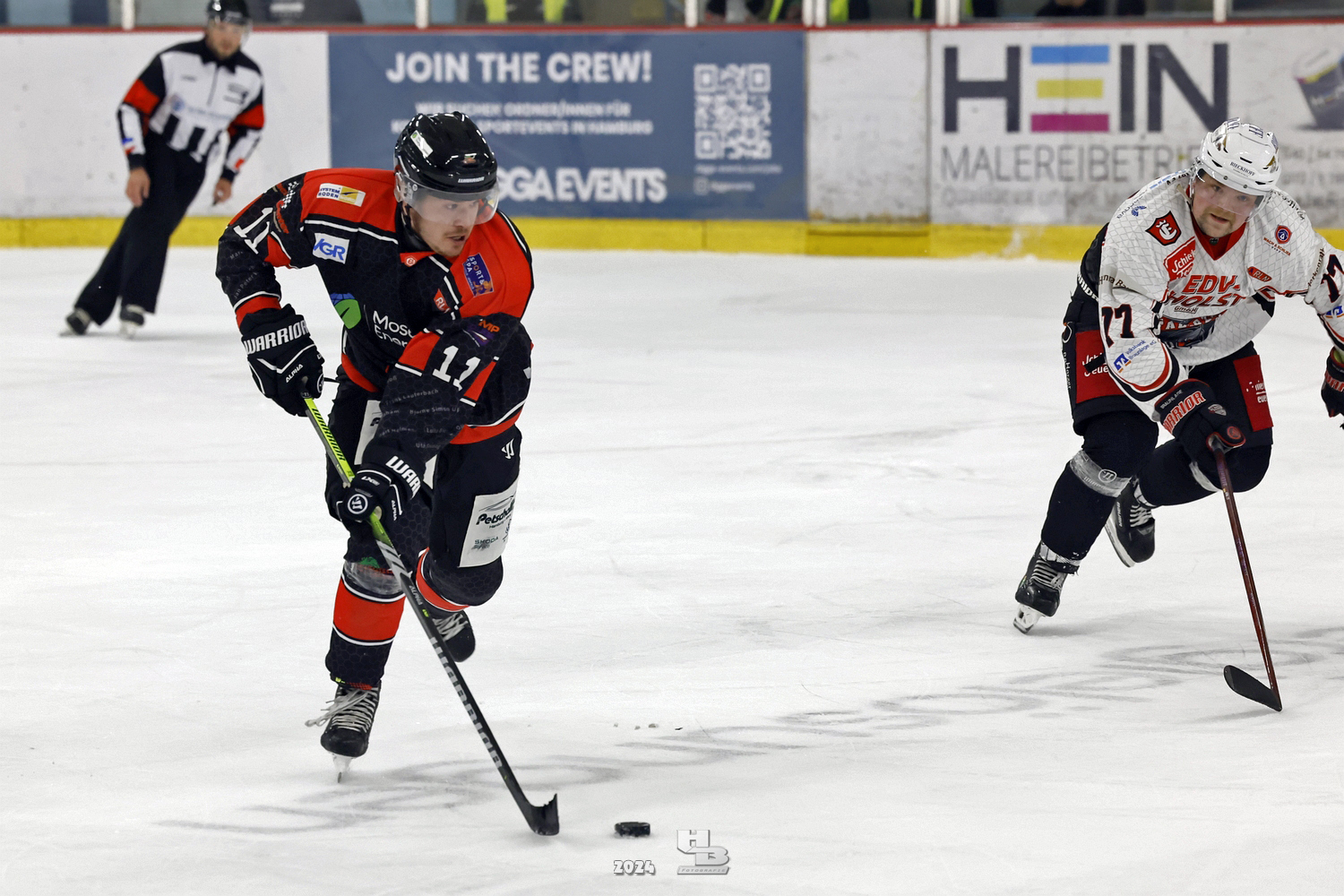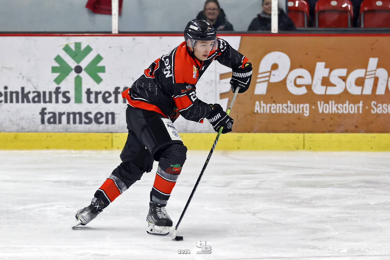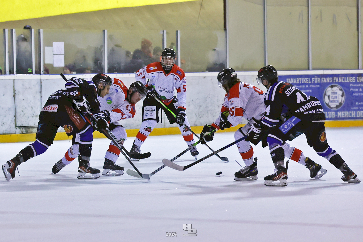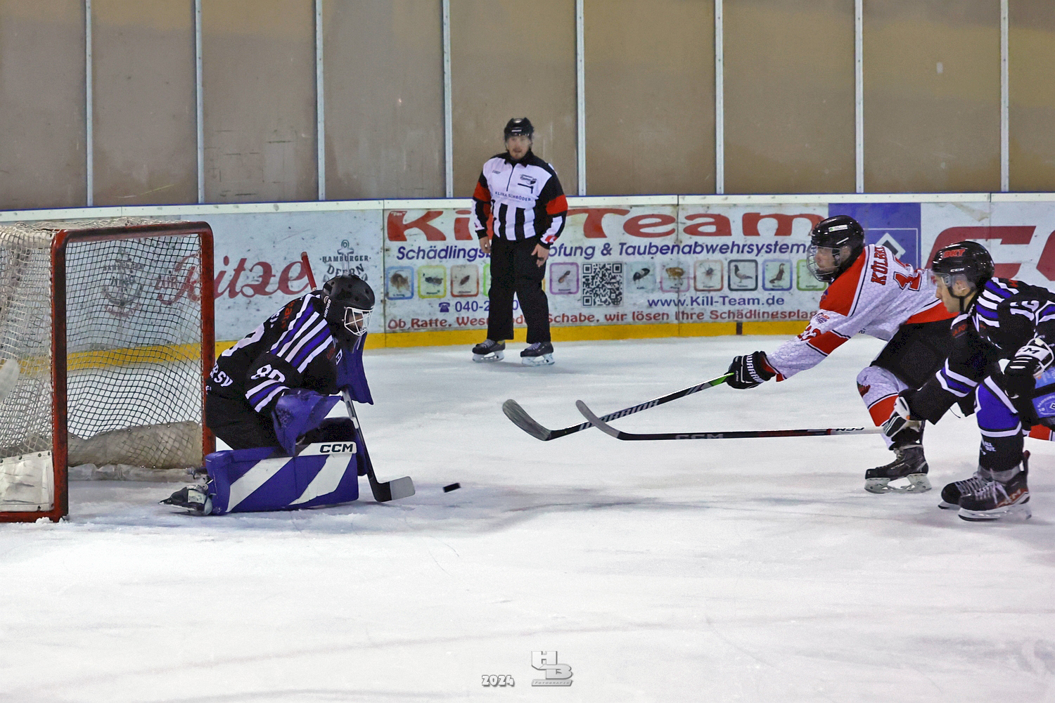 Von Beginn an war die Mannschaft hochkonzentriert und wollte an den Erfolg in Adendorf anknüpfen und den Anschluss in der Tabelle halten und sogar Plätze gut machen. Nach nicht einmal 3 Minuten im 1. Drittel klingelte es bereits im Kasten der Harsefeld Tigers. Torschütze war Luke Külbel auf Vorlage von Lenny Reik. In der 6. Minute musste dann der in Hamburg bestens bekannte Rasid Saitov, der vom HSV nach Harsefeld gewechselt ist, auf die Strafbank. Nach kurzem Abtasten war es dann Timi Liivalathi, der auf Vorlage von Matej Morong auf 2:0 erhöhen konnte. Mit dieser Führung ging es dann auch in die 1. Pause.