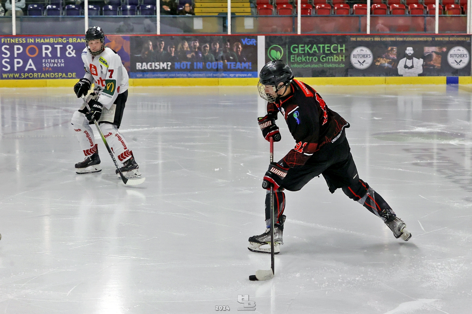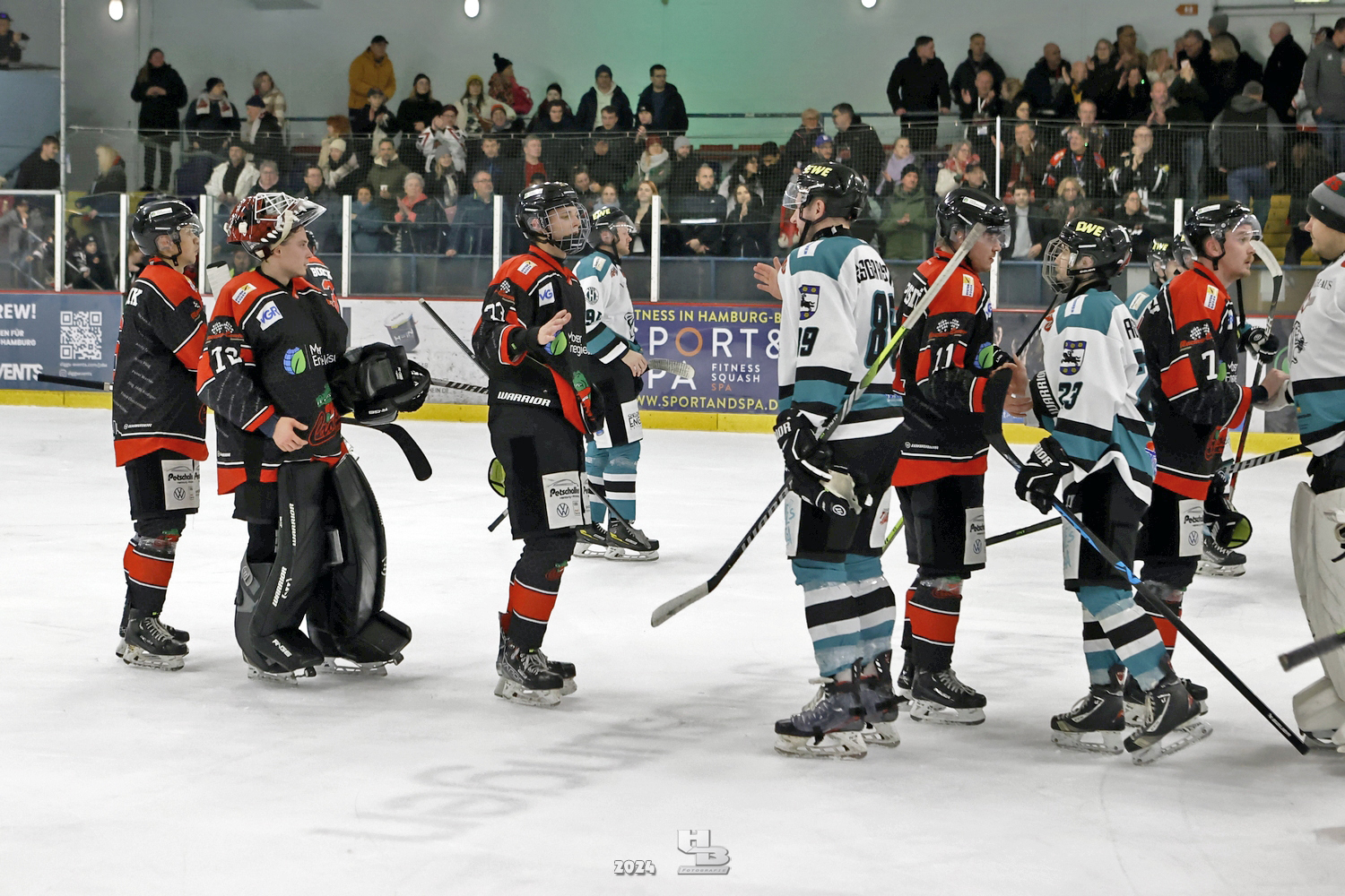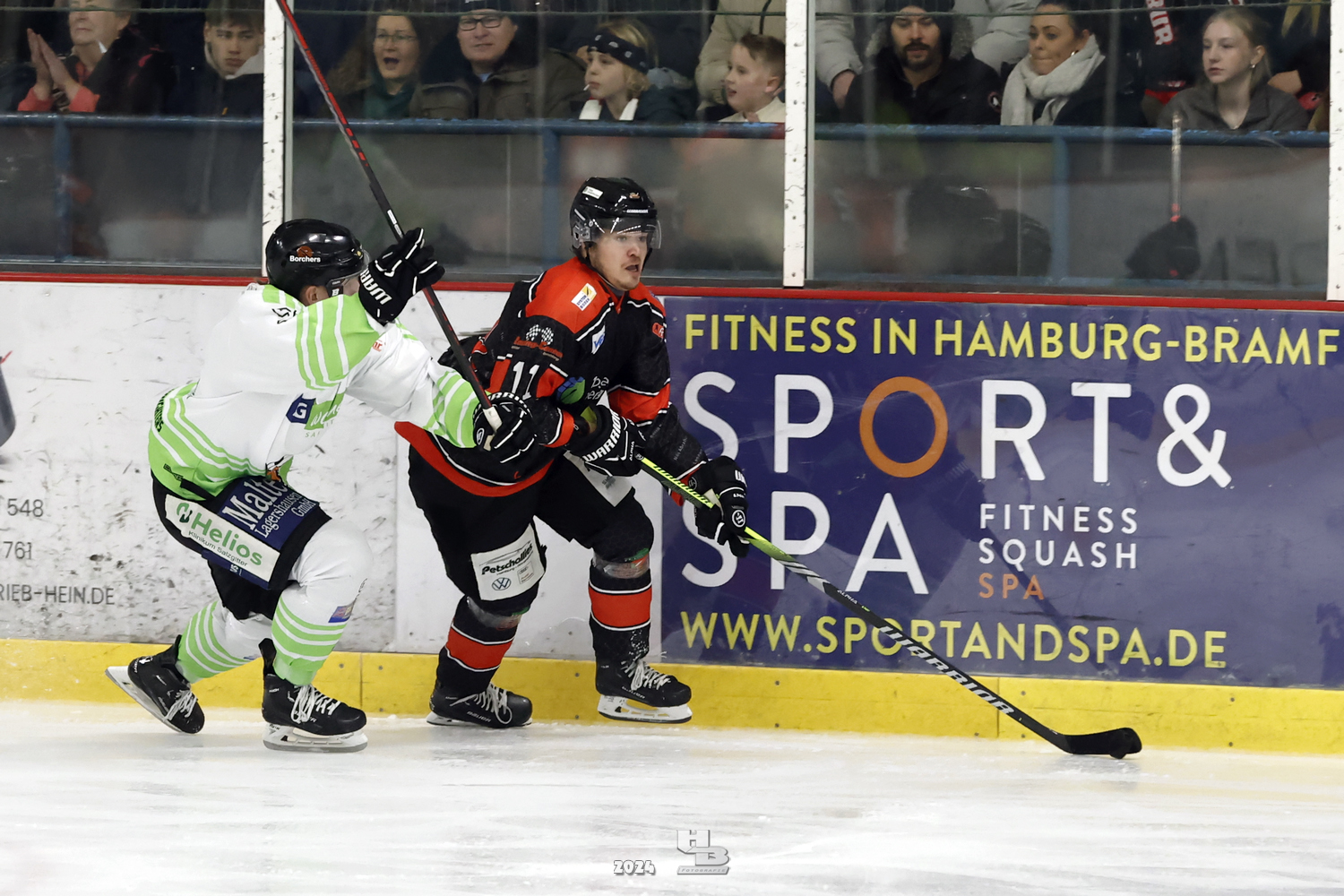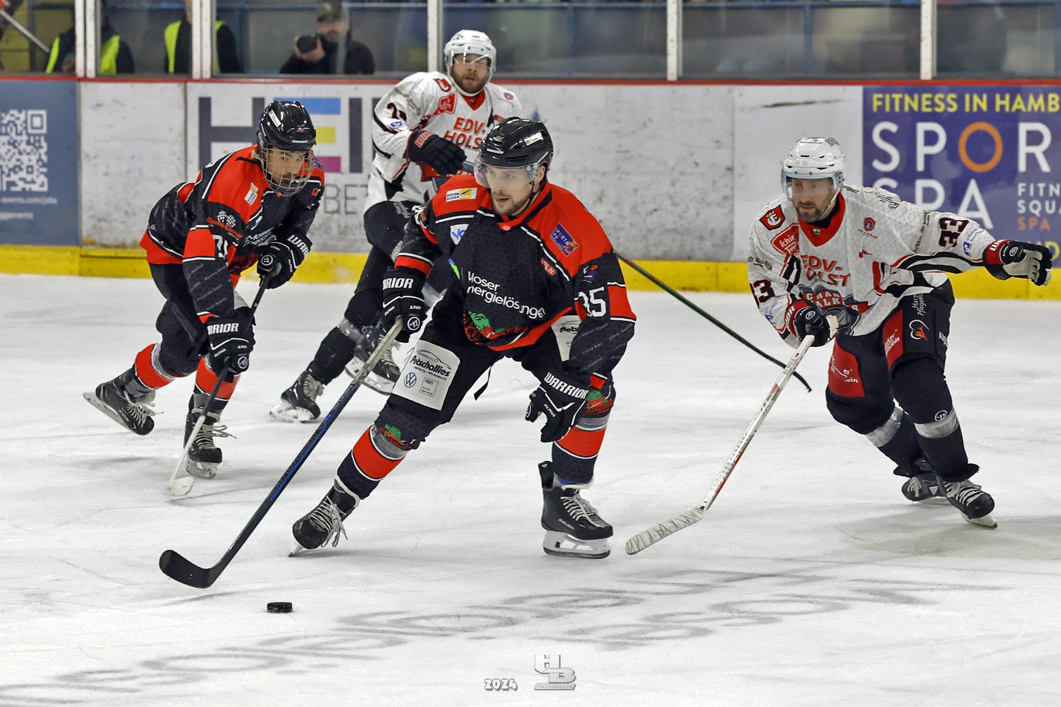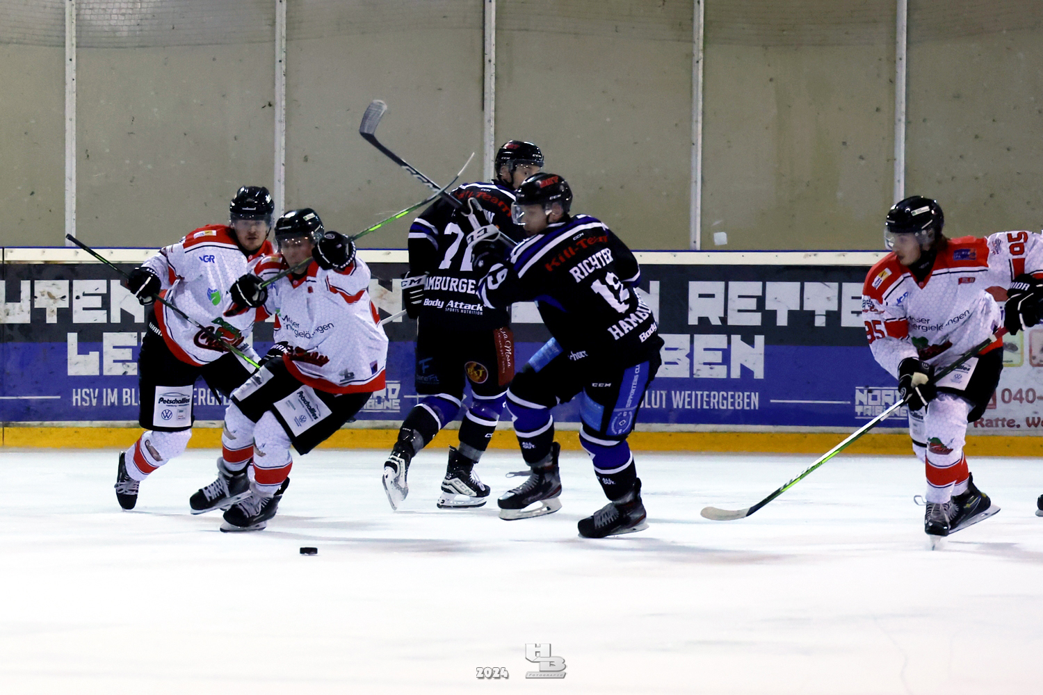 Von Beginn an war die Mannschaft hochkonzentriert und wollte an den Erfolg in Adendorf anknüpfen und den Anschluss in der Tabelle halten und sogar Plätze gut machen. Nach nicht einmal 3 Minuten im 1. Drittel klingelte es bereits im Kasten der Harsefeld Tigers. Torschütze war Luke Külbel auf Vorlage von Lenny Reik. In der 6. Minute musste dann der in Hamburg bestens bekannte Rasid Saitov, der vom HSV nach Harsefeld gewechselt ist, auf die Strafbank. Nach kurzem Abtasten war es dann Timi Liivalathi, der auf Vorlage von Matej Morong auf 2:0 erhöhen konnte. Mit dieser Führung ging es dann auch in die 1. Pause.