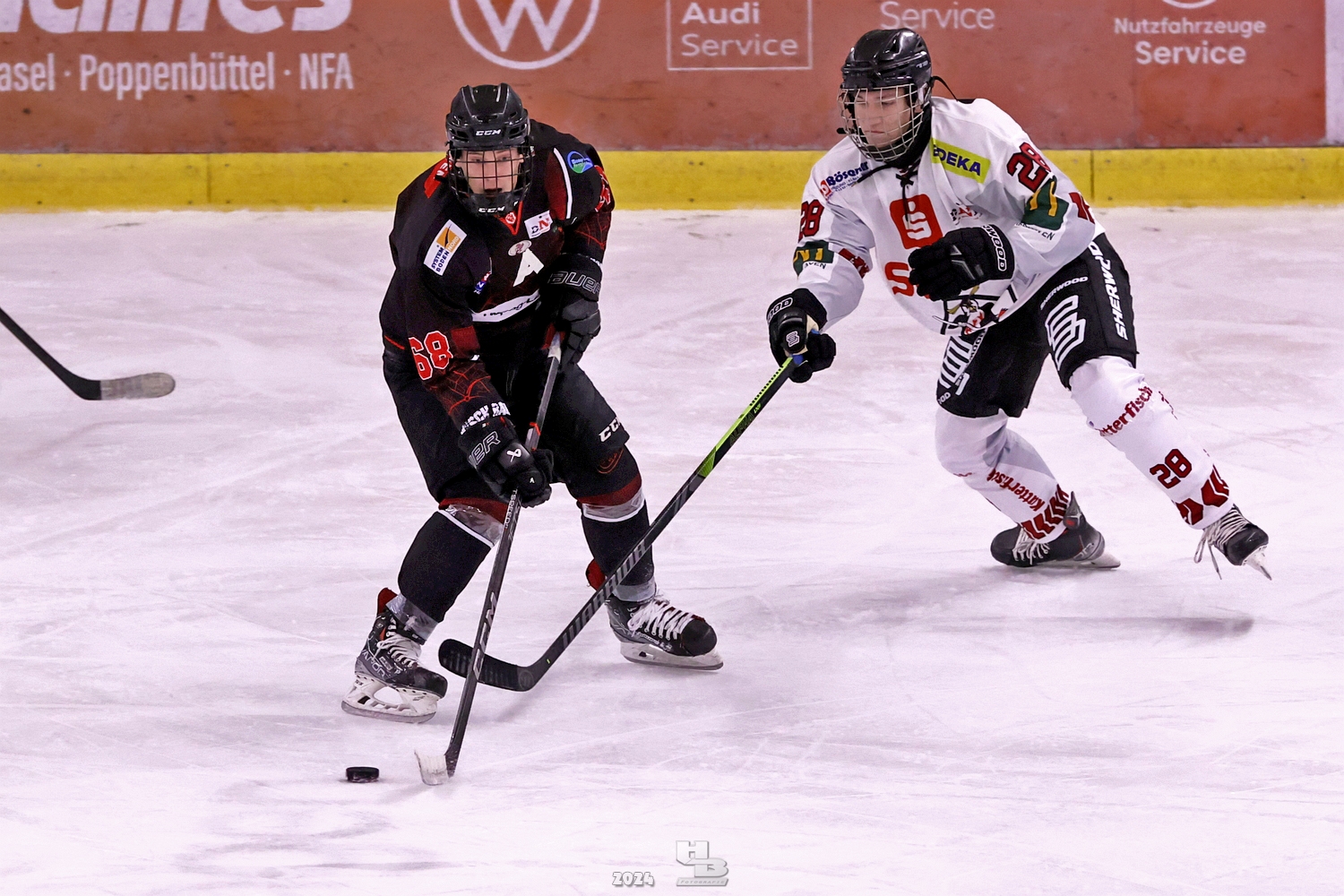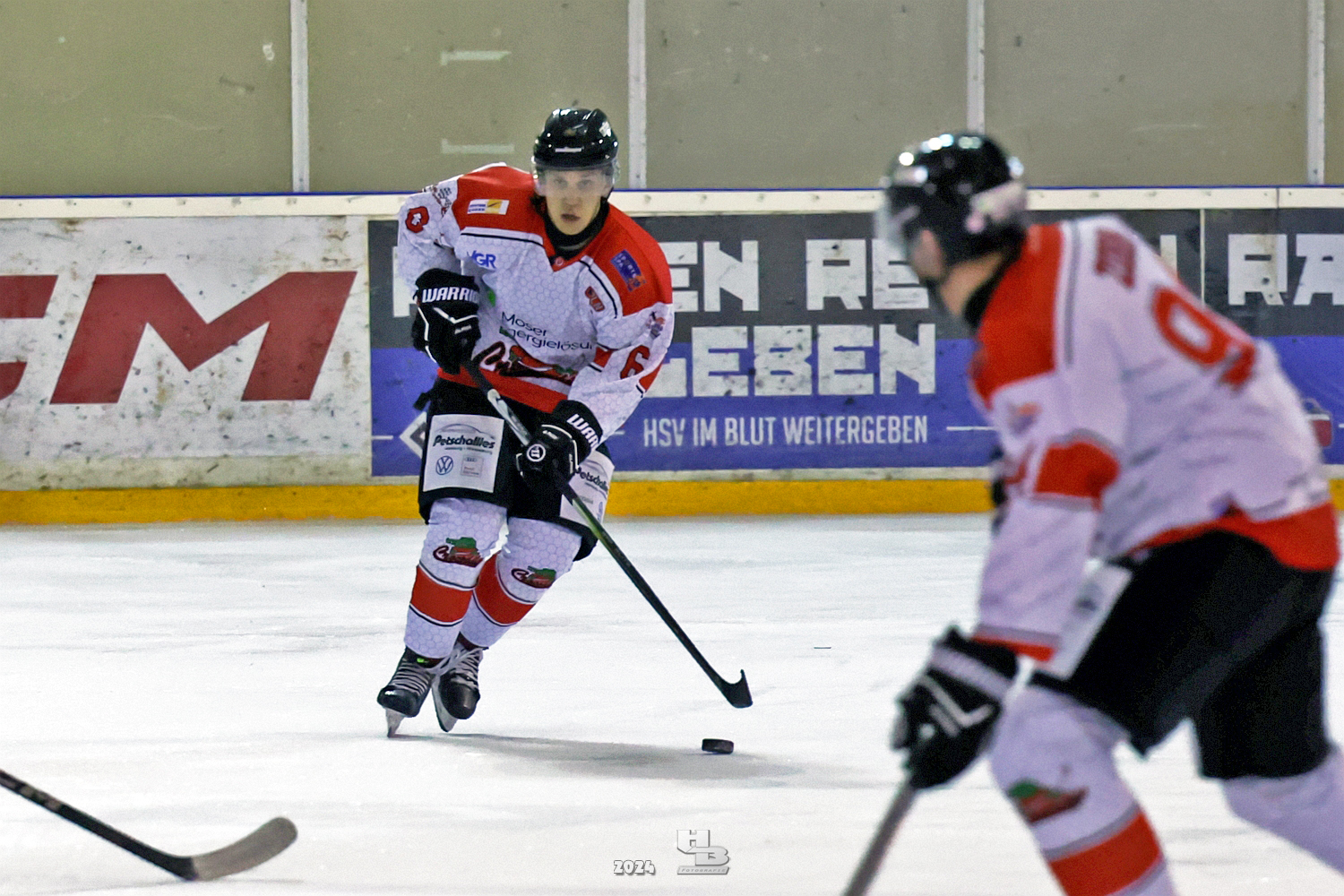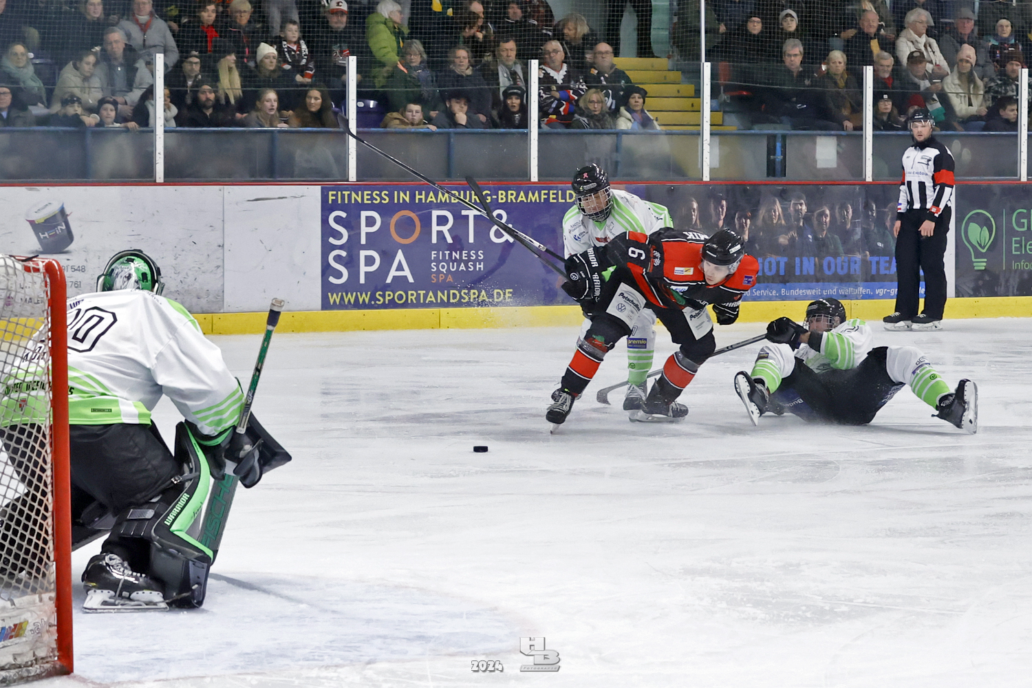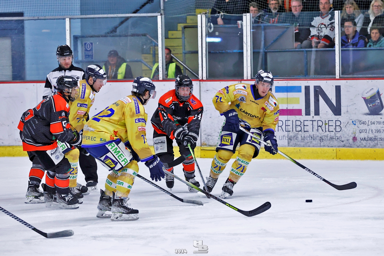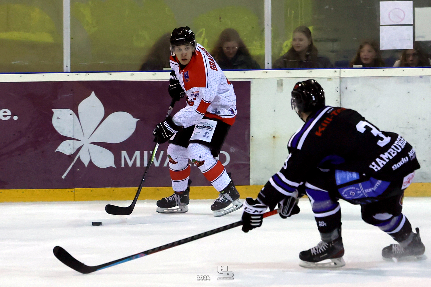 Von Beginn an war die Mannschaft hochkonzentriert und wollte an den Erfolg in Adendorf anknüpfen und den Anschluss in der Tabelle halten und sogar Plätze gut machen. Nach nicht einmal 3 Minuten im 1. Drittel klingelte es bereits im Kasten der Harsefeld Tigers. Torschütze war Luke Külbel auf Vorlage von Lenny Reik. In der 6. Minute musste dann der in Hamburg bestens bekannte Rasid Saitov, der vom HSV nach Harsefeld gewechselt ist, auf die Strafbank. Nach kurzem Abtasten war es dann Timi Liivalathi, der auf Vorlage von Matej Morong auf 2:0 erhöhen konnte. Mit dieser Führung ging es dann auch in die 1. Pause.