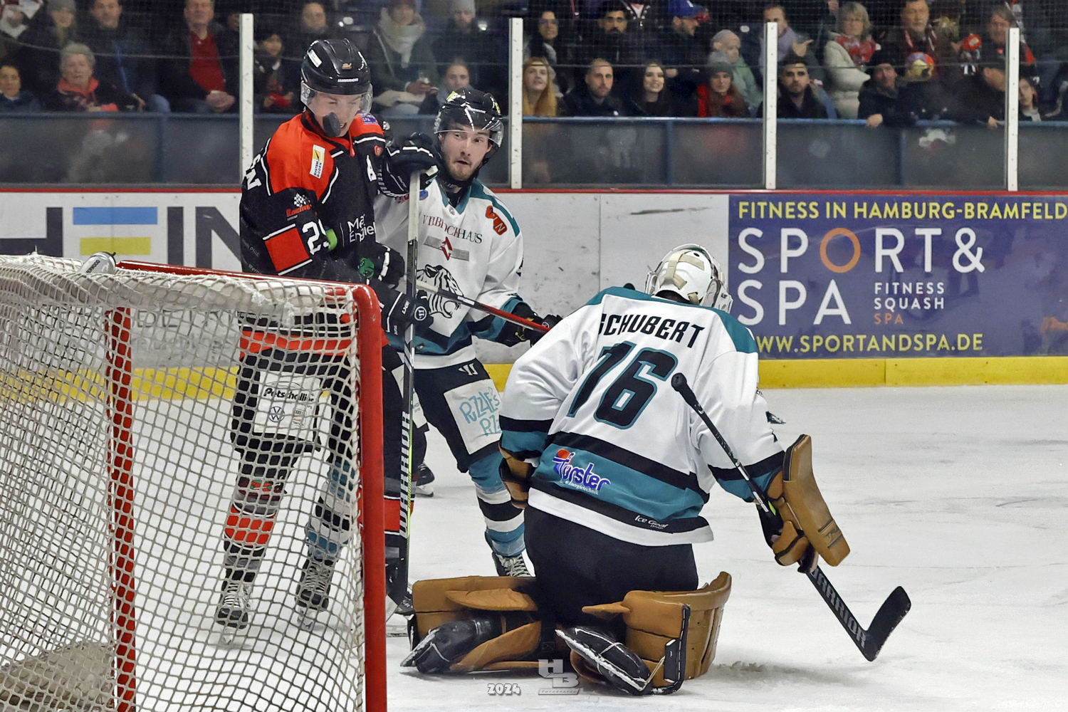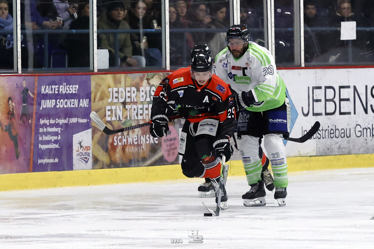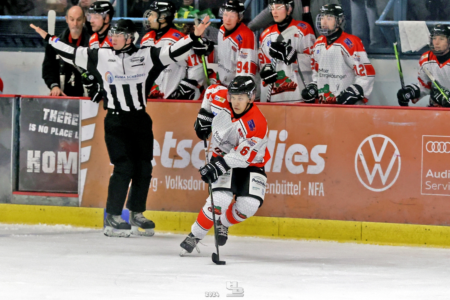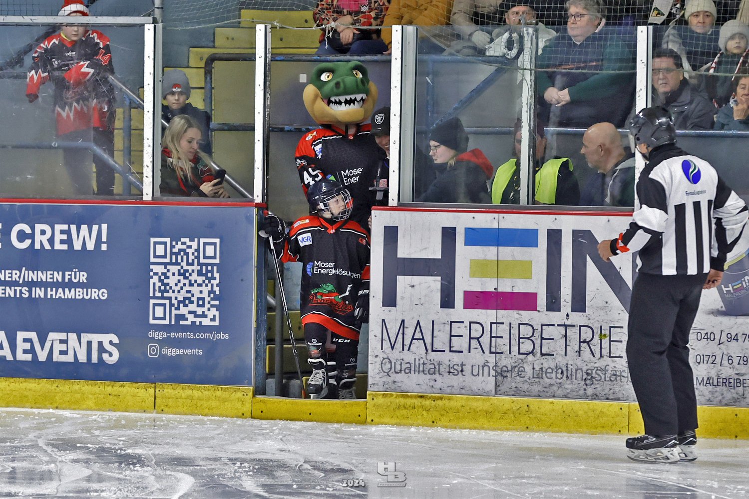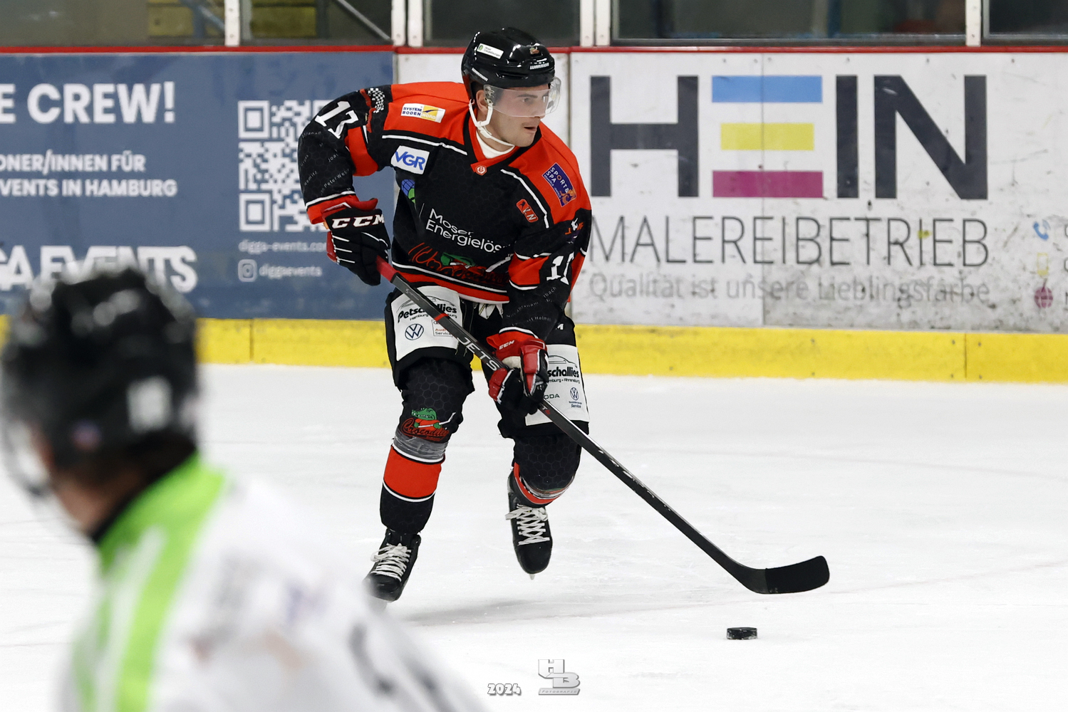 Von Beginn an war die Mannschaft hochkonzentriert und wollte an den Erfolg in Adendorf anknüpfen und den Anschluss in der Tabelle halten und sogar Plätze gut machen. Nach nicht einmal 3 Minuten im 1. Drittel klingelte es bereits im Kasten der Harsefeld Tigers. Torschütze war Luke Külbel auf Vorlage von Lenny Reik. In der 6. Minute musste dann der in Hamburg bestens bekannte Rasid Saitov, der vom HSV nach Harsefeld gewechselt ist, auf die Strafbank. Nach kurzem Abtasten war es dann Timi Liivalathi, der auf Vorlage von Matej Morong auf 2:0 erhöhen konnte. Mit dieser Führung ging es dann auch in die 1. Pause.