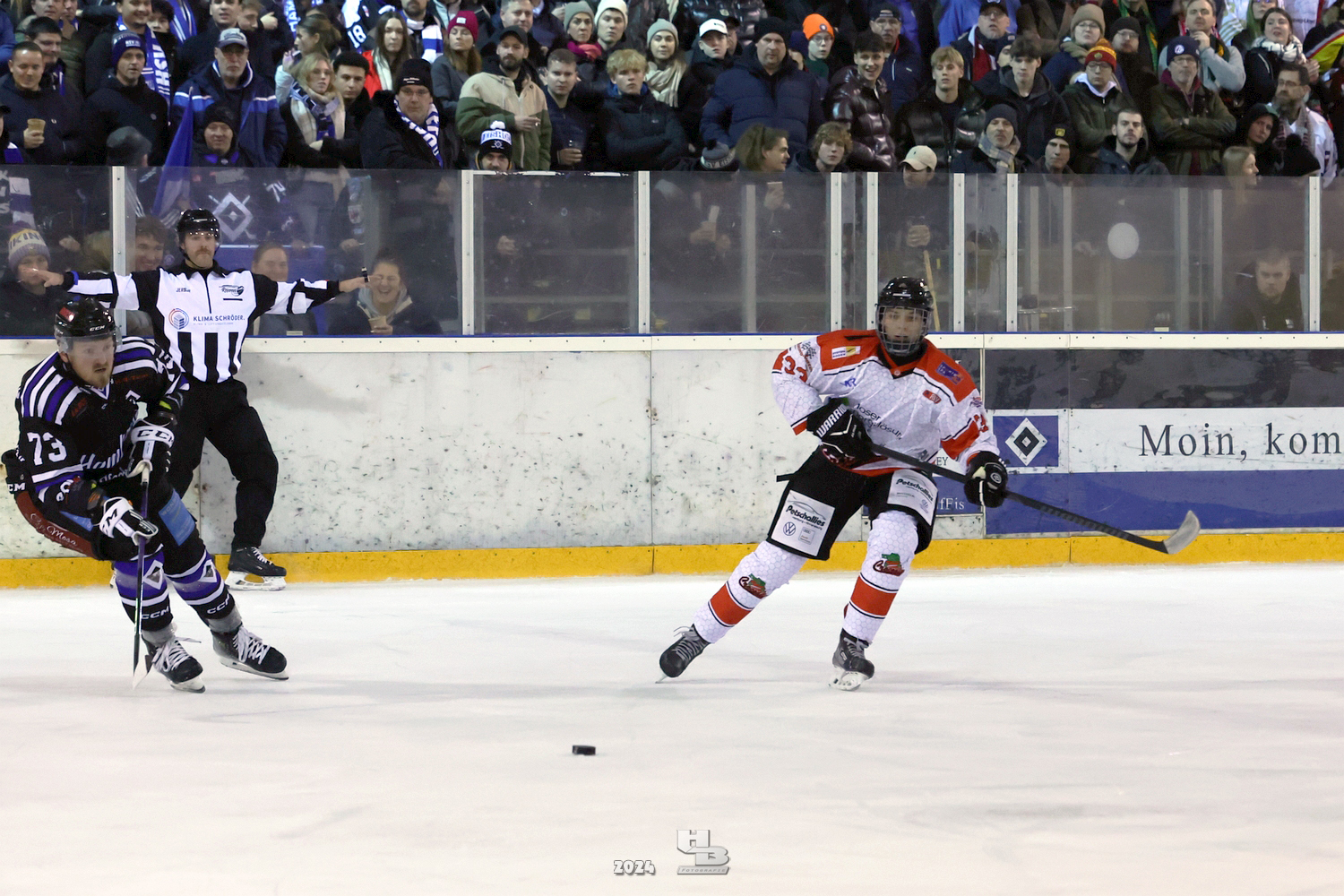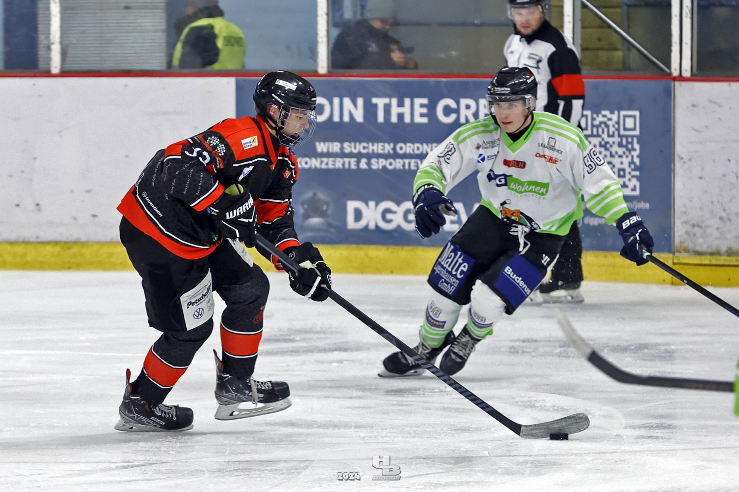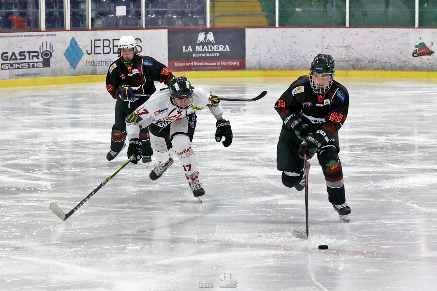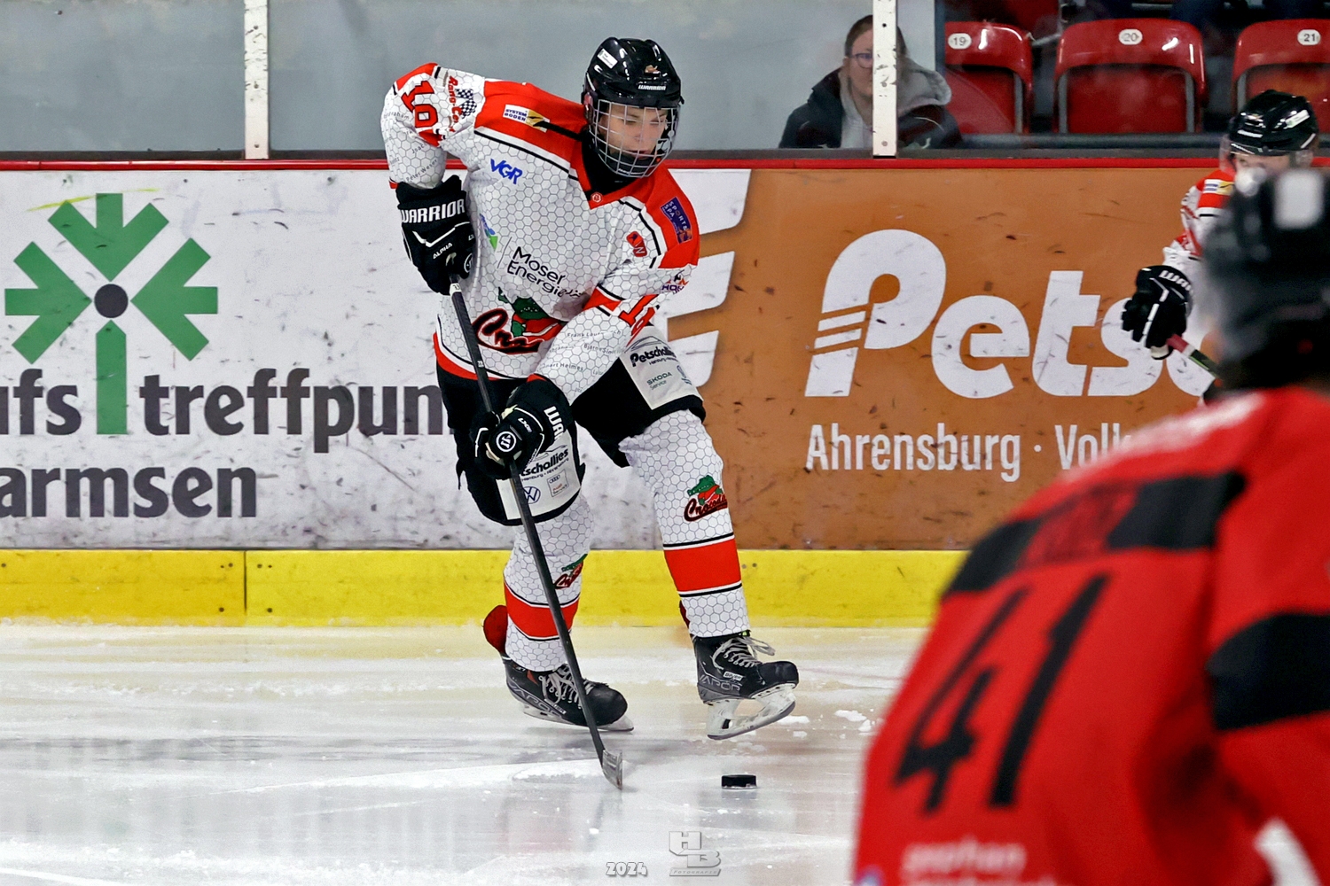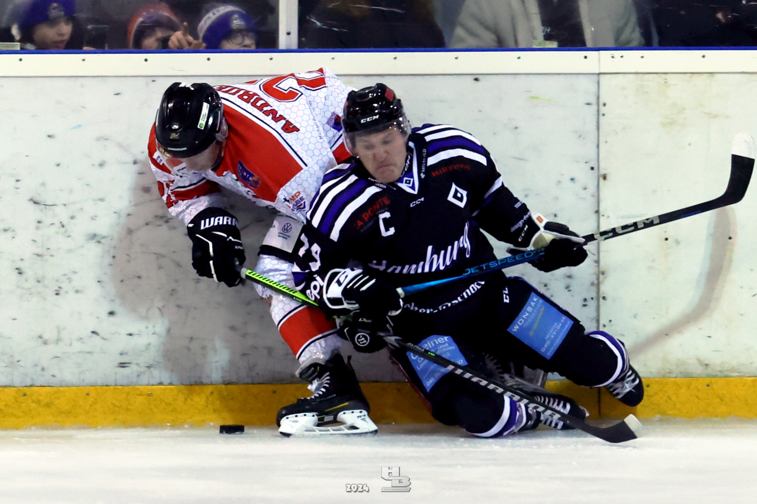 Von Beginn an war die Mannschaft hochkonzentriert und wollte an den Erfolg in Adendorf anknüpfen und den Anschluss in der Tabelle halten und sogar Plätze gut machen. Nach nicht einmal 3 Minuten im 1. Drittel klingelte es bereits im Kasten der Harsefeld Tigers. Torschütze war Luke Külbel auf Vorlage von Lenny Reik. In der 6. Minute musste dann der in Hamburg bestens bekannte Rasid Saitov, der vom HSV nach Harsefeld gewechselt ist, auf die Strafbank. Nach kurzem Abtasten war es dann Timi Liivalathi, der auf Vorlage von Matej Morong auf 2:0 erhöhen konnte. Mit dieser Führung ging es dann auch in die 1. Pause.