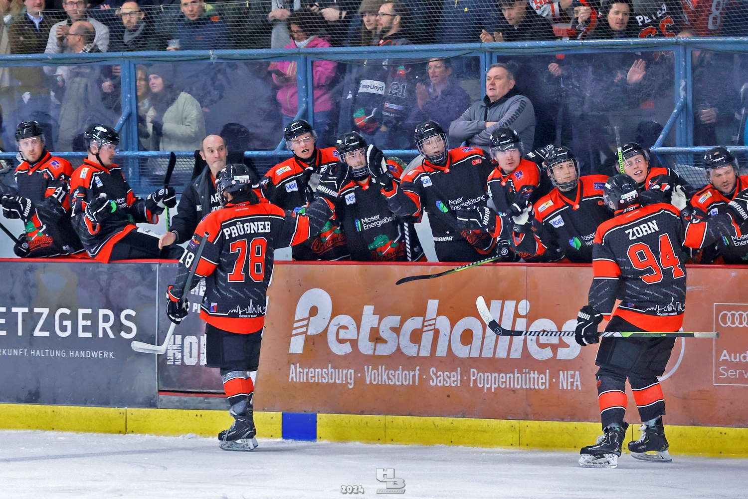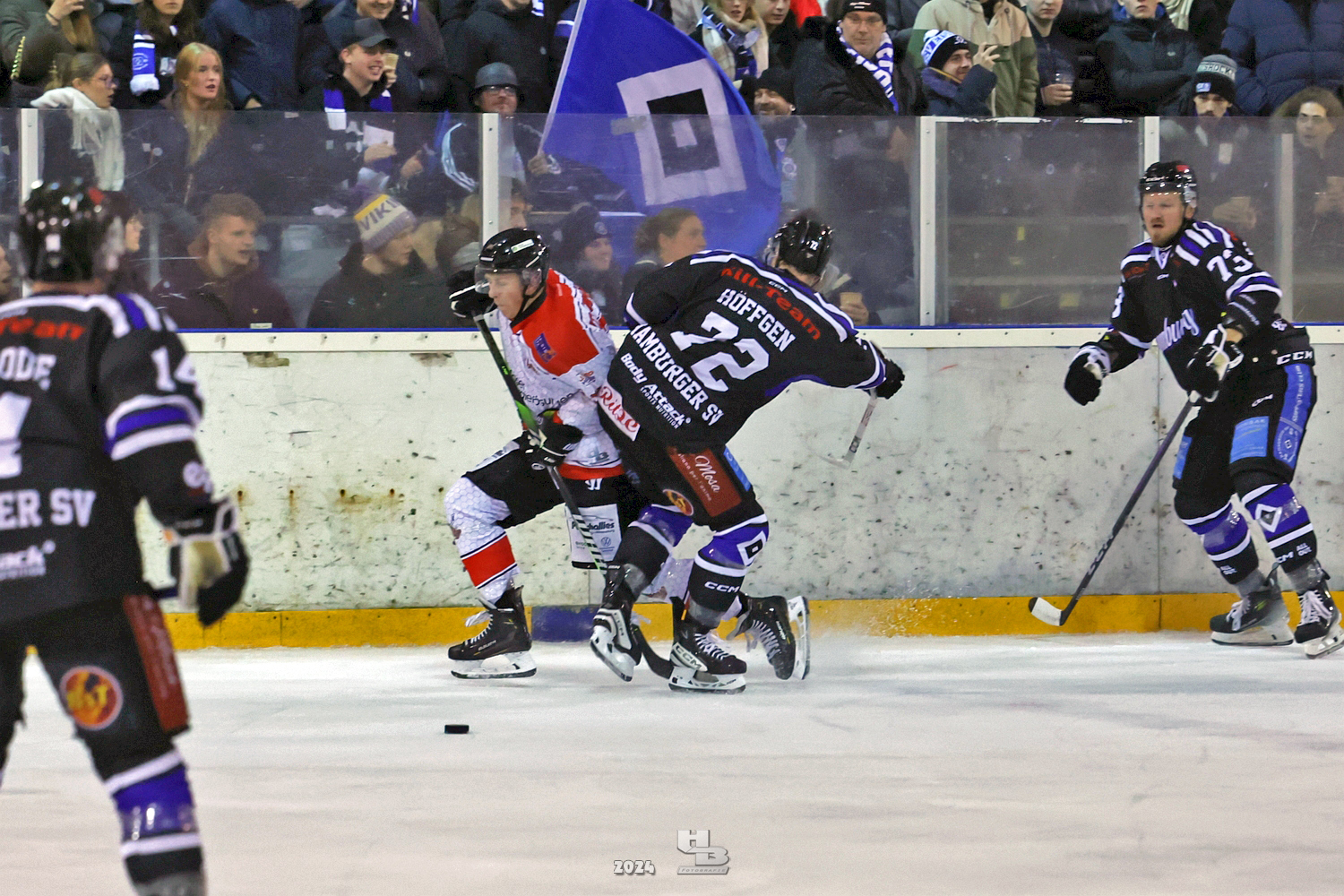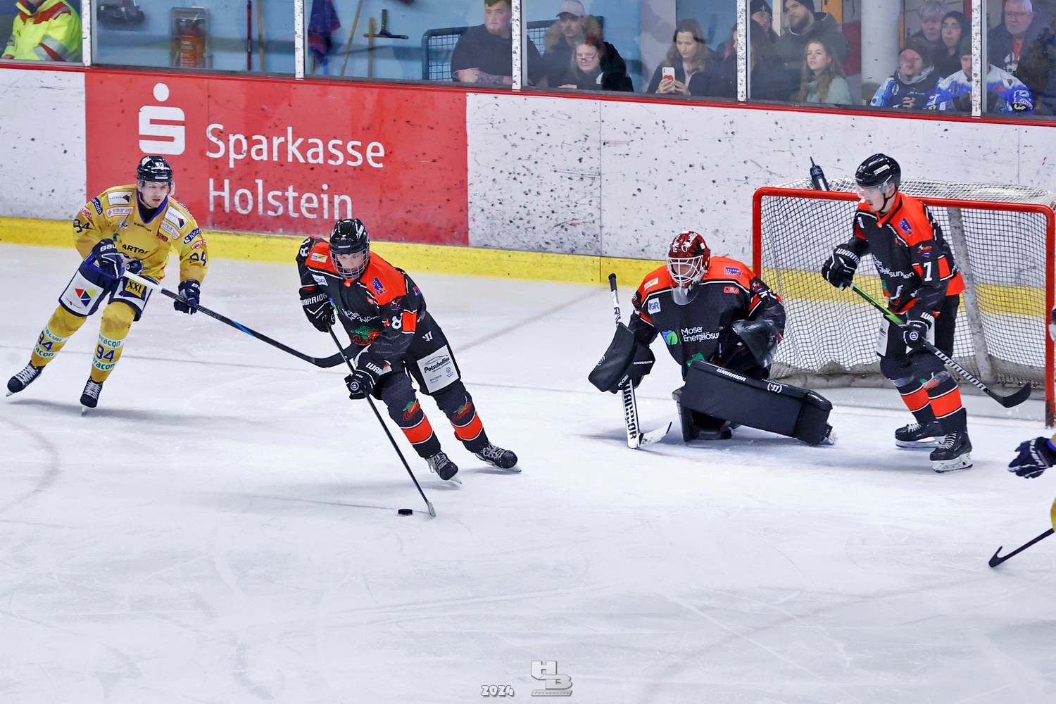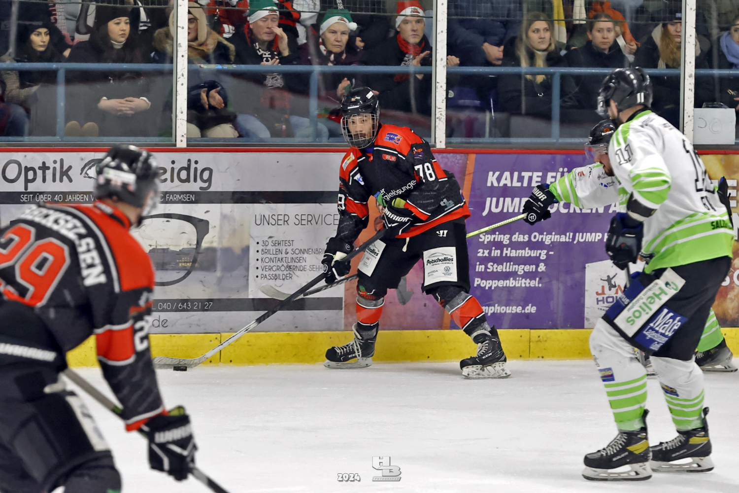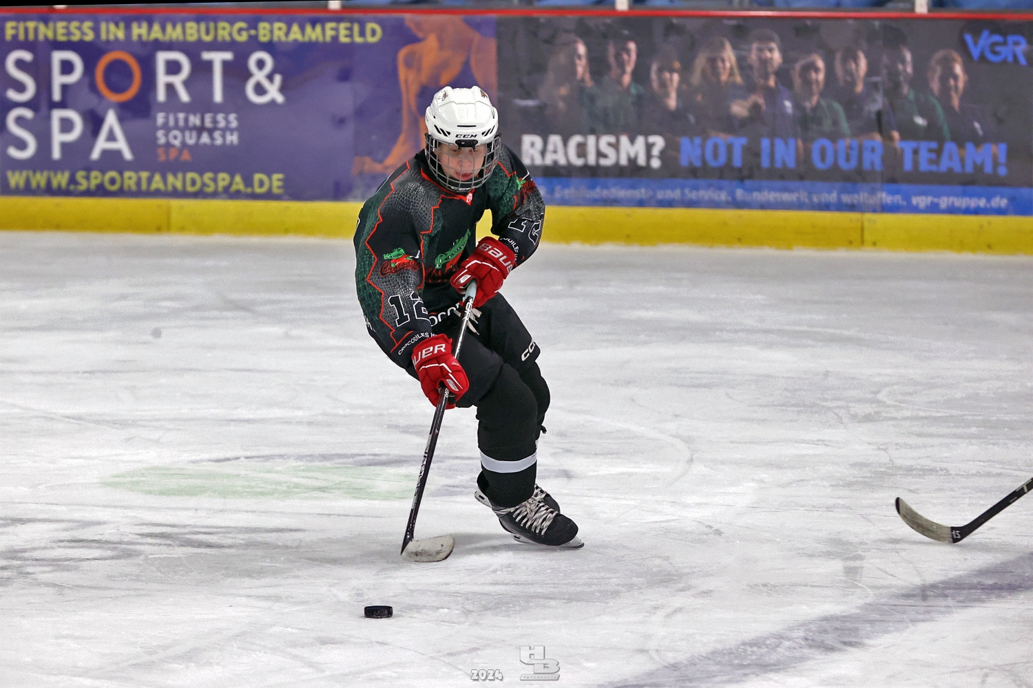 Von Beginn an war die Mannschaft hochkonzentriert und wollte an den Erfolg in Adendorf anknüpfen und den Anschluss in der Tabelle halten und sogar Plätze gut machen. Nach nicht einmal 3 Minuten im 1. Drittel klingelte es bereits im Kasten der Harsefeld Tigers. Torschütze war Luke Külbel auf Vorlage von Lenny Reik. In der 6. Minute musste dann der in Hamburg bestens bekannte Rasid Saitov, der vom HSV nach Harsefeld gewechselt ist, auf die Strafbank. Nach kurzem Abtasten war es dann Timi Liivalathi, der auf Vorlage von Matej Morong auf 2:0 erhöhen konnte. Mit dieser Führung ging es dann auch in die 1. Pause.