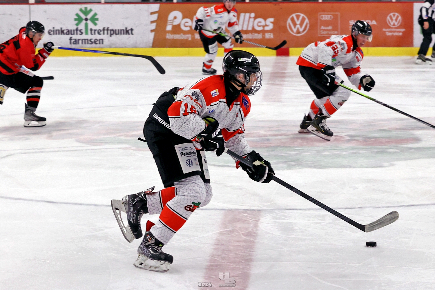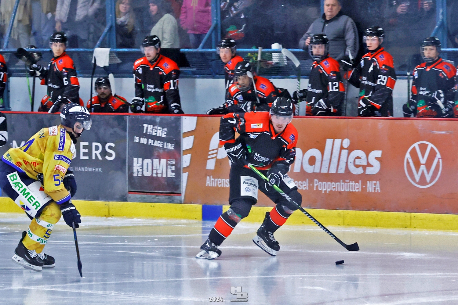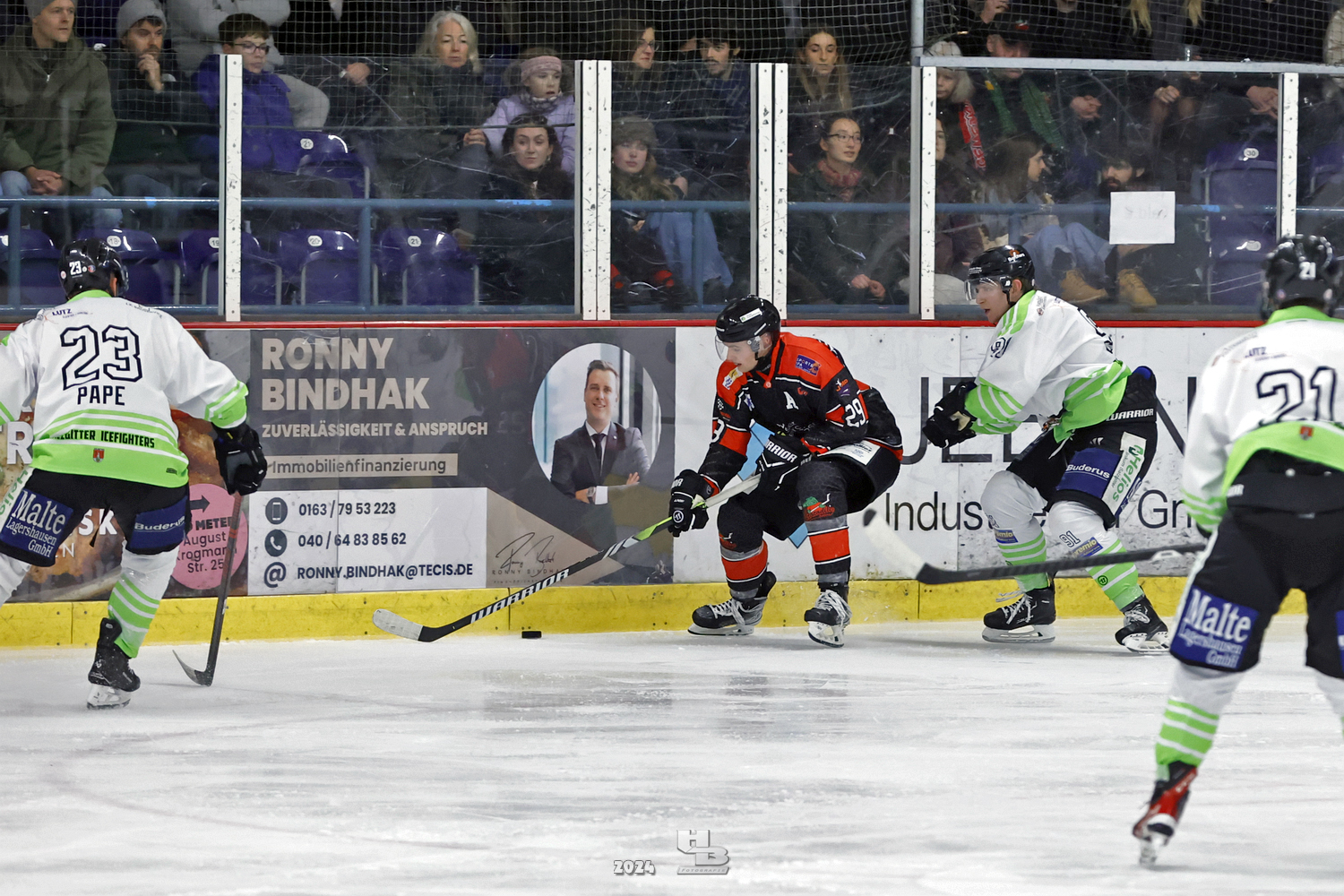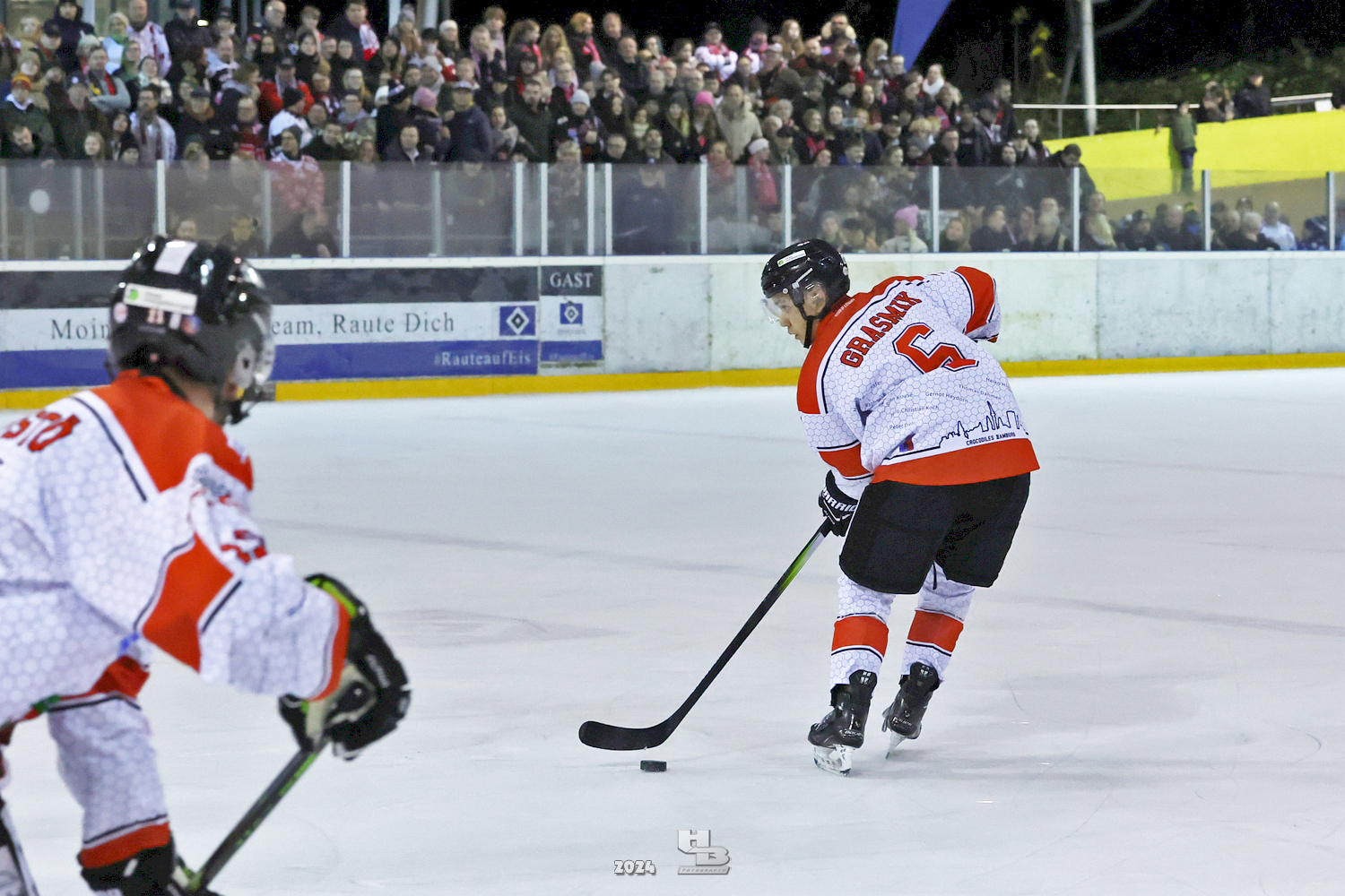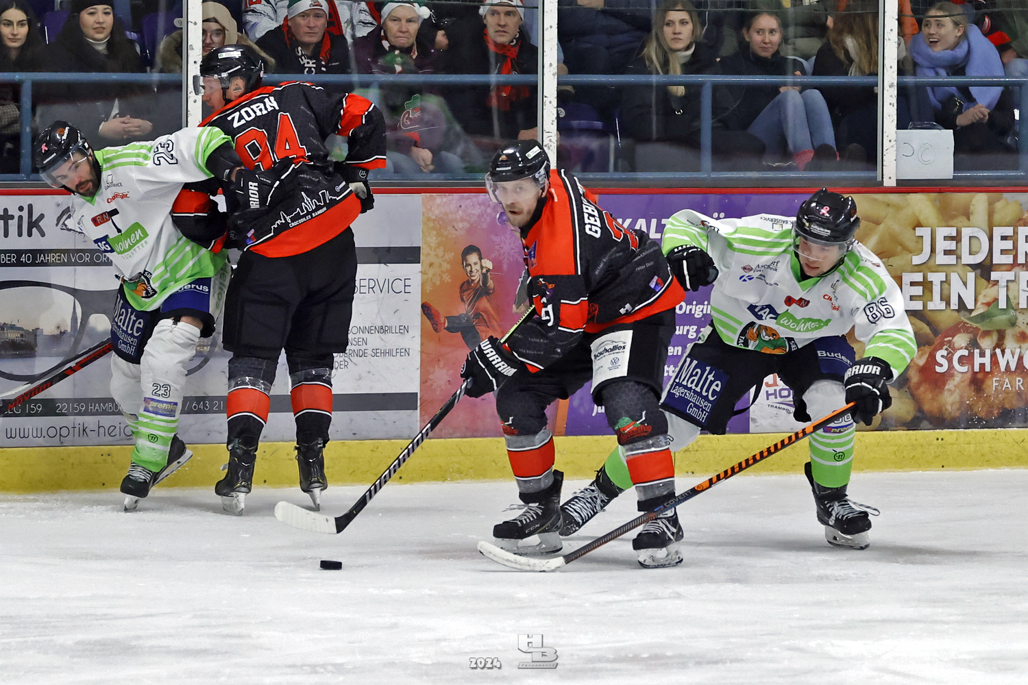 Von Beginn an war die Mannschaft hochkonzentriert und wollte an den Erfolg in Adendorf anknüpfen und den Anschluss in der Tabelle halten und sogar Plätze gut machen. Nach nicht einmal 3 Minuten im 1. Drittel klingelte es bereits im Kasten der Harsefeld Tigers. Torschütze war Luke Külbel auf Vorlage von Lenny Reik. In der 6. Minute musste dann der in Hamburg bestens bekannte Rasid Saitov, der vom HSV nach Harsefeld gewechselt ist, auf die Strafbank. Nach kurzem Abtasten war es dann Timi Liivalathi, der auf Vorlage von Matej Morong auf 2:0 erhöhen konnte. Mit dieser Führung ging es dann auch in die 1. Pause.
