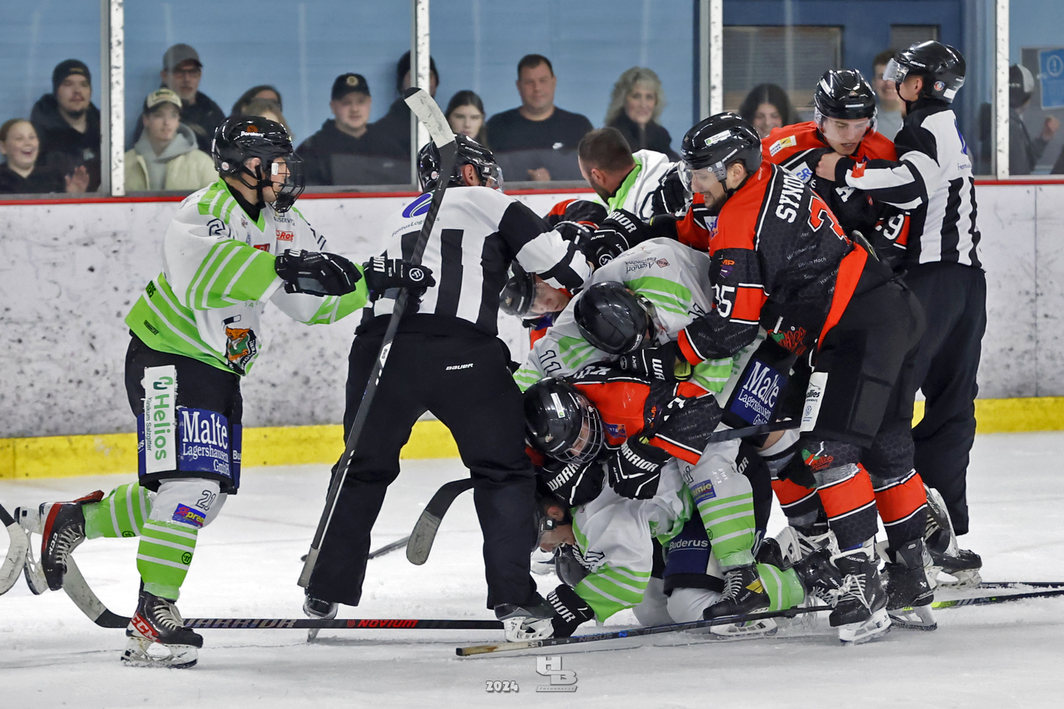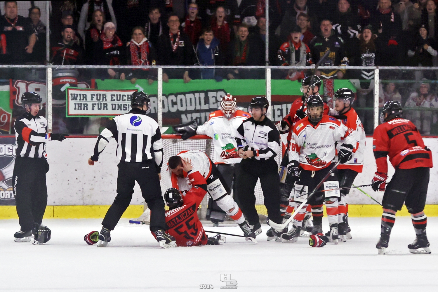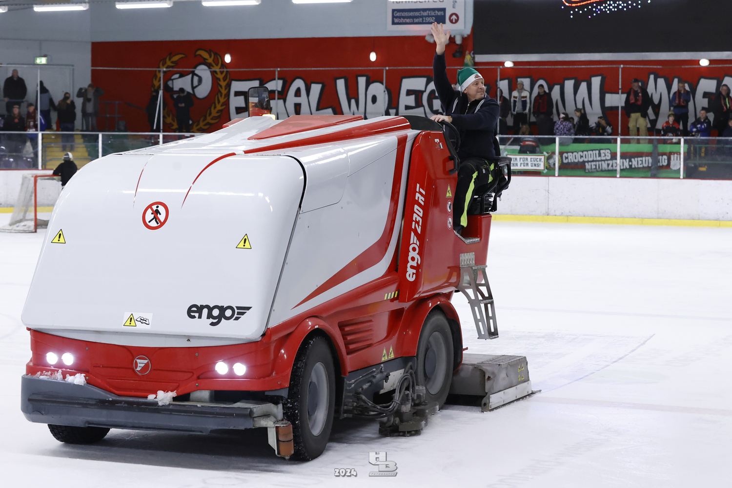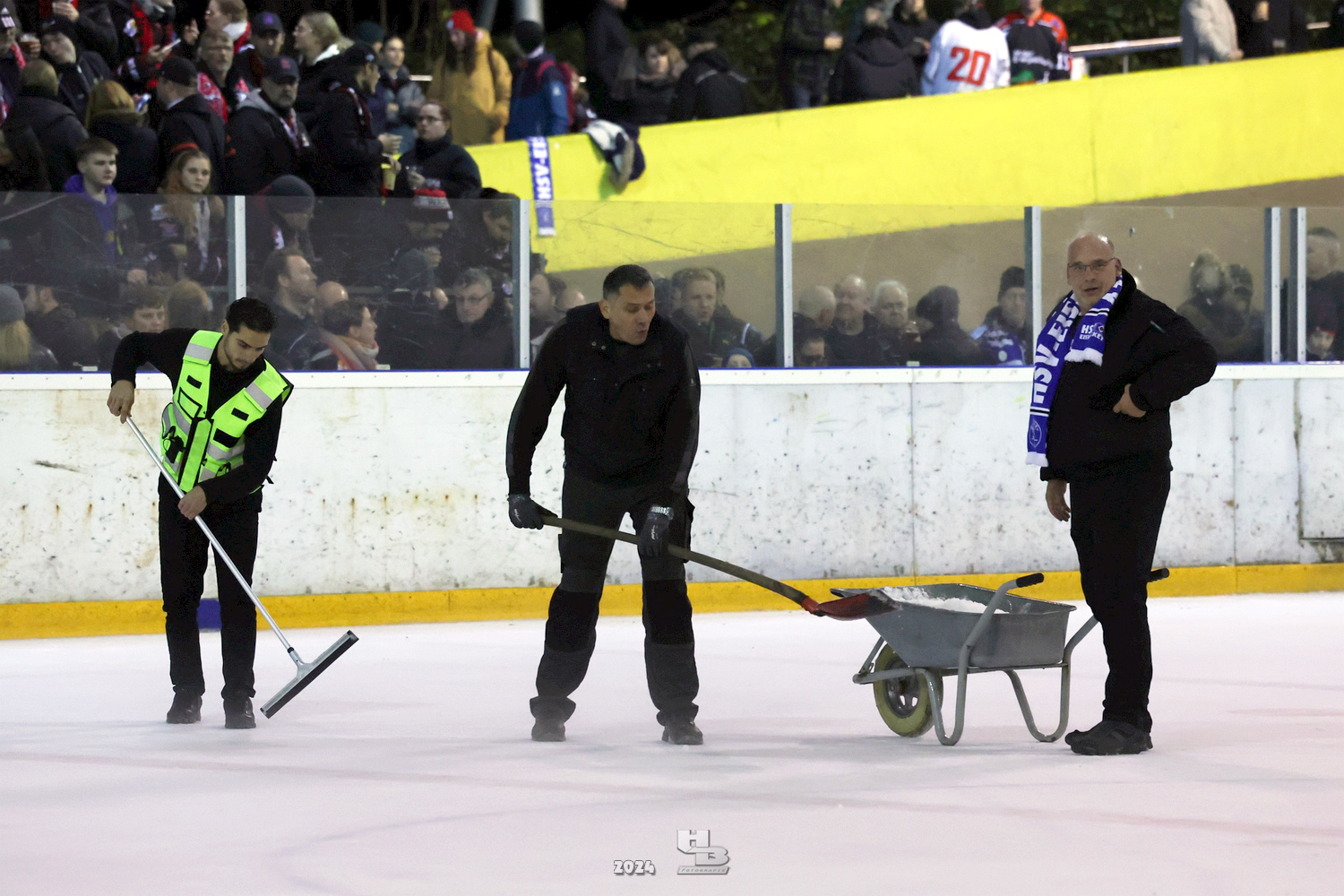 Es war das erwartet spannende Spiel, in dem sich beide Mannschaften nichts schenkten. Im ersten Drittel war es Maksym Andriienko, der in der 16. Minute das 0:1 für die Crocodiles erzielte. Die Stimmung unter den mitgereisten Fans war riesig. Nach dem Tor und dem Pfiff zur 1. Pause freute man sich auf ein weiteres spannendes Spiel. Als nun die Eismaschine aufs Eis fuhr, wurde schnell klar, dass hier etwas nicht stimmte. Eine rote Spur zeichnete sich hinter der Maschine ab. Der Hydraulikschlauch der Eismaschine war geplatzt und konnte nicht mehr verwendet werden. Die Helfer vor Ort versuchten alles, um das Eis wieder halbwegs in Ordnung zu bringen.