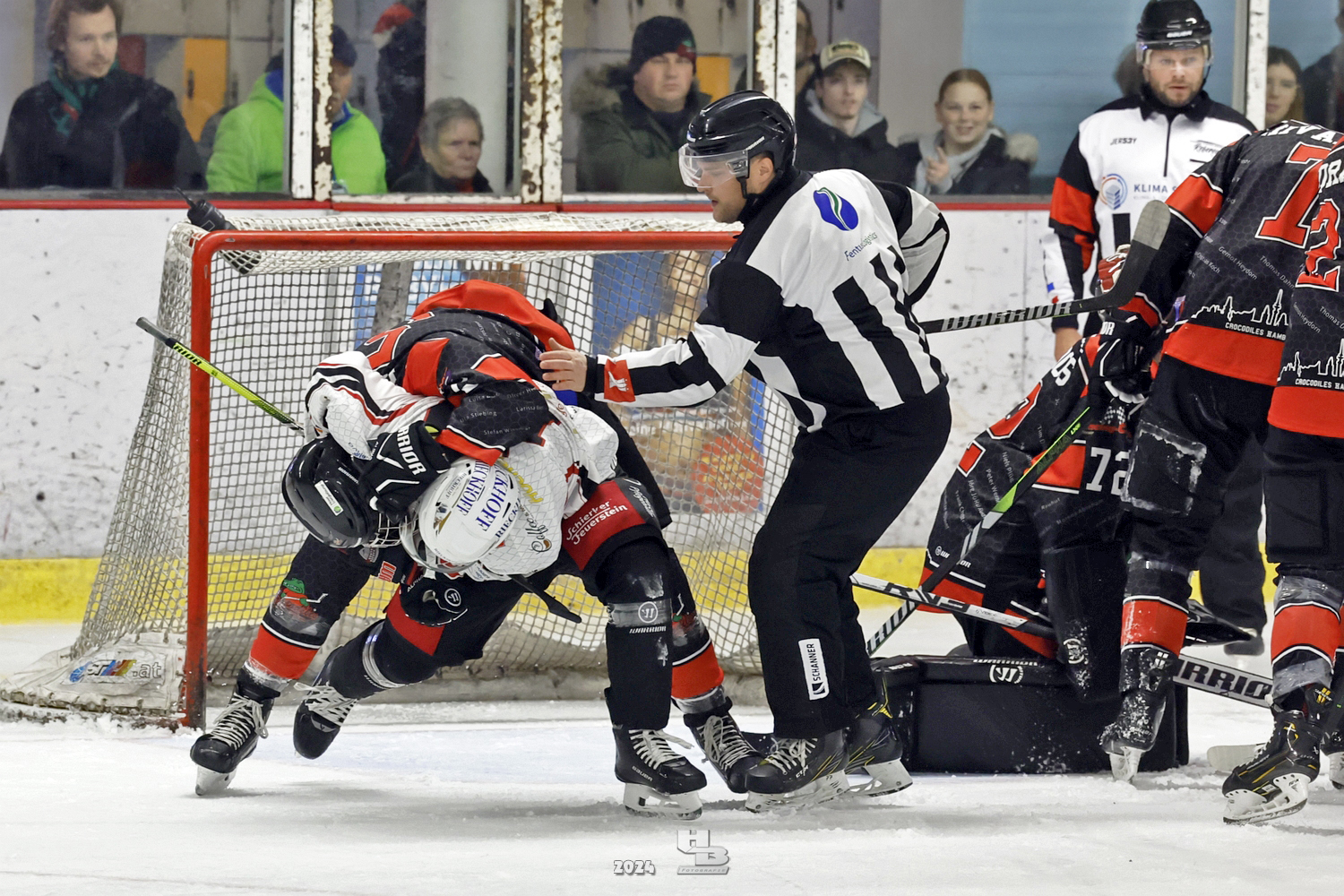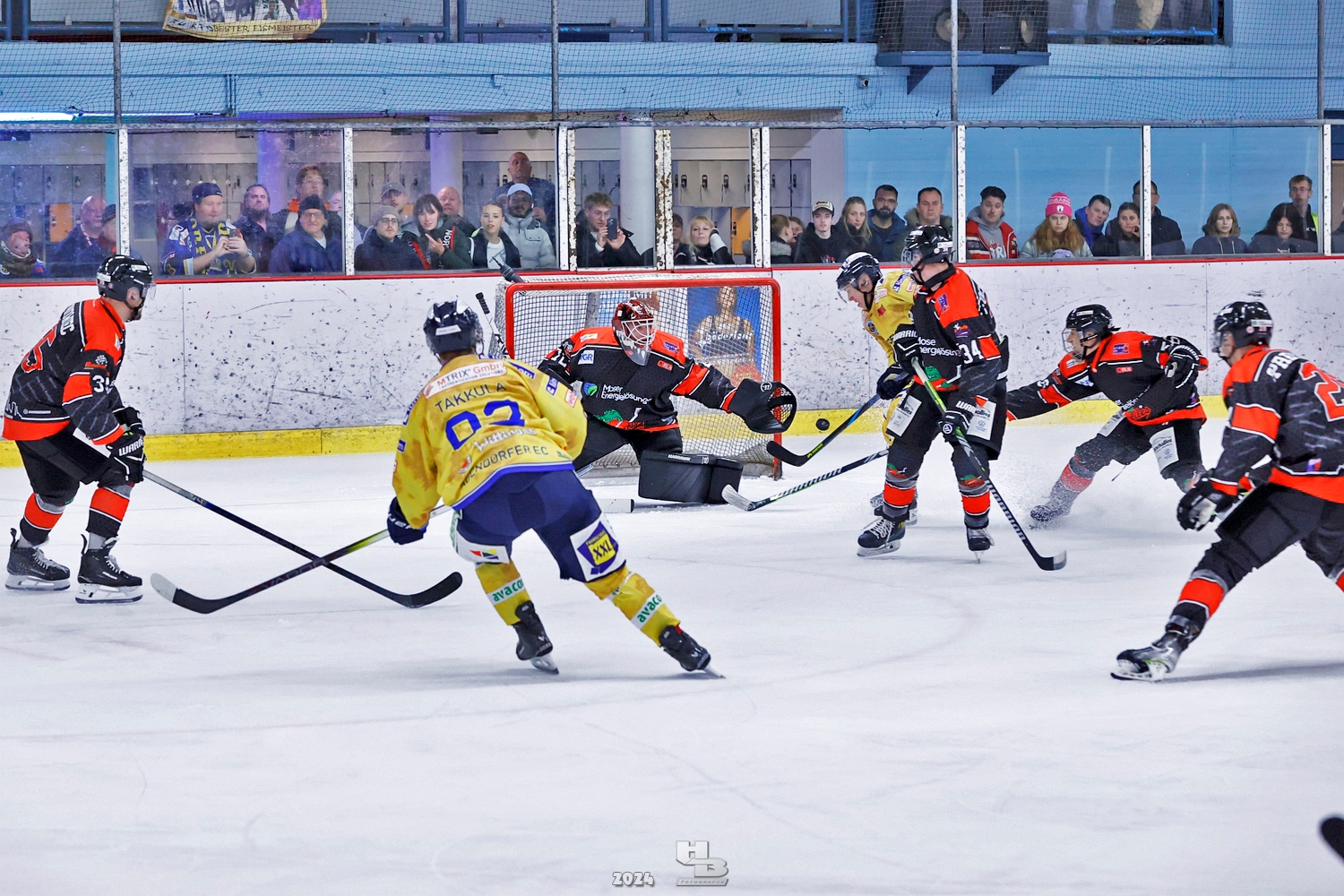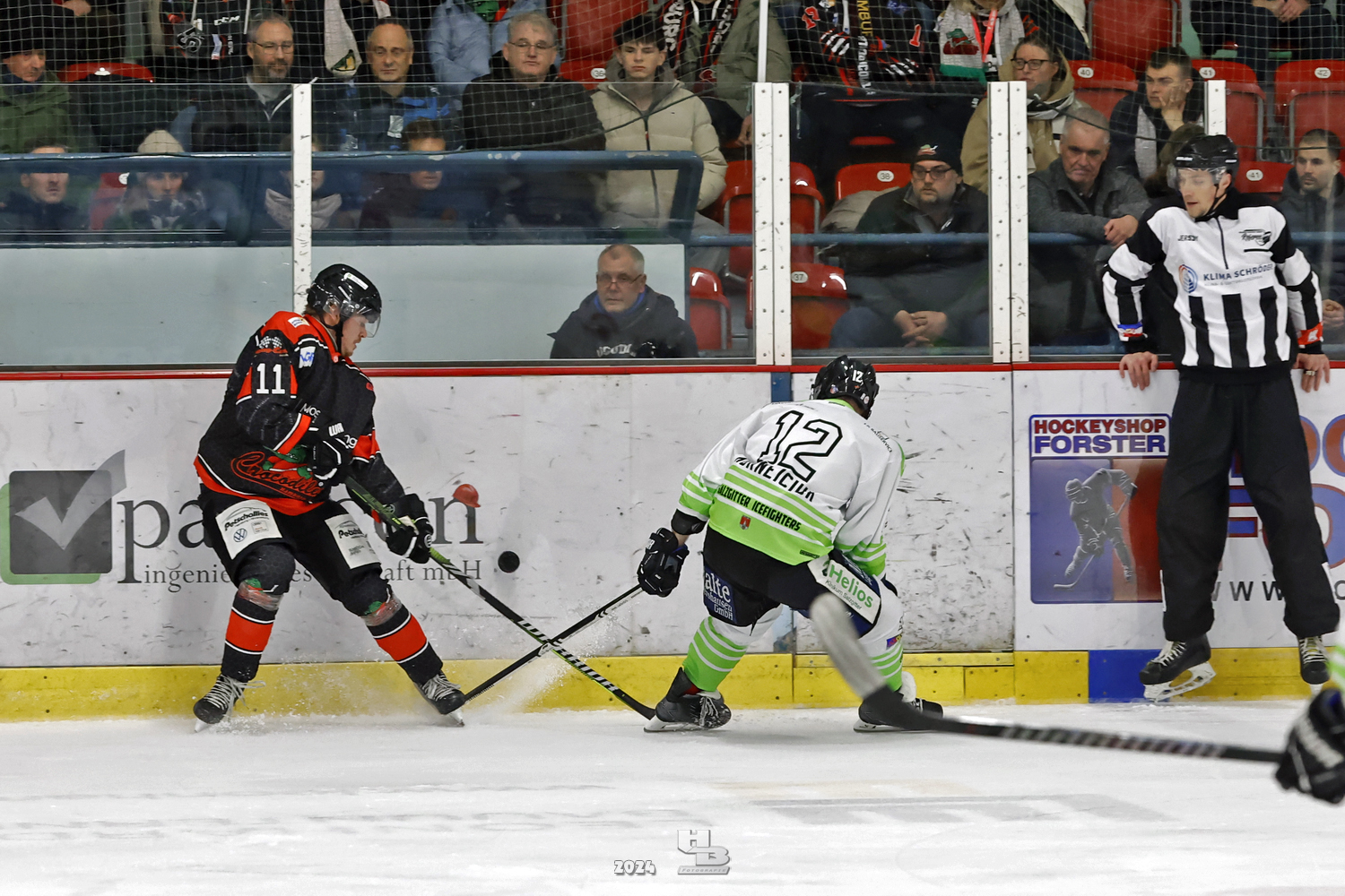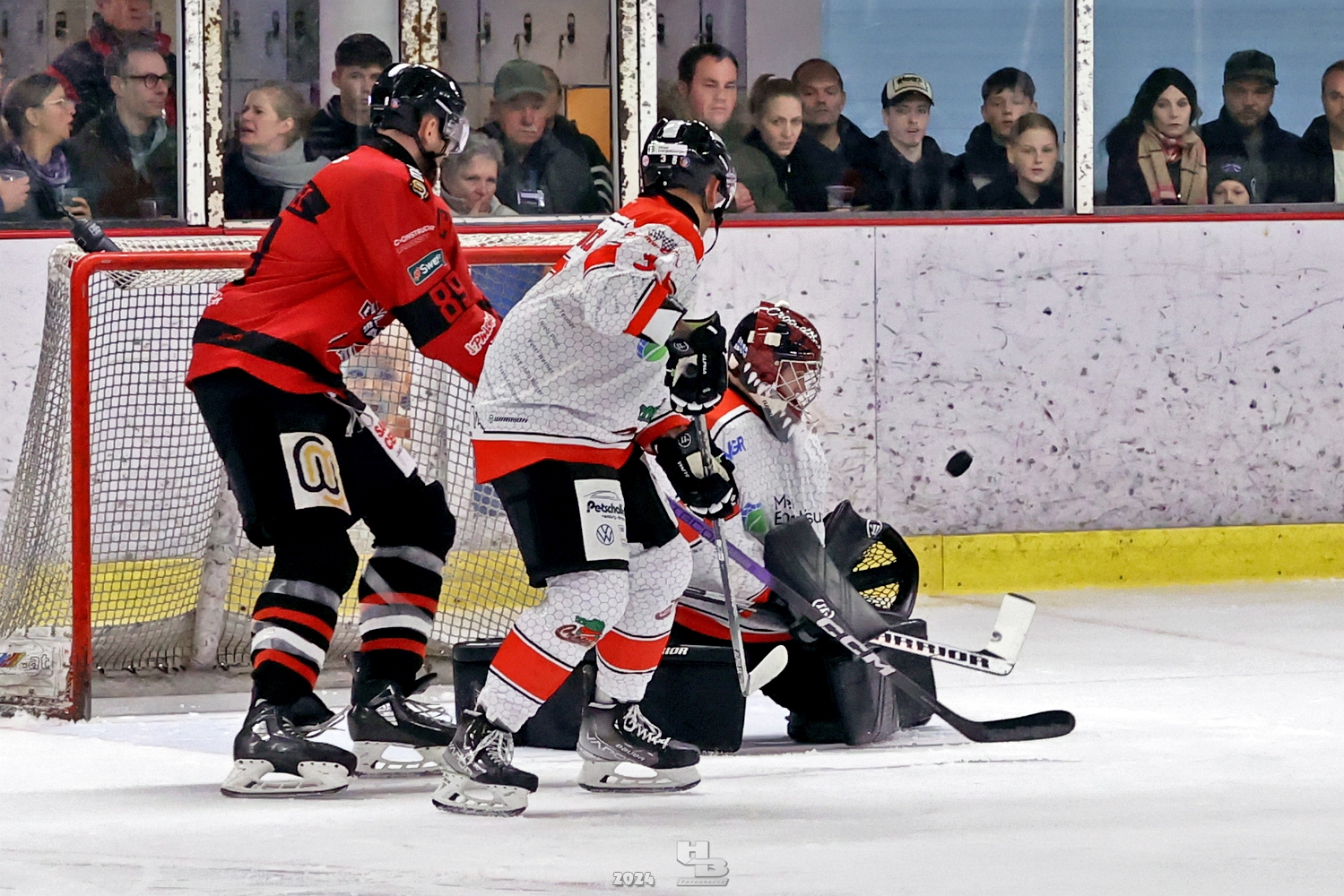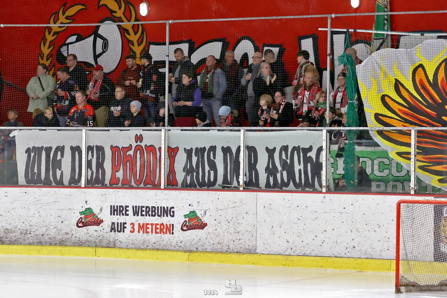 Es war das erwartet spannende Spiel, in dem sich beide Mannschaften nichts schenkten. Im ersten Drittel war es Maksym Andriienko, der in der 16. Minute das 0:1 für die Crocodiles erzielte. Die Stimmung unter den mitgereisten Fans war riesig. Nach dem Tor und dem Pfiff zur 1. Pause freute man sich auf ein weiteres spannendes Spiel. Als nun die Eismaschine aufs Eis fuhr, wurde schnell klar, dass hier etwas nicht stimmte. Eine rote Spur zeichnete sich hinter der Maschine ab. Der Hydraulikschlauch der Eismaschine war geplatzt und konnte nicht mehr verwendet werden. Die Helfer vor Ort versuchten alles, um das Eis wieder halbwegs in Ordnung zu bringen.