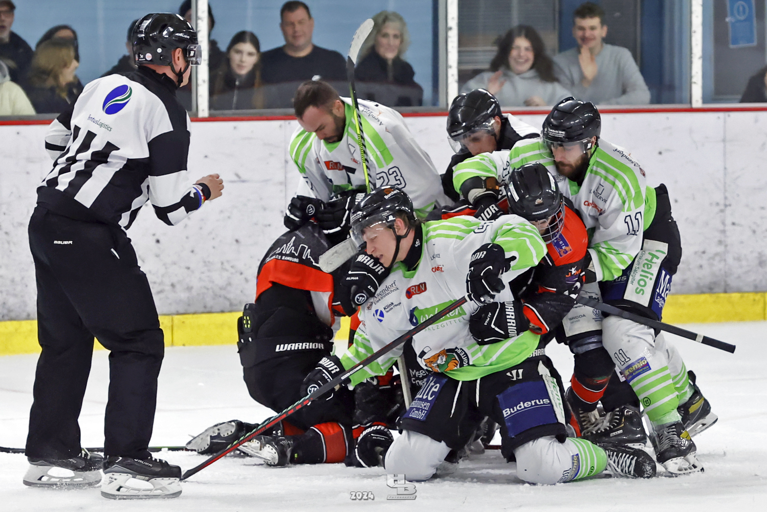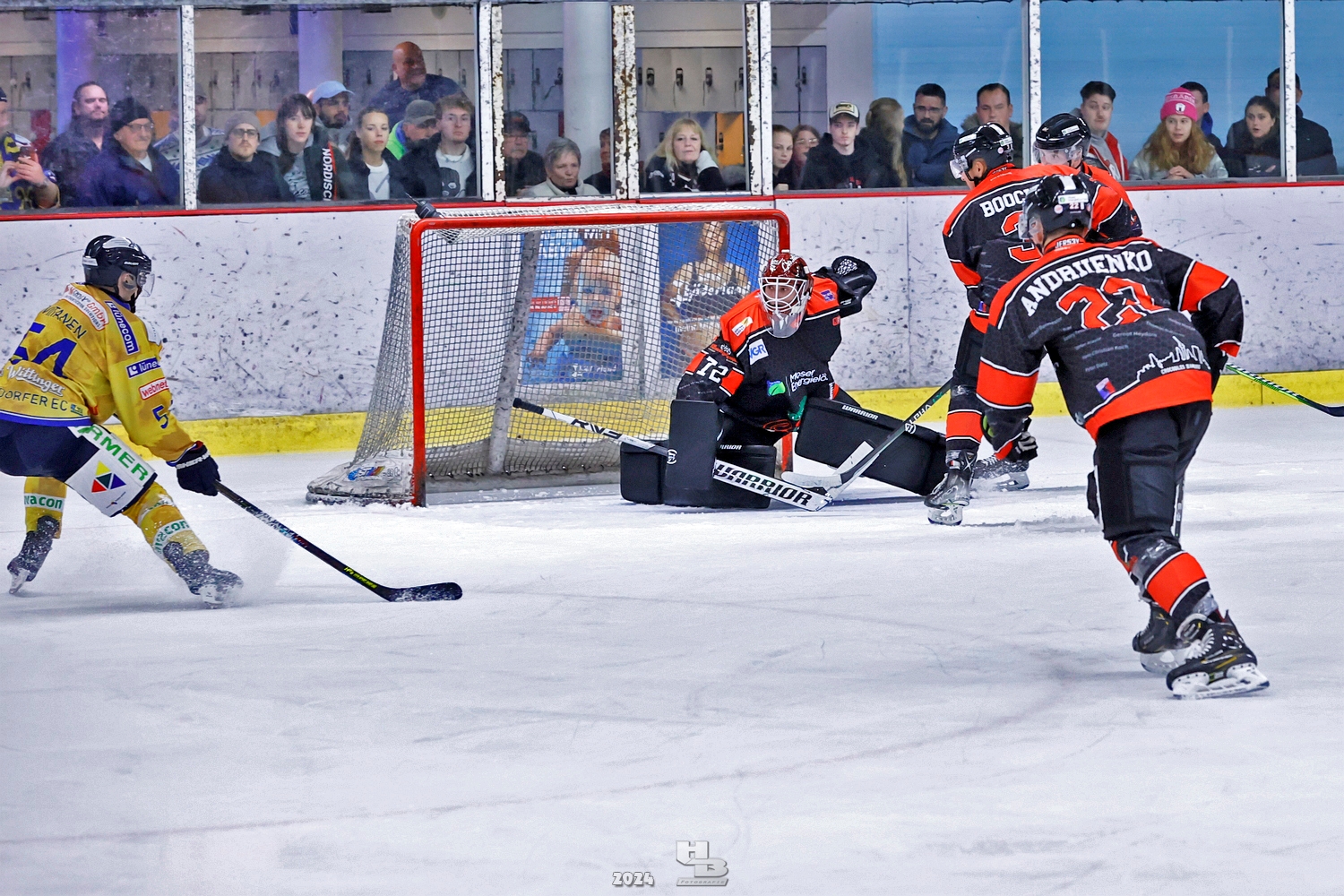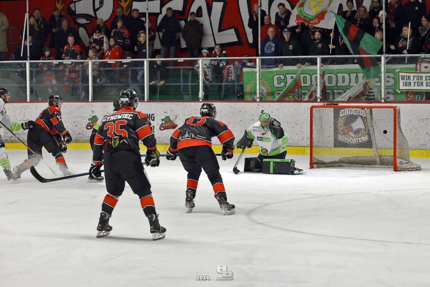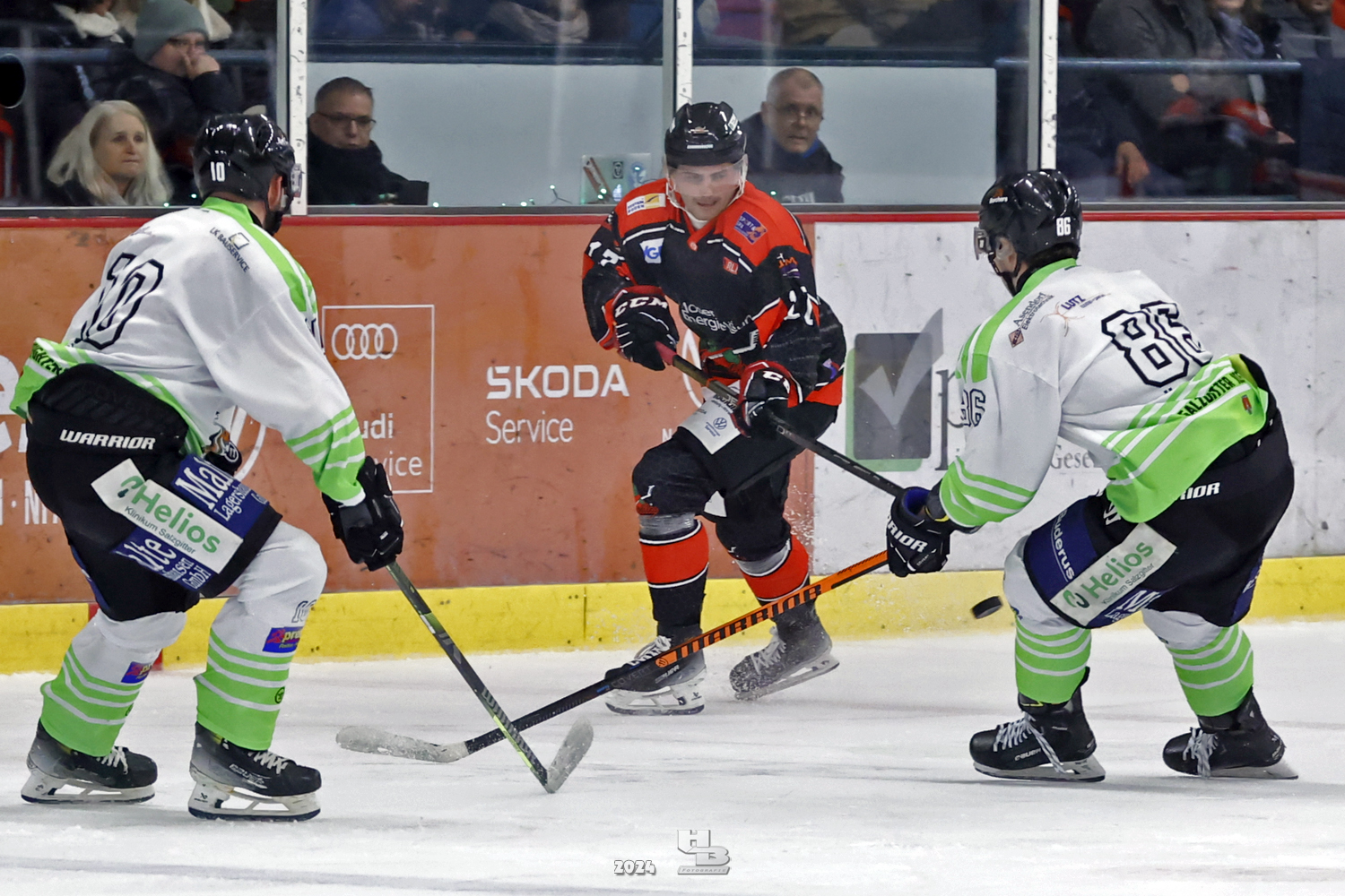 Es war das erwartet spannende Spiel, in dem sich beide Mannschaften nichts schenkten. Im ersten Drittel war es Maksym Andriienko, der in der 16. Minute das 0:1 für die Crocodiles erzielte. Die Stimmung unter den mitgereisten Fans war riesig. Nach dem Tor und dem Pfiff zur 1. Pause freute man sich auf ein weiteres spannendes Spiel. Als nun die Eismaschine aufs Eis fuhr, wurde schnell klar, dass hier etwas nicht stimmte. Eine rote Spur zeichnete sich hinter der Maschine ab. Der Hydraulikschlauch der Eismaschine war geplatzt und konnte nicht mehr verwendet werden. Die Helfer vor Ort versuchten alles, um das Eis wieder halbwegs in Ordnung zu bringen.