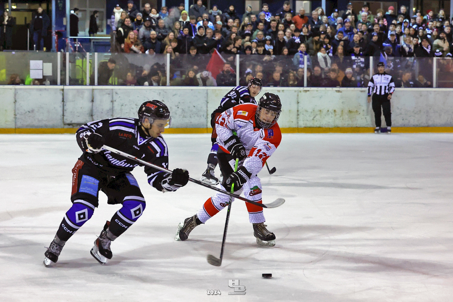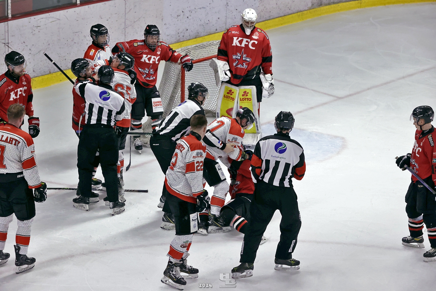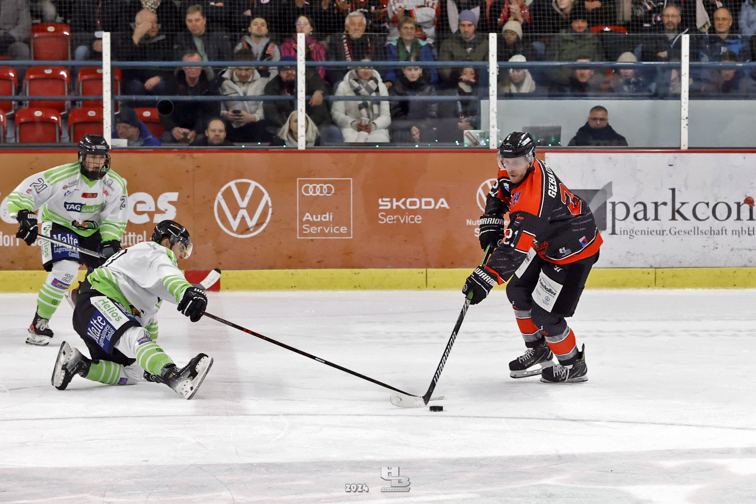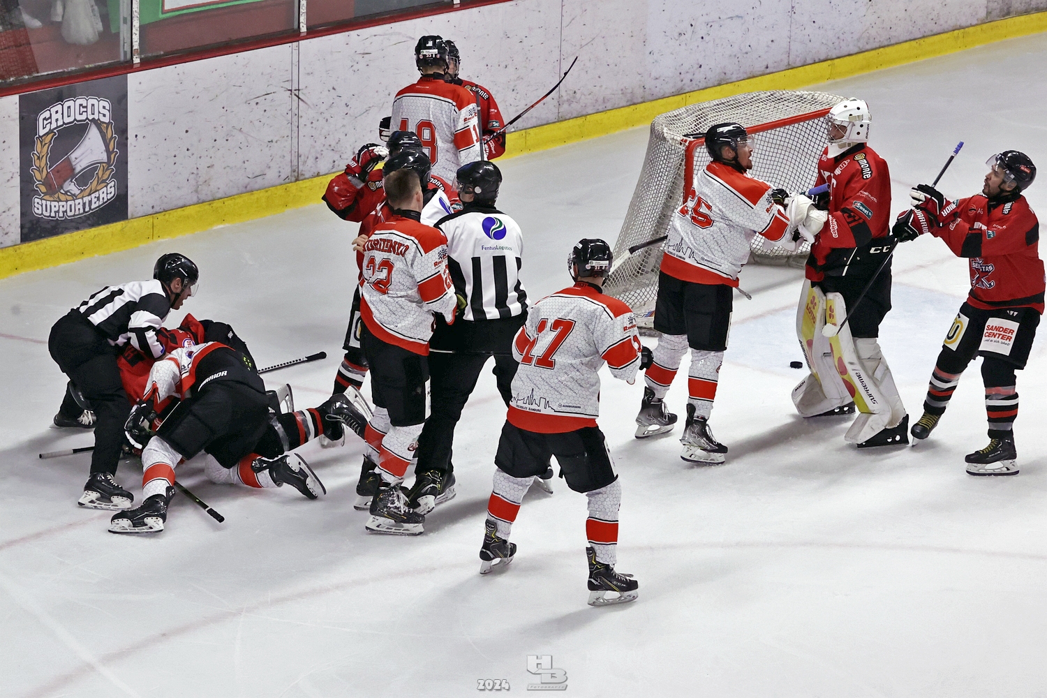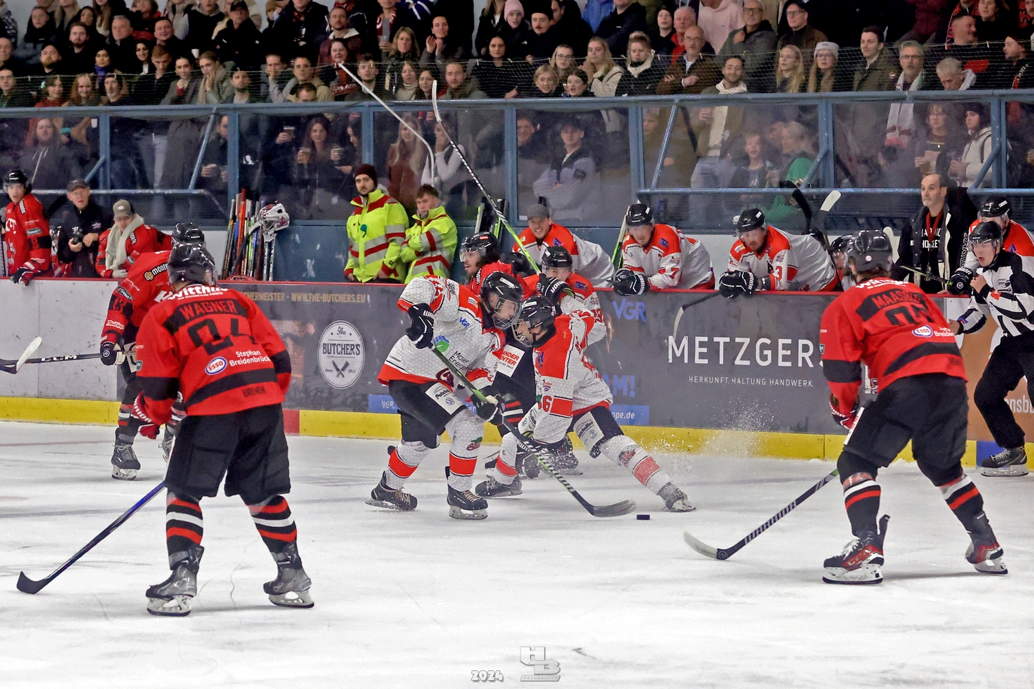 Es war das erwartet spannende Spiel, in dem sich beide Mannschaften nichts schenkten. Im ersten Drittel war es Maksym Andriienko, der in der 16. Minute das 0:1 für die Crocodiles erzielte. Die Stimmung unter den mitgereisten Fans war riesig. Nach dem Tor und dem Pfiff zur 1. Pause freute man sich auf ein weiteres spannendes Spiel. Als nun die Eismaschine aufs Eis fuhr, wurde schnell klar, dass hier etwas nicht stimmte. Eine rote Spur zeichnete sich hinter der Maschine ab. Der Hydraulikschlauch der Eismaschine war geplatzt und konnte nicht mehr verwendet werden. Die Helfer vor Ort versuchten alles, um das Eis wieder halbwegs in Ordnung zu bringen.