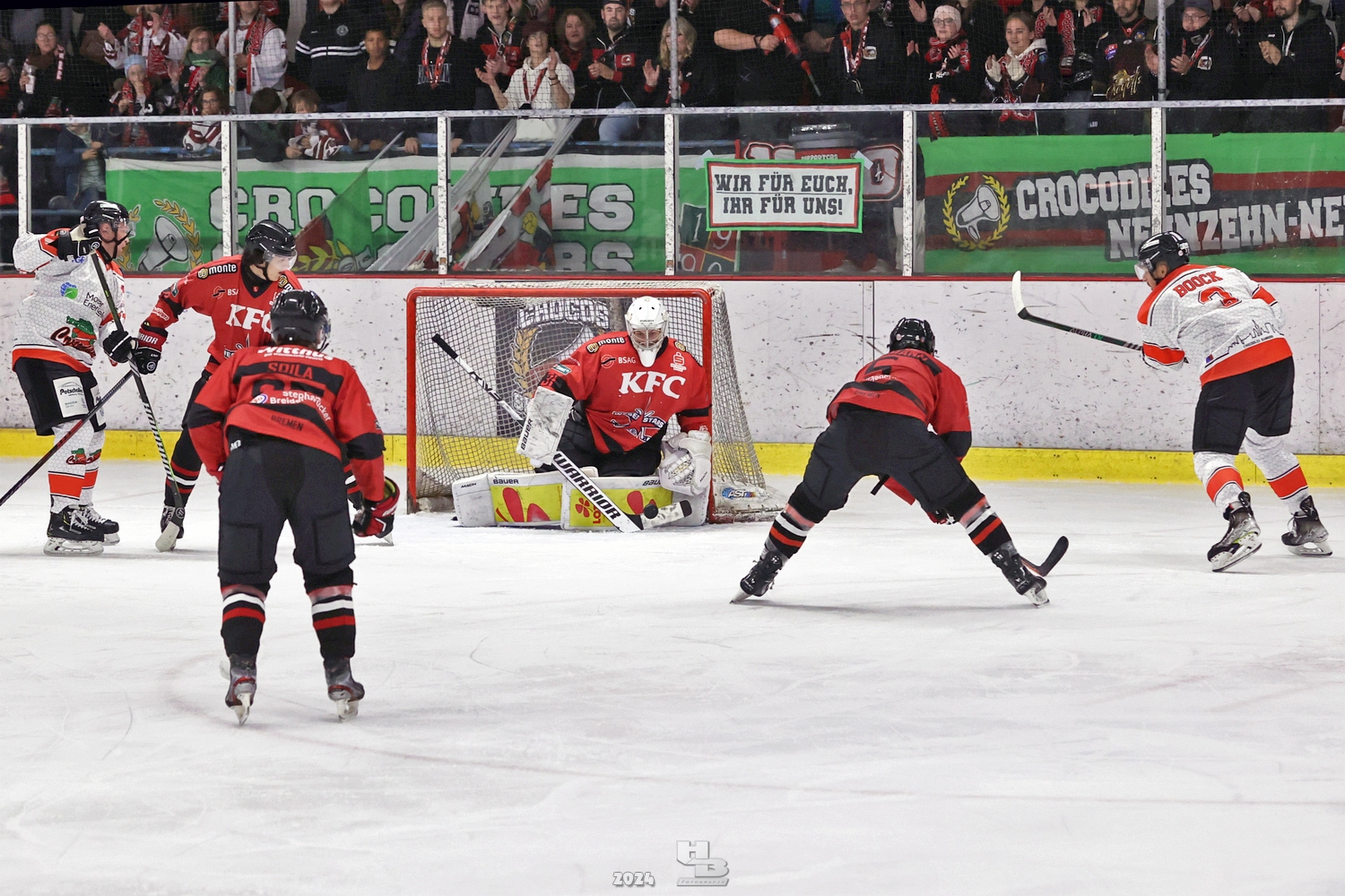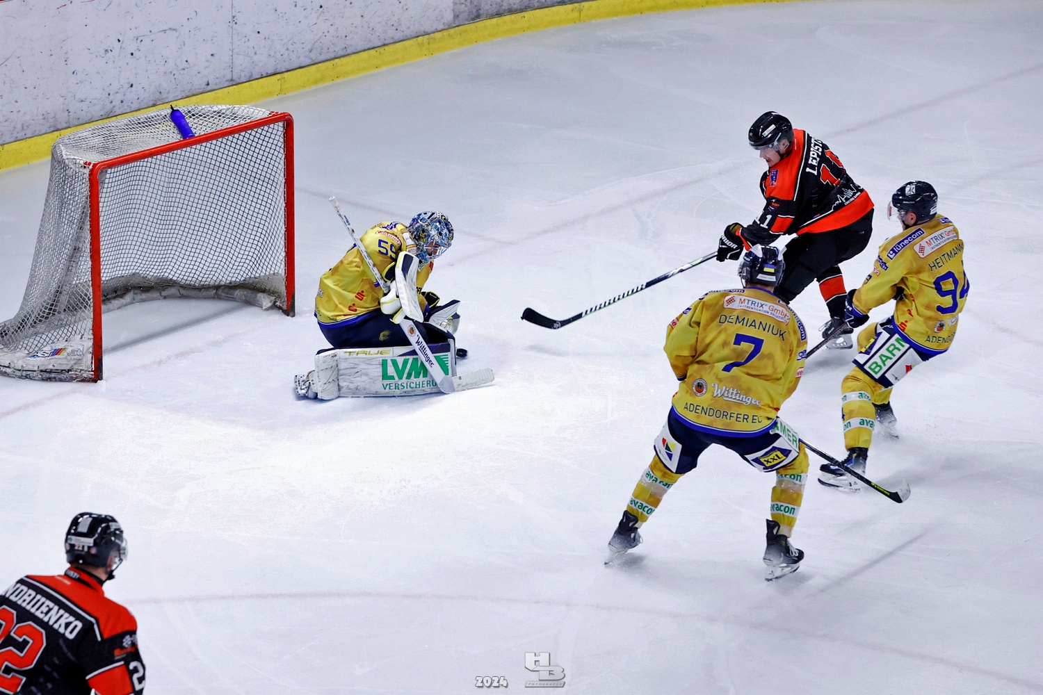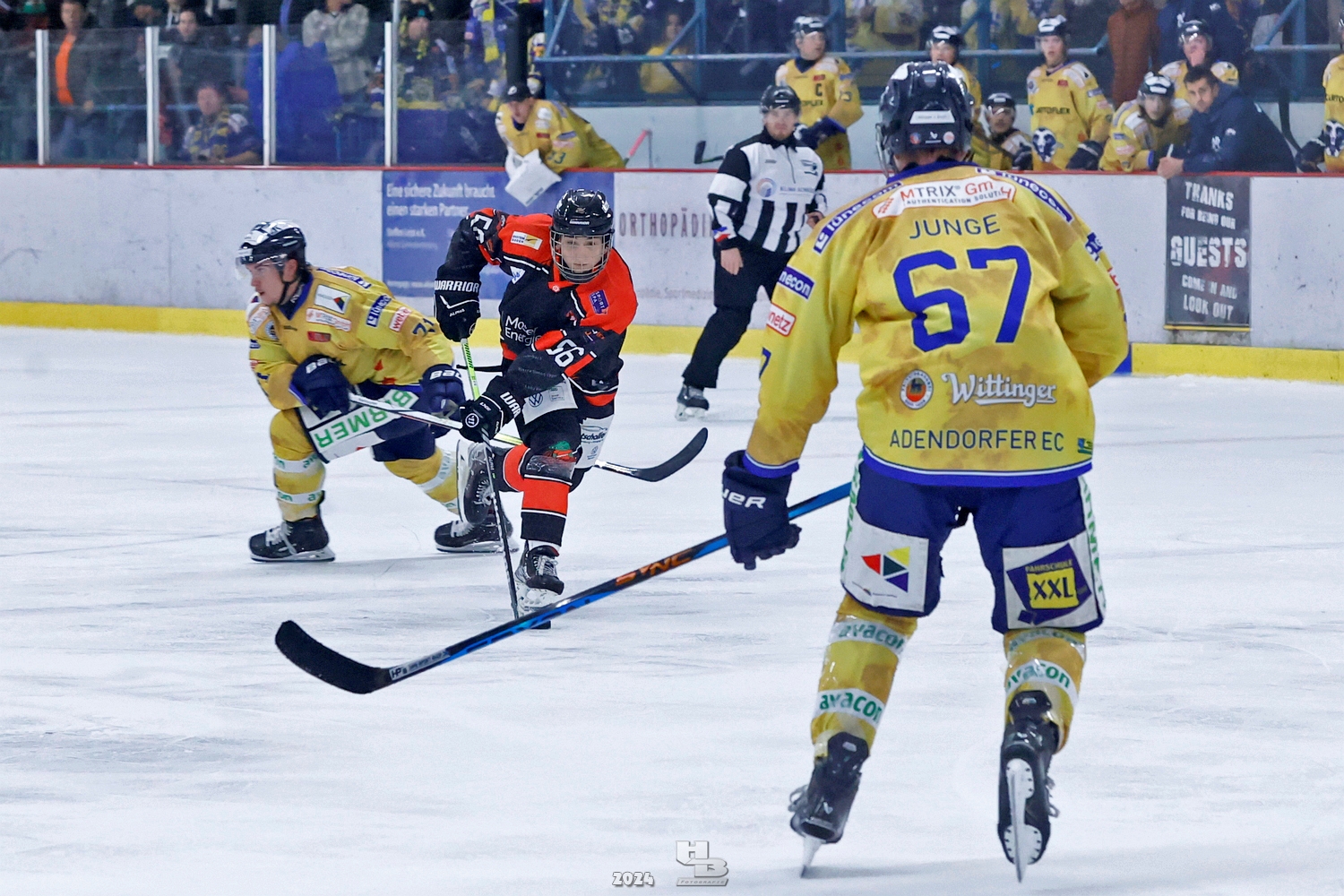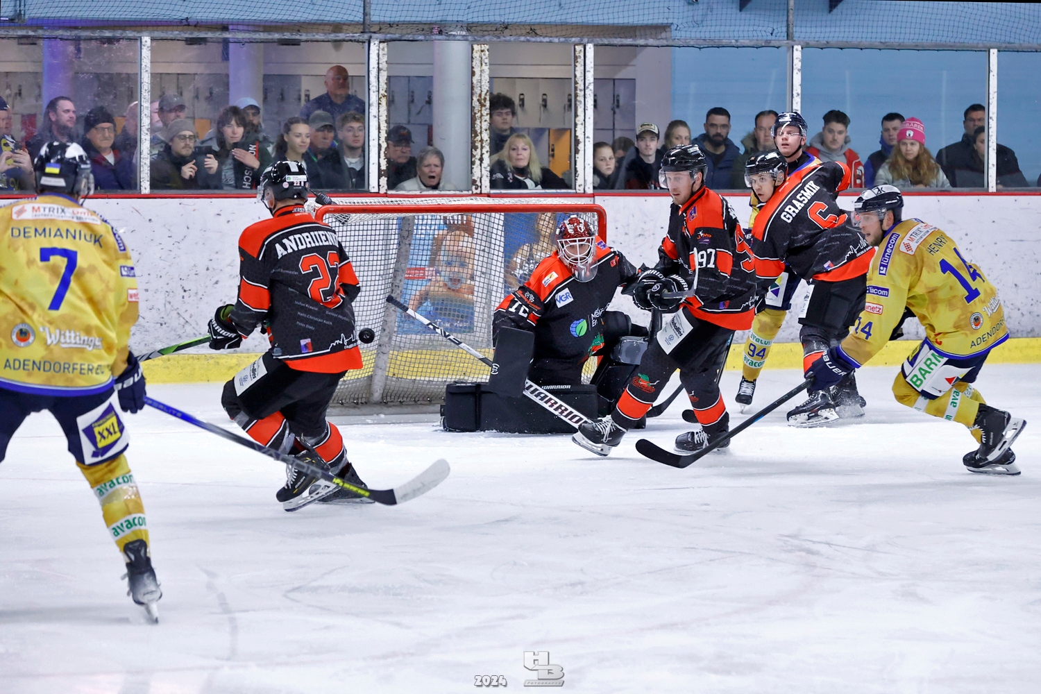 Im dritten Drittel kam es dann in der 54. Minute zu einer längeren Unterbrechung, da der Kehlkopfschutz der Adendorfer Torhüter nicht Regelkonform sein sollte. So musste Adendorf einige Minuten ohne Torhüter auskommen, durften aber als Ersatz einen weiteren Feldspieler auf dass Eis bringen. Die Crocodiles nutzten diese Chance und so war es Maksym Andriienko, der zum 2:2 ausgleichen konnte. Die Crocodiles spielten sich dann in die Overtime. In der Zwischenzeit bastelte man bei Adendorf einen Kehlkopfschutz für den Torhüter, so das dieser wieder dabei war und es war dann Lauri Viitanen der in der Overtime den 2:3 Siegtreffer für Adendorf erzielte.