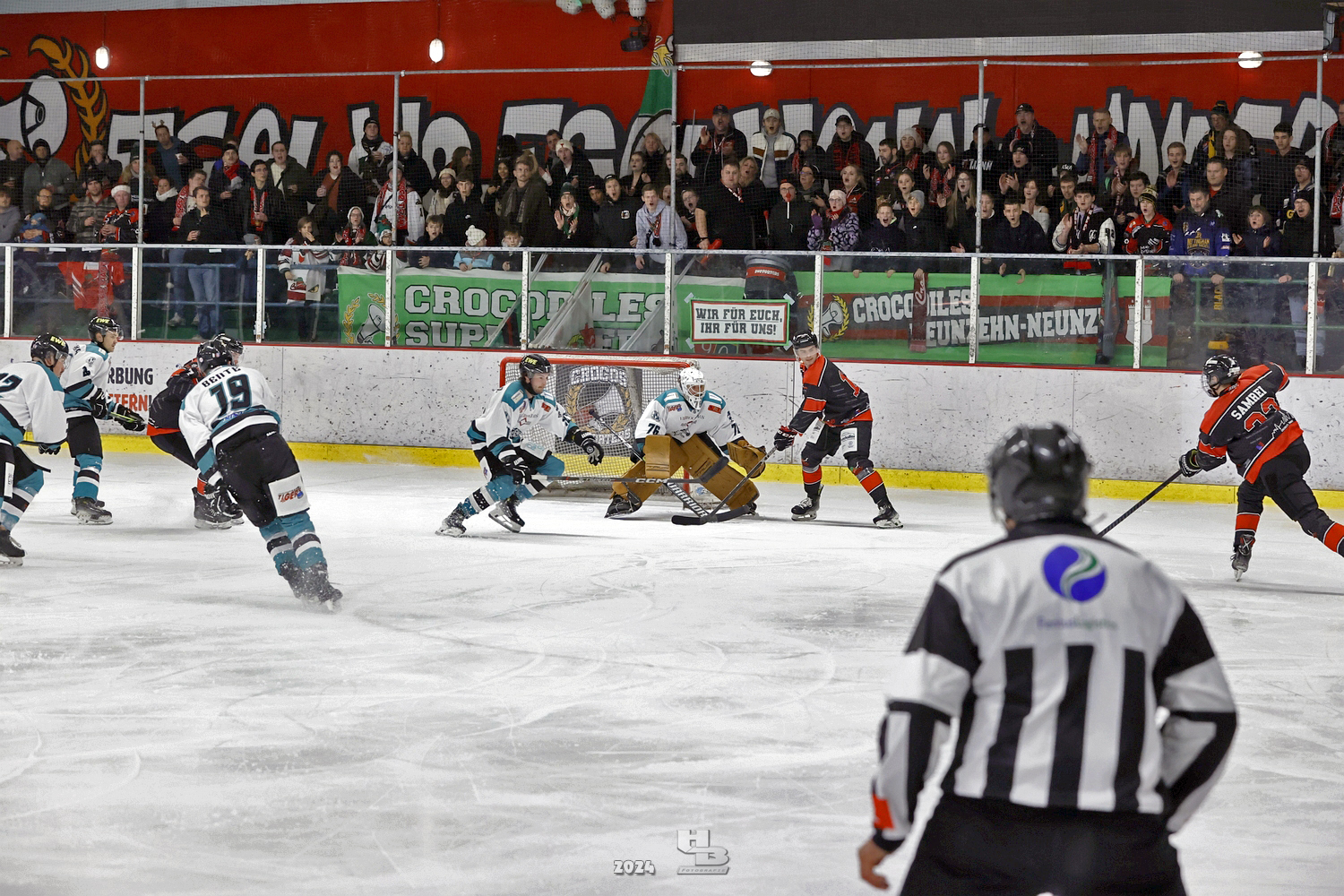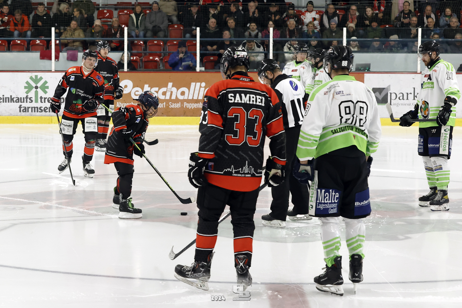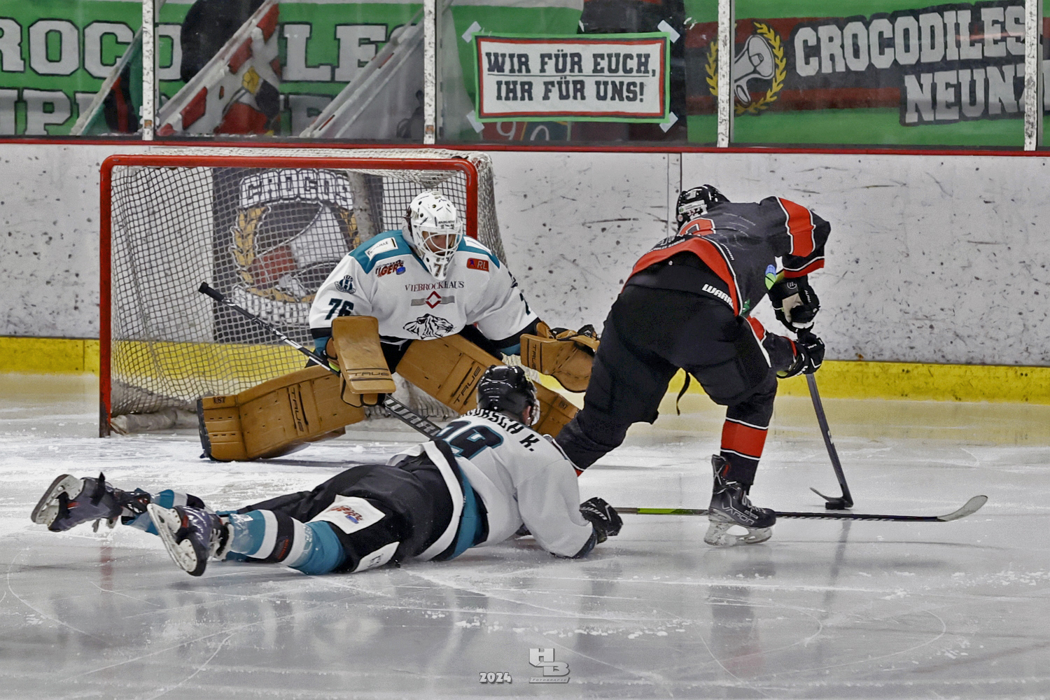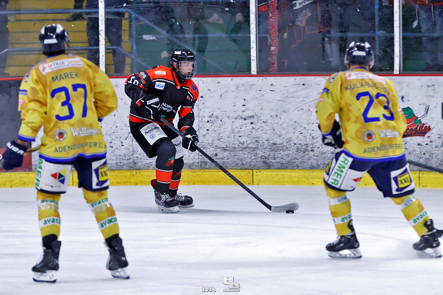 Im dritten Drittel kam es dann in der 54. Minute zu einer längeren Unterbrechung, da der Kehlkopfschutz der Adendorfer Torhüter nicht Regelkonform sein sollte. So musste Adendorf einige Minuten ohne Torhüter auskommen, durften aber als Ersatz einen weiteren Feldspieler auf dass Eis bringen. Die Crocodiles nutzten diese Chance und so war es Maksym Andriienko, der zum 2:2 ausgleichen konnte. Die Crocodiles spielten sich dann in die Overtime. In der Zwischenzeit bastelte man bei Adendorf einen Kehlkopfschutz für den Torhüter, so das dieser wieder dabei war und es war dann Lauri Viitanen der in der Overtime den 2:3 Siegtreffer für Adendorf erzielte.
