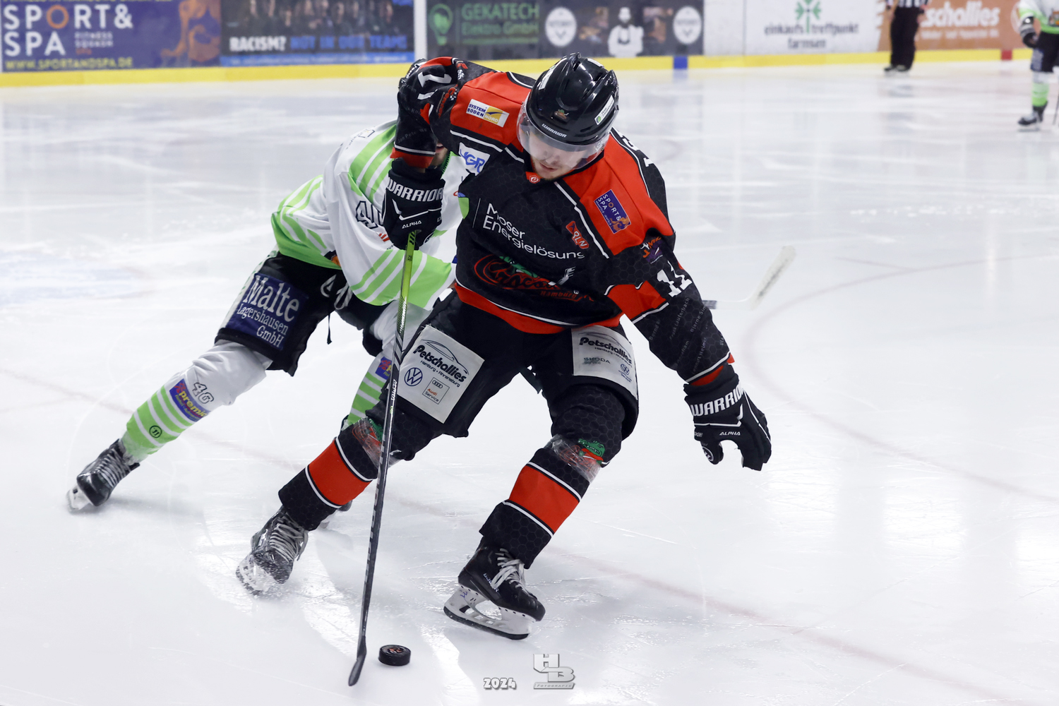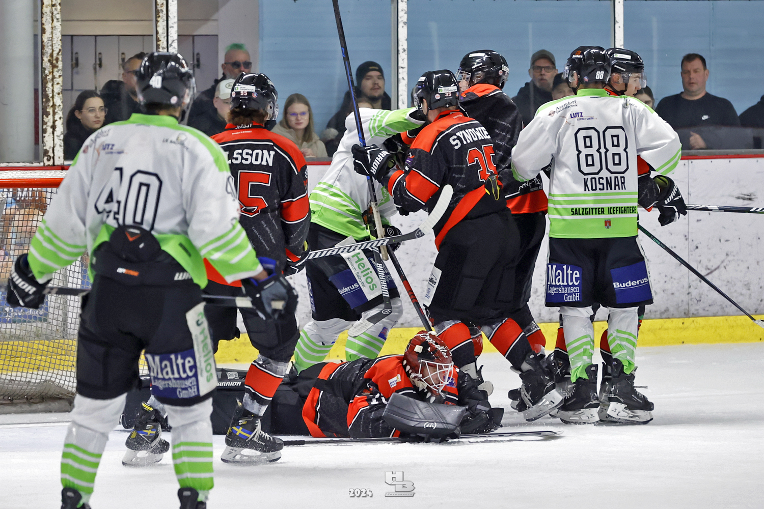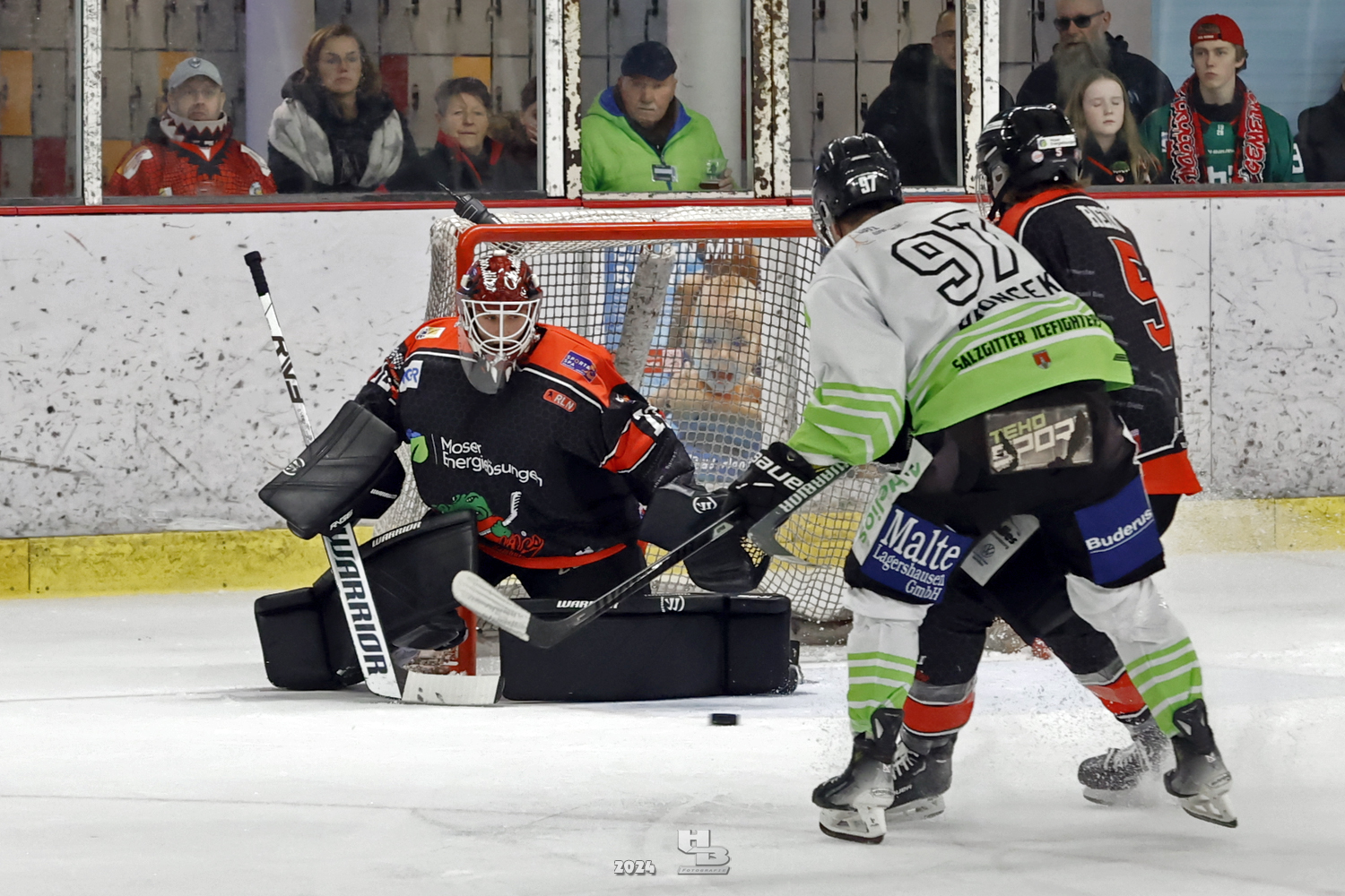 Doch kommen wir zum Spiel gegen die Salzgitter Icefighters. Von Anfang an war klar, dass es ein ruppiges Spiel werden würde. In der 4. Minute musste Salzgitter als erstes Team auf die Strafbank. Im folgenden Powerplay dauerte es eine gute Minute, bis Miguel Boock auf Vorlage von Matej Morong und Timi Liivalahti zur 1:0-Führung traf. Kurz vor Ende des ersten Drittels klingelte es erneut im Tor der Salzgitteraner, als Markus Lepistö mit einem schönen Schuss den Puck im Tor versenkte. Mit dieser 2:0 Führung ging es in die erste Pause.